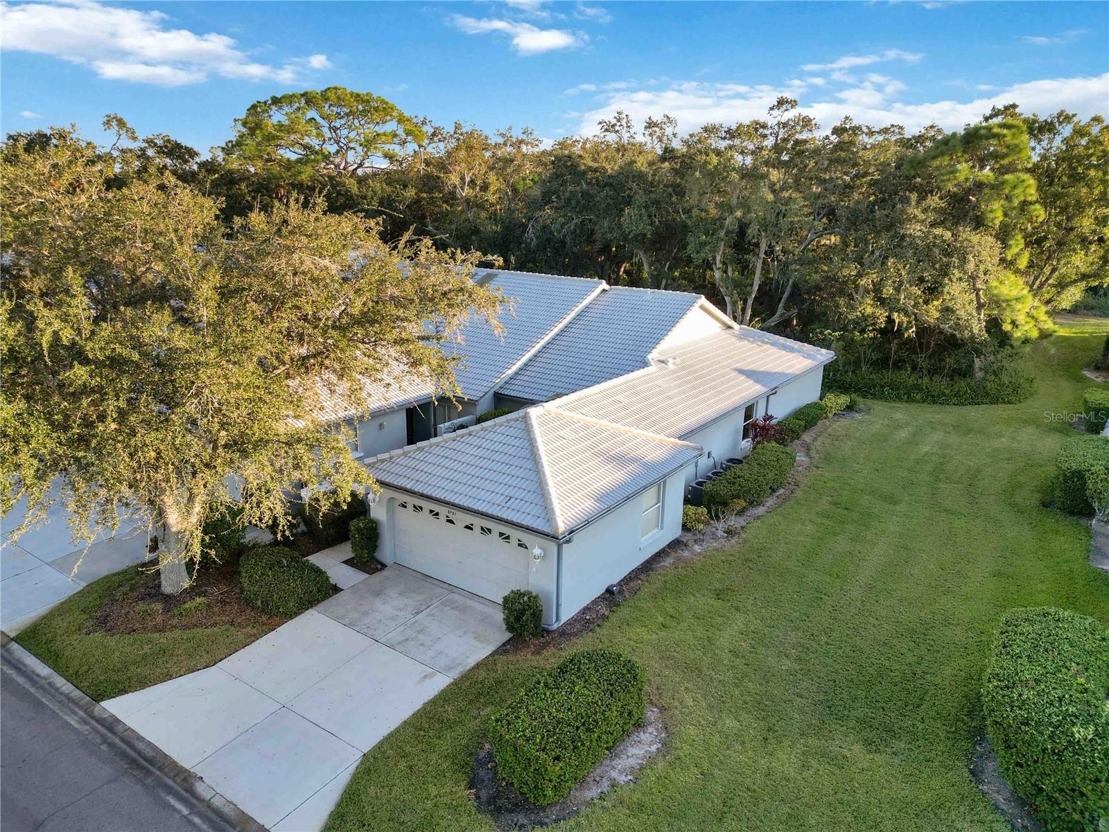 Welcome to Casa de Sol, where comfort, privacy, and easy Florida living come together in one of the community’s most desirable settings. This beautifully maintained 2-bedroom, 2-bath end-unit villa offers a thoughtful layout and serene surroundings, backing to a beautifully treed conservation area for a peaceful and private backyard. The spacious primary suite features a walk-in closet, vaulted ceiling and a private en suite. The fully enclosed porch overlooks lush, abundant foliage, creating a tranquil extension of the living space. One of the largest front courtyards in the community enhances the home’s outdoor appeal and privacy. Additional highlights include hurricane shutters, a two-car garage with ample storage, and a partially furnished interior with a fully equipped kitchen, making this residence truly move-in ready. Casa de Sol is a non-age-restricted community offering resort-style amenities, including a clubhouse with fitness center, community pool, tennis courts and scenic walking paths along the lakes. Whether you’re seeking a full-time residence or a seasonal retreat, this inviting villa delivers comfort, versatility, and peace of mind in a beautiful, amenity-rich setting.