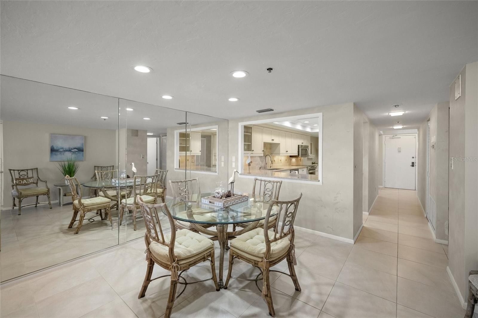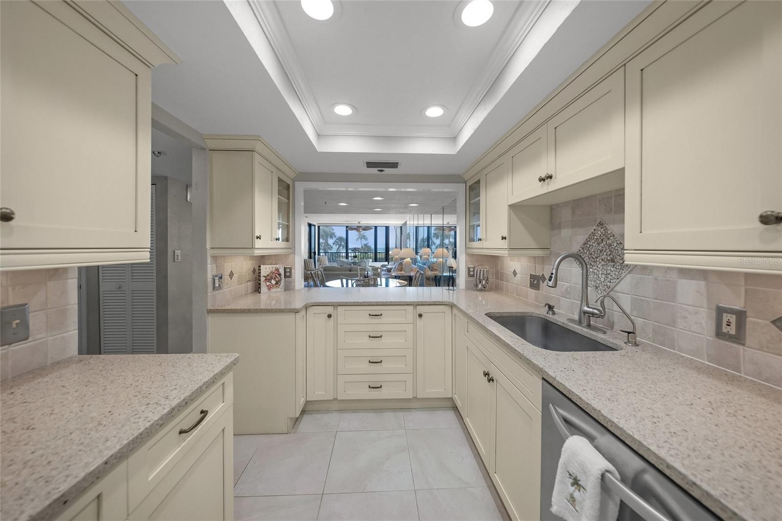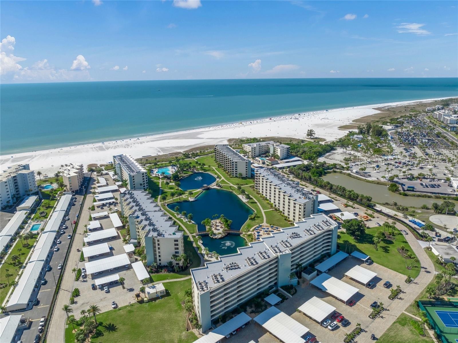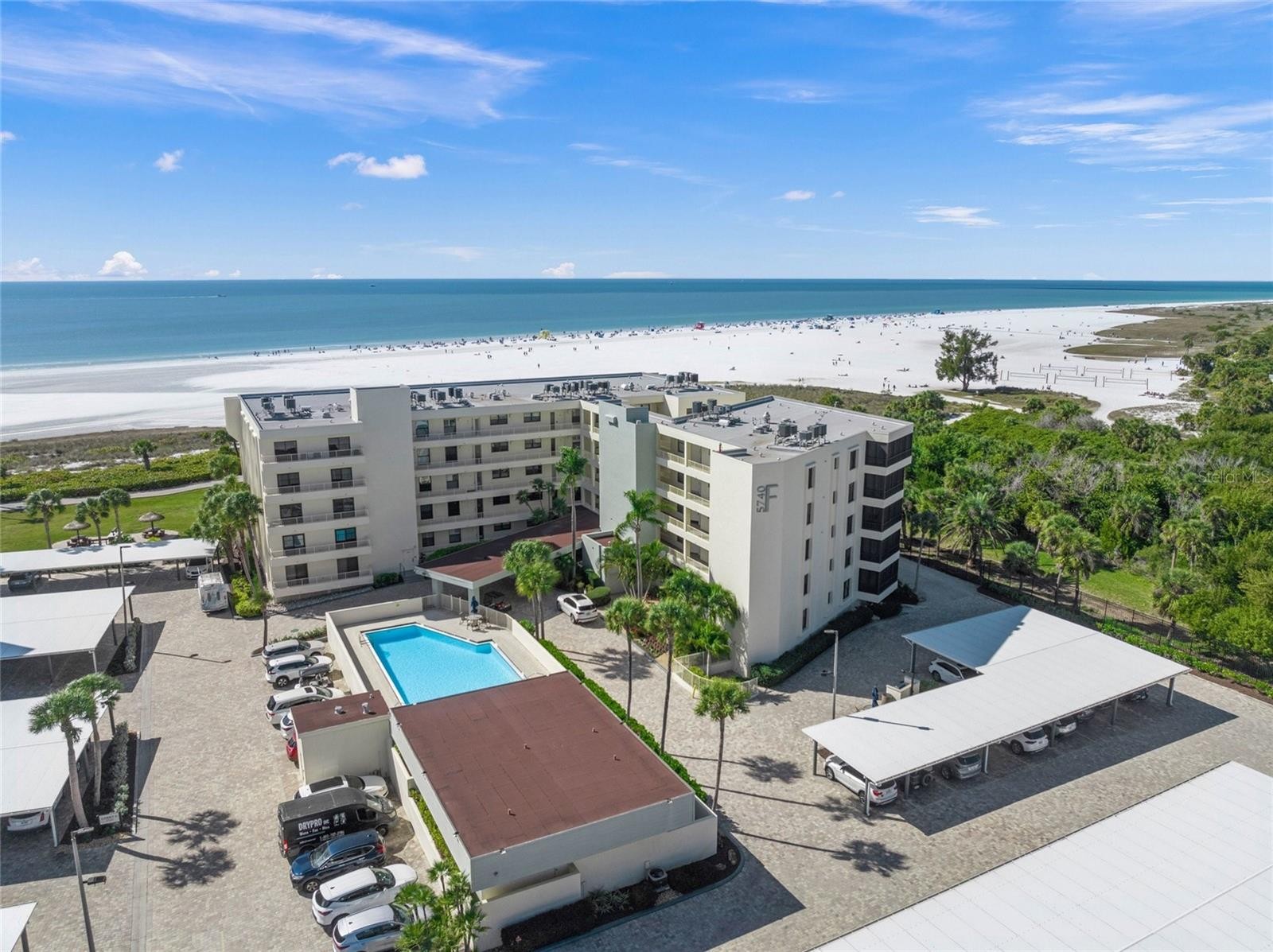 Incredible Gulf-front first-floor residence (10’ elevation) within the amenity-rich 32-acre campus of the Gulf & Bay community on Siesta Key. This 2-bedroom, 2-bath condominium is ideally positioned in the highly desirable F Building and offers direct walk-out access to the beach with unobstructed views of 800 feet of private shoreline and the expansive Gulf of Mexico. Just steps from the sand, this exceptional location delivers the ultimate Gulf & Bay lifestyle—blending convenience, privacy, and breathtaking coastal scenery. This unit did not flood during recent storms. The remodeled kitchen features abundant cabinetry, a beverage cooler, and a comfortable eat-in area with a built-in desk. The primary suite captures beautiful Gulf views and includes a walk-in closet plus an additional wall closet. The en-suite bath has been tastefully remodeled with a frameless travertine shower, dual vanities, and a dedicated makeup area. The spacious guest bedroom offers two full Murphy beds, providing flexible sleeping accommodations. Additional highlights include a new A/C system (2025), 20" x 20" tile throughout the main living areas, and smooth ceilings—no popcorn. Gulf & Bay is truly one of the best resort complexes on Siesta key featuring: 2 clubhouses, 3 heated pools, pickleball courts, tennis courts (1 HarTru), well equipped fitness center, hot tub, multiple grill areas all leading out to World Famous, gorgeous Siesta Key Beach!