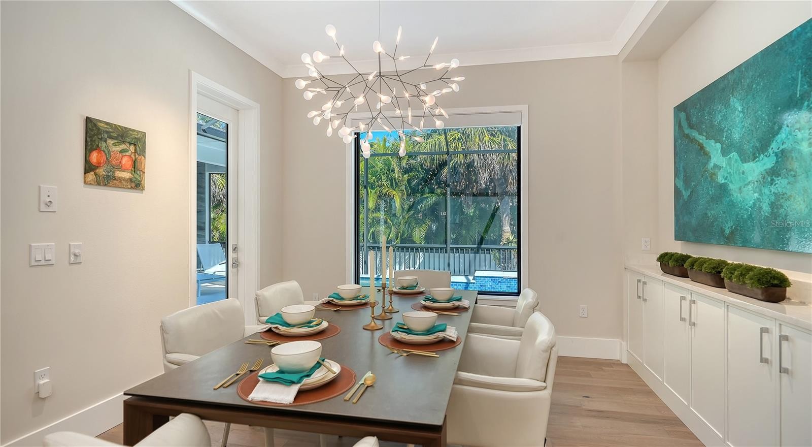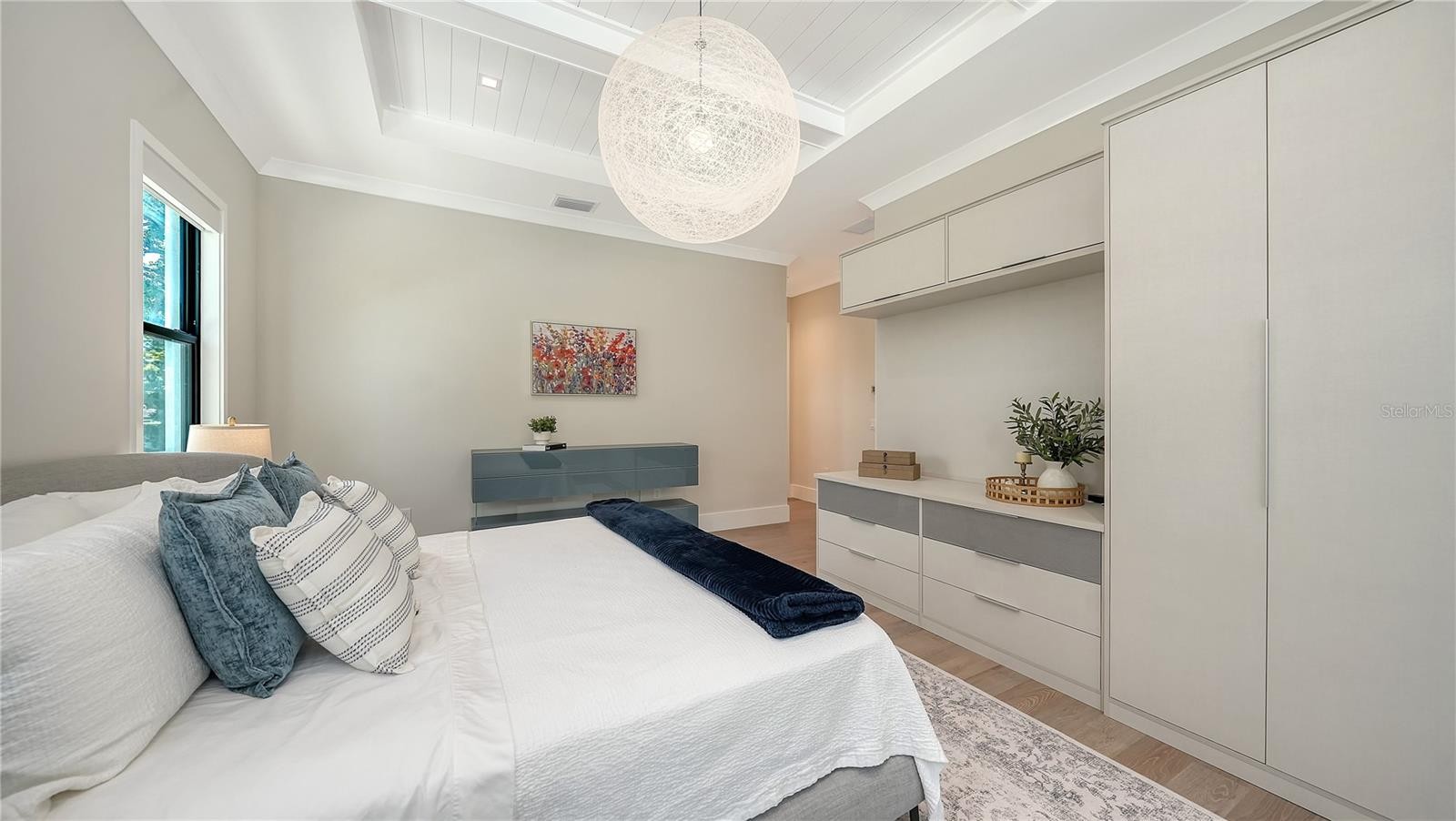Set within the prestigious island community of Bird Key, this furnished and newly completed custom-built residence (2023) delivers refined coastal living just minutes from Sarasota Bay, St. Armands Circle, and downtown Sarasota. Spanning nearly 4,000 square feet of interior space, the thoughtfully designed two-story layout offers four en-suite bedrooms, a library/media room, den, and 5½ baths, with a shaft in place for a future elevator. The great room serves as the heart of the contemporary home, showcasing European oak hardwood flooring throughout, soaring cathedral ceilings reaching over 21 feet, solid wood beams, and coffered architectural detail. A stone-encased fireplace anchors the space, while walls of impact-rated pocketing glass sliders open directly to the covered patio and outdoor living area, creating a seamless indoor-outdoor flow. Custom built-ins with wainscoting and illuminated display niches provide ideal space for art and decor. The kitchen is designed for both daily living and entertaining, featuring an oversized quartz waterfall island, custom cabinetry with under-cabinet lighting, tile backsplash, walk-in pantry, pot filler, and Wolf and Sub-Zero appliances. Adjacent dining area includes a built-in buffet and direct patio access for effortless hosting. The primary suite is located on the main level, offering pool views, extensive built-ins, and a spa-inspired bath with quartz surfaces, soaking tub, and a walk-in shower with multiple showerheads. A second en-suite bedroom on the first floor—currently used as a fitness room—adds flexibility, along with a dedicated den, laundry room, and a library/media room with custom built-ins and en-suite pool bath access. Upstairs, a spacious loft opens to a private balcony with glass railing, currently used as office space. Two additional guest bedroom suites occupy this level, including one with a walk-in closet. Outdoor living is complete with a fully equipped summer kitchen, covered dining area, stone accent wall, heated saltwater pool with PebbleTec finish, sun shelf, and raised spa. Additional highlights include EnergyStar insulated impact windows and doors, central vacuum, contemporary lighting, three-car garage with epoxy floors, and insulated garage doors. Bird Key offers a premier island lifestyle with proximity to marinas, beaches, and optional membership to the Bird Key Yacht Club. Enjoy quick access to Lido Beach, Longboat Key, and Sarasota’s cultural attractions—including The Bay Park, Selby Gardens, world-class dining, and waterfront events—making this a standout opportunity in one of Sarasota’s most sought-after neighborhoods.