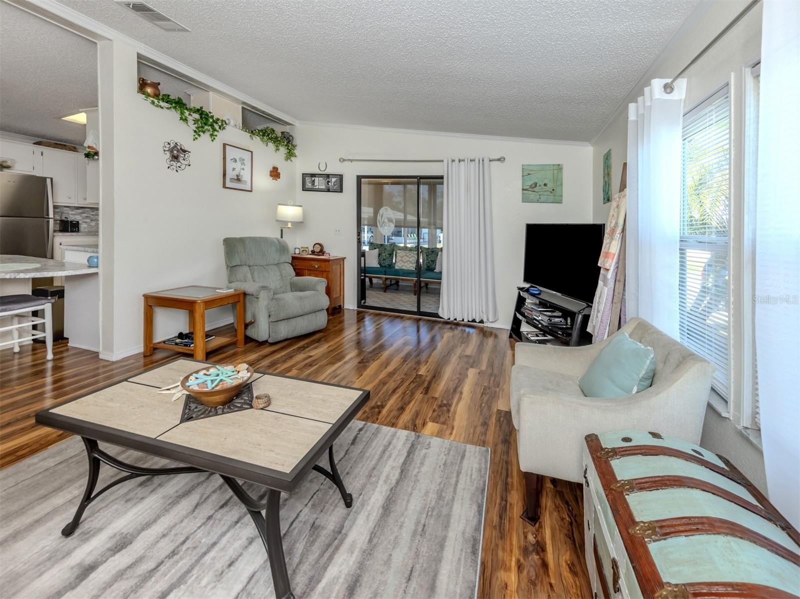This immaculate, extremely well maintained 2 bedroom, 2 bath home is located in the land owned, pet friendly community of Harbor Isles and truly shows pride of ownership. Clean as a whistle and updated from top to bottom, this home is completely move-in ready. Pergo flooring runs throughout, all walls have been freshly textured and painted, and all exterior windows have been updated for peace of mind. The home features two spacious lanais, both enclosed with sliding acrylic windows, custom blinds, and window AC units, creating comfortable year-round spaces to relax or entertain. The kitchen has been tastefully updated with new counters, a refreshed backsplash, and newer stainless steel appliances. Major improvements include a full re-pipe in 2021, a new roof in 2023 with a 15-year transferable warranty, a 5-year-old AC unit, vapor barrier installed in October 2023, hot water heater replaced in 2022, new vinyl skirting in 2024, and a brand new carport in 2025. The shed offers a convenient laundry area, ample storage, and is cooled by its own window AC unit. The home is being offered partially furnished, making it an easy transition for its next owner. Harbor Isles is a highly sought-after, gated waterfront community offering a resort-style lifestyle. Residents enjoy a marina with boat slips and kayak launch, a clubhouse with a wide variety of social activities, a heated pool, tennis and pickleball courts, bocce, shuffleboard, a fitness center, and an active calendar of events. Conveniently located near beaches, shopping, dining, and downtown Venice, Harbor Isles is known for its friendly atmosphere and beautifully maintained grounds.