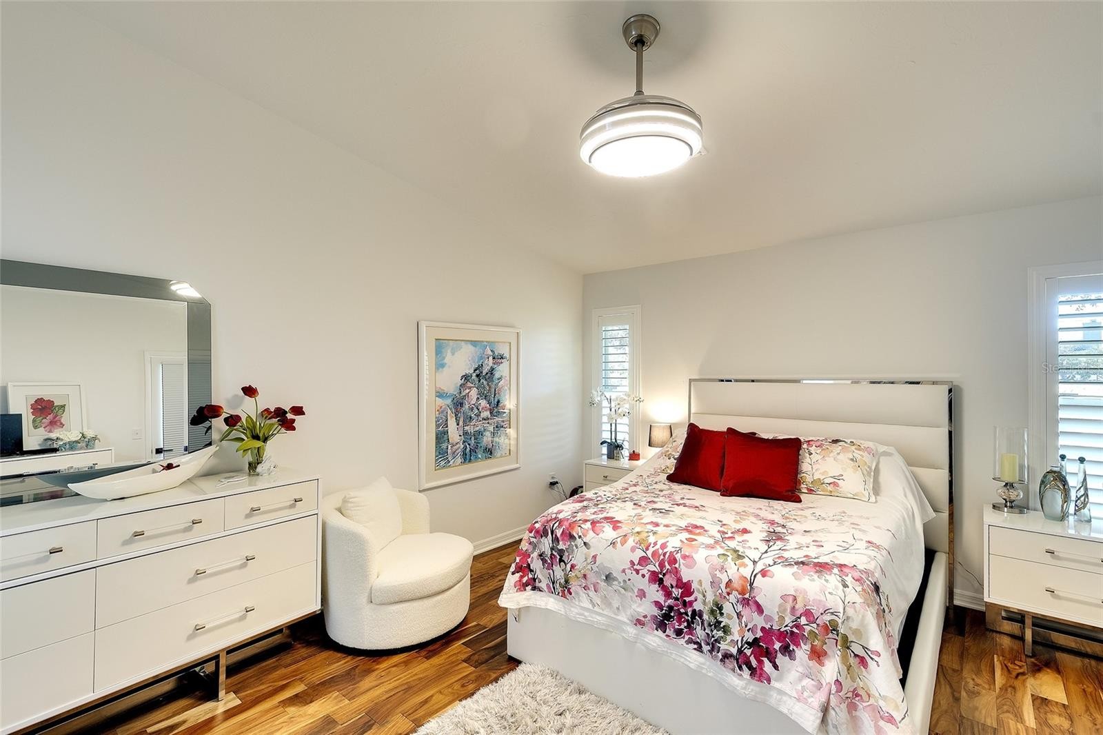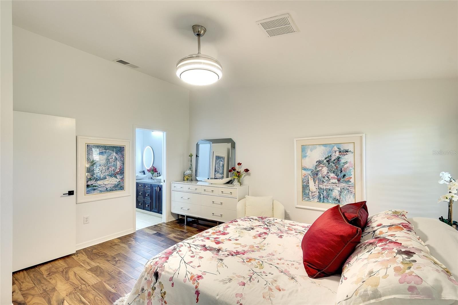 Here's one that delivers! This beautifully renovated villa offers a rare opportunity to enjoy stylish, low maintenance living in a popular gated 55+ community in a great location, situated close to shopping, I-75, UTC & downtown Sarasota/Bradenton. This spacious villa offers soaring ceilings, a flowing open floor plan, warm wood floors, and striking designer lighting, the interior feels both modern and welcoming. The expansive kitchen is a true showstopper, featuring white painted wood cabinetry with pullouts, a large work island, counter seating, quartz countertops, glass tile backsplash, and a beverage center with glass uppers and wine fridge. Newer stainless appliances include a refrigerator and microwave (2025), with additional appliances updated in 2021. NEUTRAL paint throughout, refreshed baths with updated vanities, lighting, commodes, and tile, and the absence of wallpaper or popcorn ceilings make this home completely MOVE IN READY. A unique INTERIOR LAUNDRY room—accessible from the main living area—includes a washer and dryer (2021), a feature not commonly found in the community. Major systems have been updated for peace of mind, including a new A/C and water heater (2025). Additional highlights include a Florida room with air conditioning, a private paver patio, an expansive, private rear grassy area, and lovely landscaping with paver front walkway. The garage features a utility sink, shelving, and an epoxy floor. Residents of Garden Lakes enjoy winding streets, mature trees, walking paths, and an active clubhouse with pool, kitchen, library, multi-pupose room, fitness, tennis, pickleball, and HOA fees at a fraction of similar communities. Many planned activities. Designed for easy living and entertaining, this is a must see, all in a desireable, friendly community.