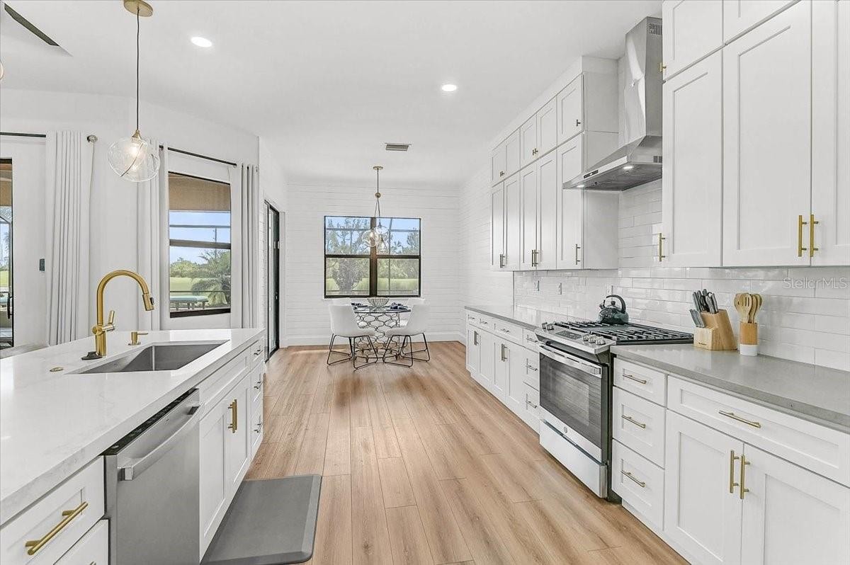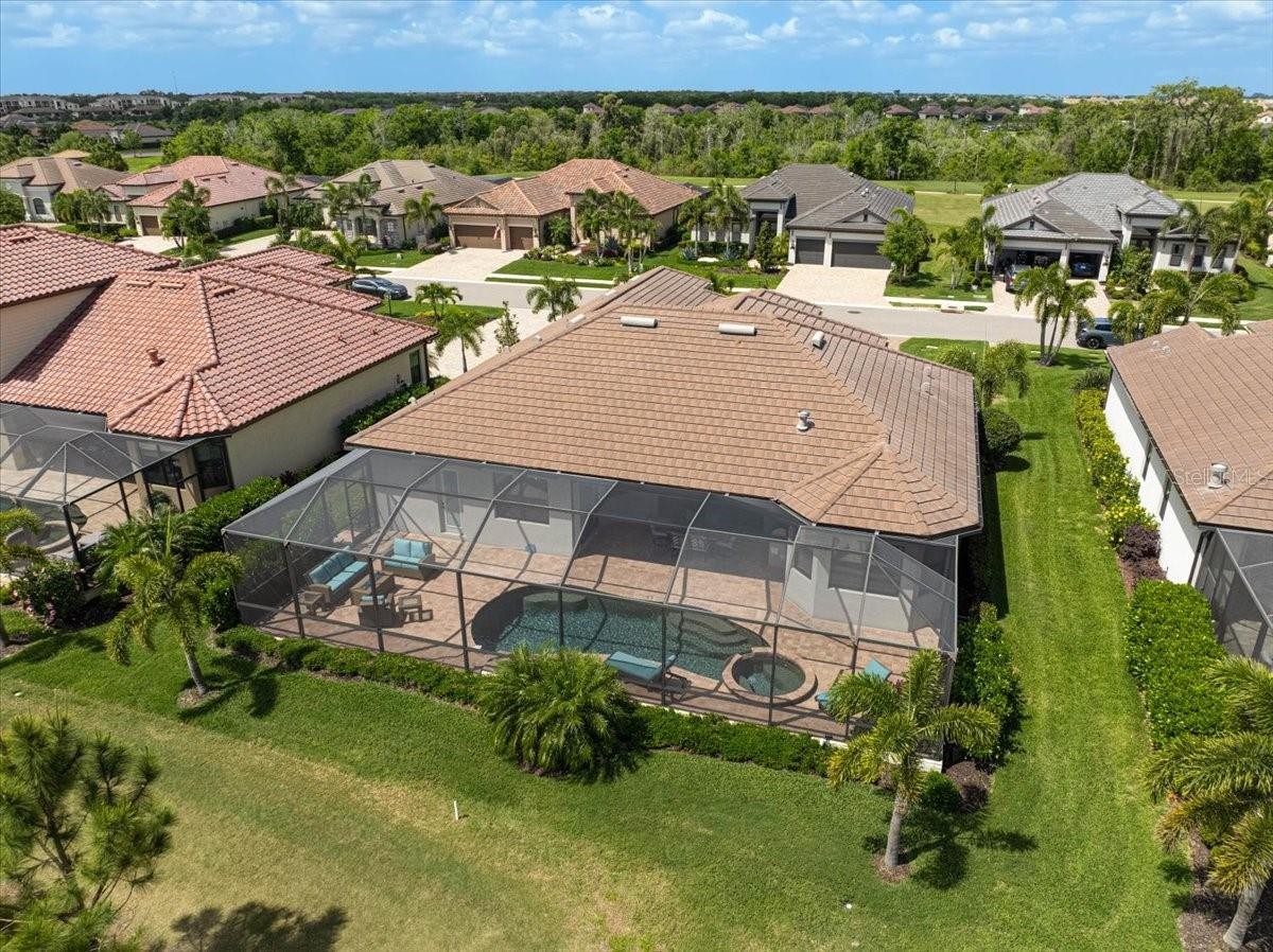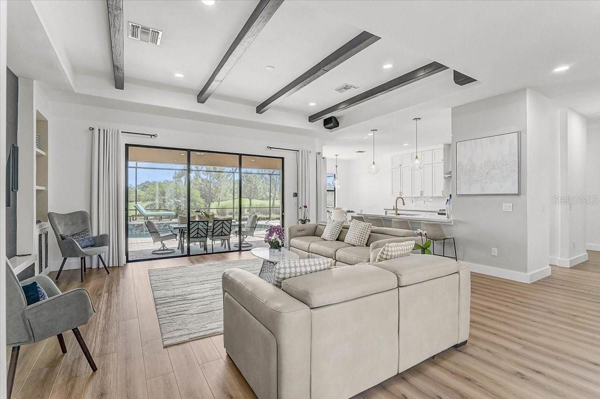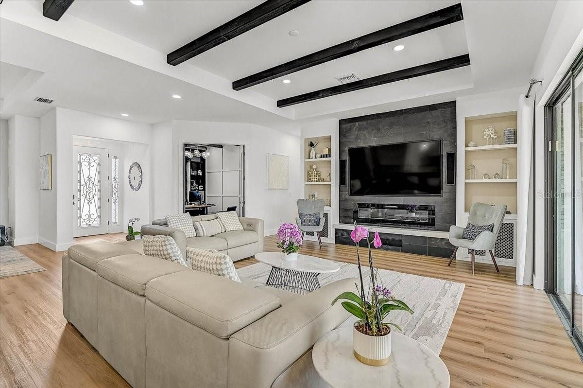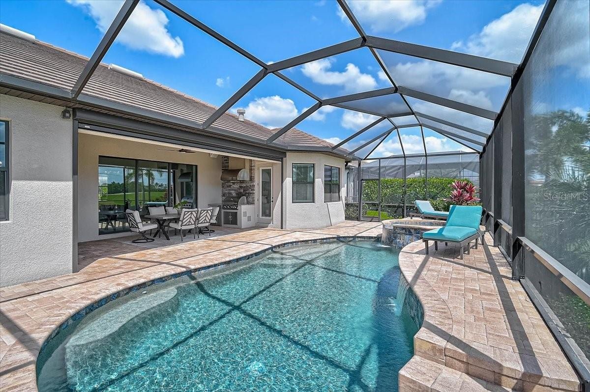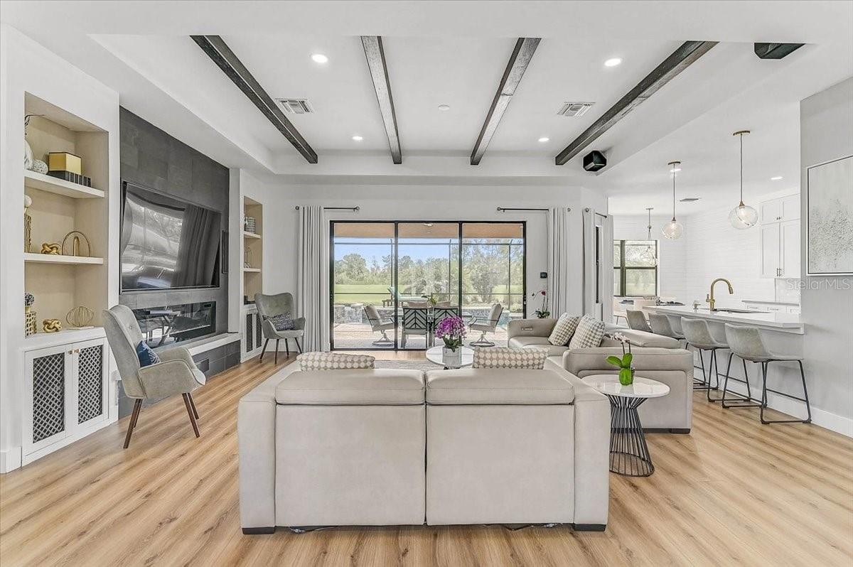 Stunning golf course residence offered TURNKEY FURNISHED, including GOLF CART! Enjoy breathtaking golf course views from this exceptional home featuring 3 Bedrooms + Den/Office, 3 Full Baths, and a 3-Car Garage. The family room is a true showpiece, highlighted by rich wood beams in the tray ceiling, custom built-in shelving, and a striking 6-foot electric fireplace as the focal point. Just off the family room, a beautifully updated home office is filled with natural light—ideal for remote work or a quiet retreat. The gourmet kitchen is designed to impress, featuring stone countertops, farmhouse sink, stainless steel appliances, tile backsplash, and elegant gold fixtures and hardware. Entertain effortlessly in the formal dining room, showcasing a stunning mother-of-pearl accent wall that will captivate your guests. The luxurious primary suite offers a spacious walk-in closet and a spa-inspired bath complete with soaking tub, custom-tiled shower, and dual vanities. Additional highlights include new lighting, a new lanai hurricane screen system, and custom built-ins, reflecting thoughtful upgrades throughout the home. Step outside to your screened, paver lanai and experience the best of Florida living. This outdoor oasis features a Heated Pool and Spa, fully equipped Outdoor Kitchen, and tranquil golf course views—perfect for relaxing or entertaining in complete privacy. Located in Lakewood National Golf Club, a premier bundled golf community offering two Arnold Palmer-designed championship courses and exceptional amenities, including tennis, pickleball, bocce, fitness center, tiki bar, and an impressive 28,000 sq ft clubhouse. Experience resort-style living at its finest!
