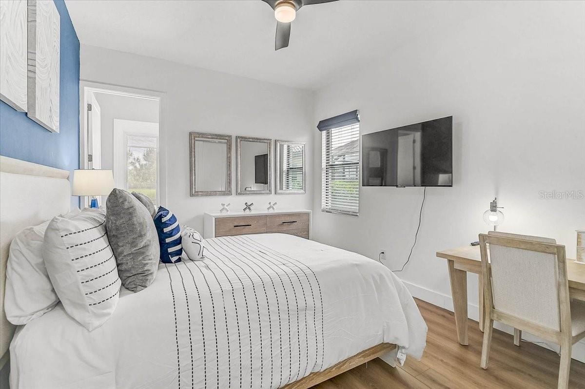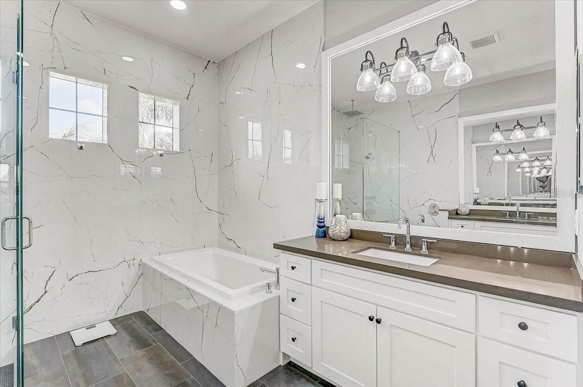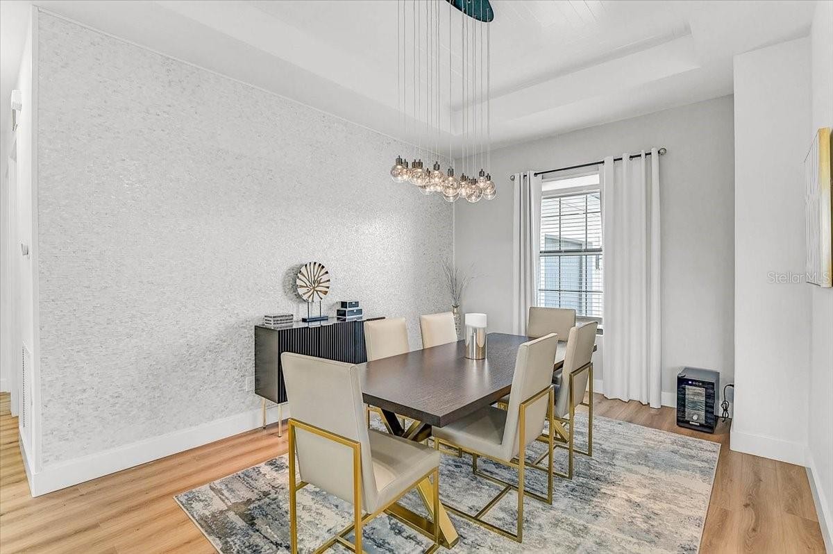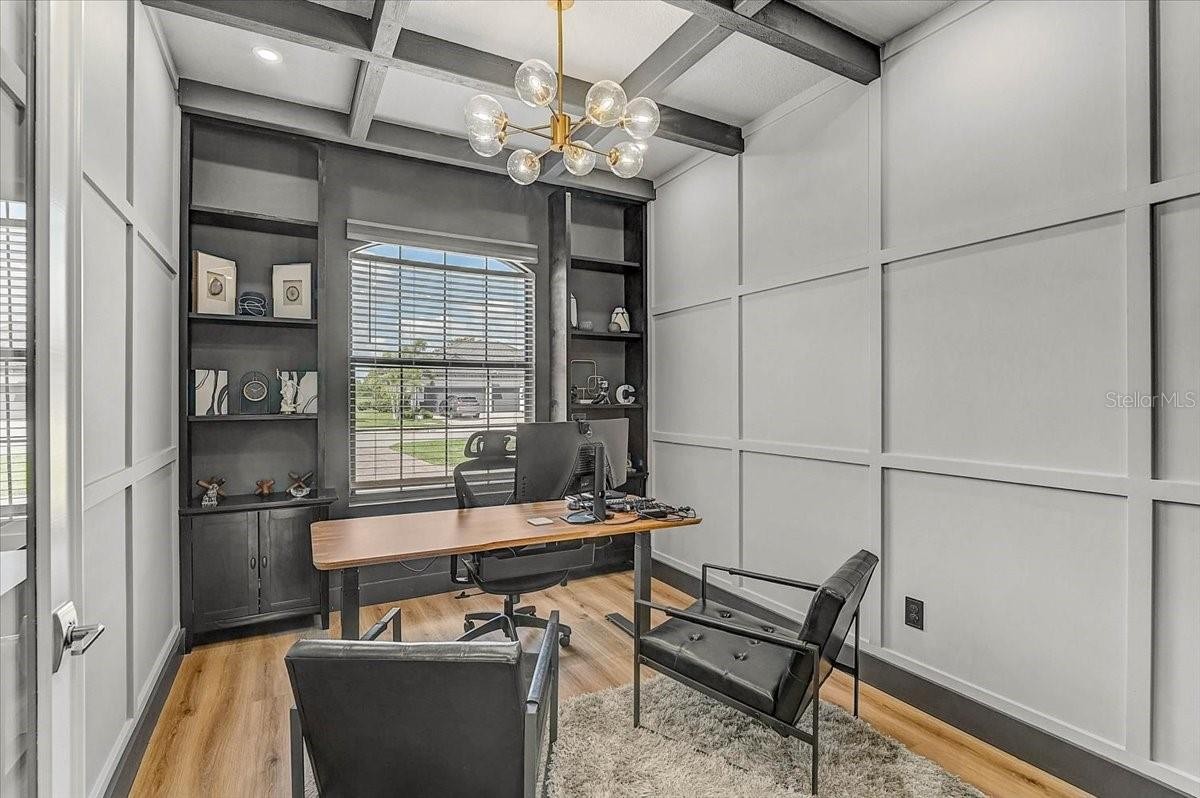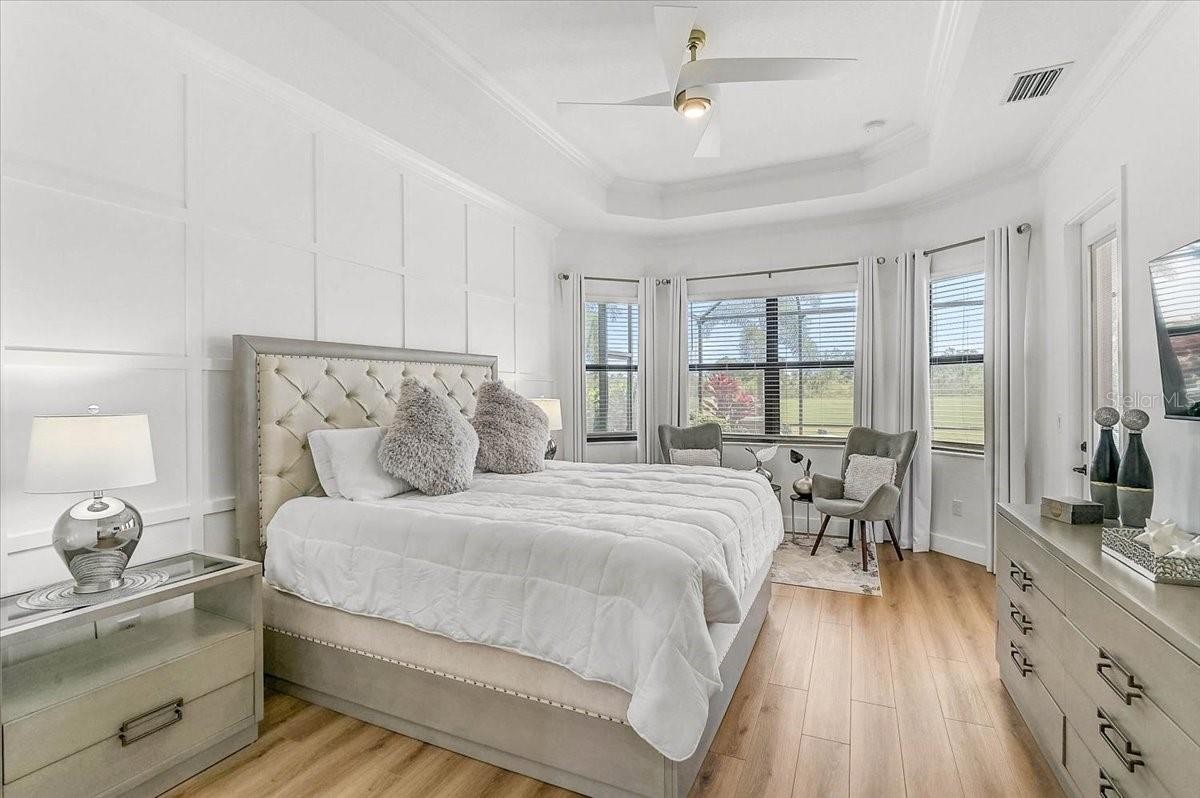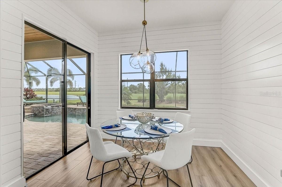 Stunning golf course residence offered TURNKEY FURNISHED, including GOLF CART! Enjoy breathtaking golf course views from this exceptional home featuring 3 Bedrooms + Den/Office, 3 Full Baths, and a 3-Car Garage. The family room is a true showpiece, highlighted by rich wood beams in the tray ceiling, custom built-in shelving, and a striking 6-foot electric fireplace as the focal point. Just off the family room, a beautifully updated home office is filled with natural light—ideal for remote work or a quiet retreat. The gourmet kitchen is designed to impress, featuring stone countertops, farmhouse sink, stainless steel appliances, tile backsplash, and elegant gold fixtures and hardware. Entertain effortlessly in the formal dining room, showcasing a stunning mother-of-pearl accent wall that will captivate your guests. The luxurious primary suite offers a spacious walk-in closet and a spa-inspired bath complete with soaking tub, custom-tiled shower, and dual vanities. Additional highlights include new lighting, a new lanai hurricane screen system, and custom built-ins, reflecting thoughtful upgrades throughout the home. Step outside to your screened, paver lanai and experience the best of Florida living. This outdoor oasis features a Heated Pool and Spa, fully equipped Outdoor Kitchen, and tranquil golf course views—perfect for relaxing or entertaining in complete privacy. Located in Lakewood National Golf Club, a premier bundled golf community offering two Arnold Palmer-designed championship courses and exceptional amenities, including tennis, pickleball, bocce, fitness center, tiki bar, and an impressive 28,000 sq ft clubhouse. Experience resort-style living at its finest!
