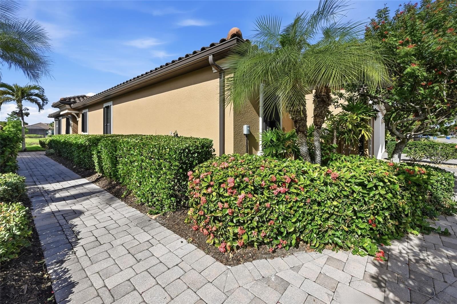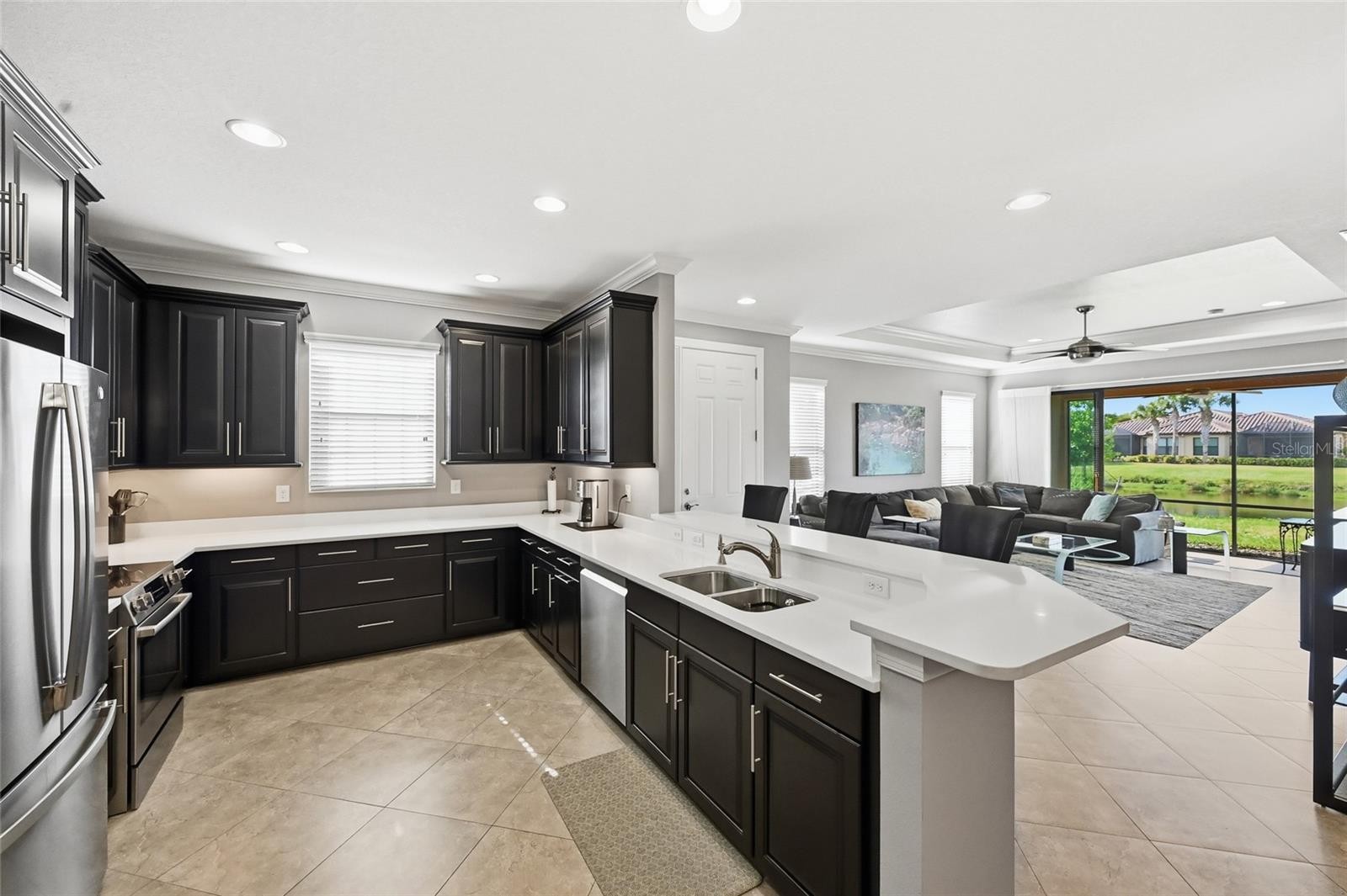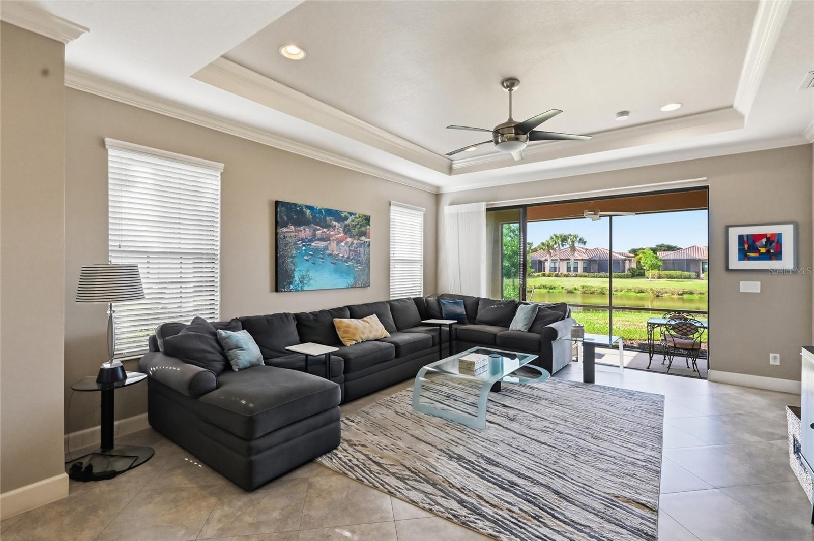 Beautiful 3 bedroom plus den lakefront home! FANTASTIC LAKE VIEW! Wonderful location, short walking distance to the clubhouse, resort pool, fitness center, tennis and pickleball courts. High ceilings. Large tile laid on the diagonal. It's beautiful! The floor plan offers comfortable living and dining areas with a layout that works well for both everyday living and entertaining. The living room is accent by a large tray ceiling and crown molding. It opens with pocket sliders to the screened in lanai with a really wonderful lake vista. Fabulous chef's kitchen accented by stainless appliances, wood cabinets and quartz countertop. The den and primary bedroom have tray ceilings. Spacious primary bathroom has a walk-in shower and large walk in closet. This home is grounds and exterior building maintenance free! Conveniently close to WORLD FAMOUS SIESTA BEACH, shopping, restaurants! Have a pet? This community features a dog park. Esplanade by Siesta Key is a very special community with lots of activities for everyone.