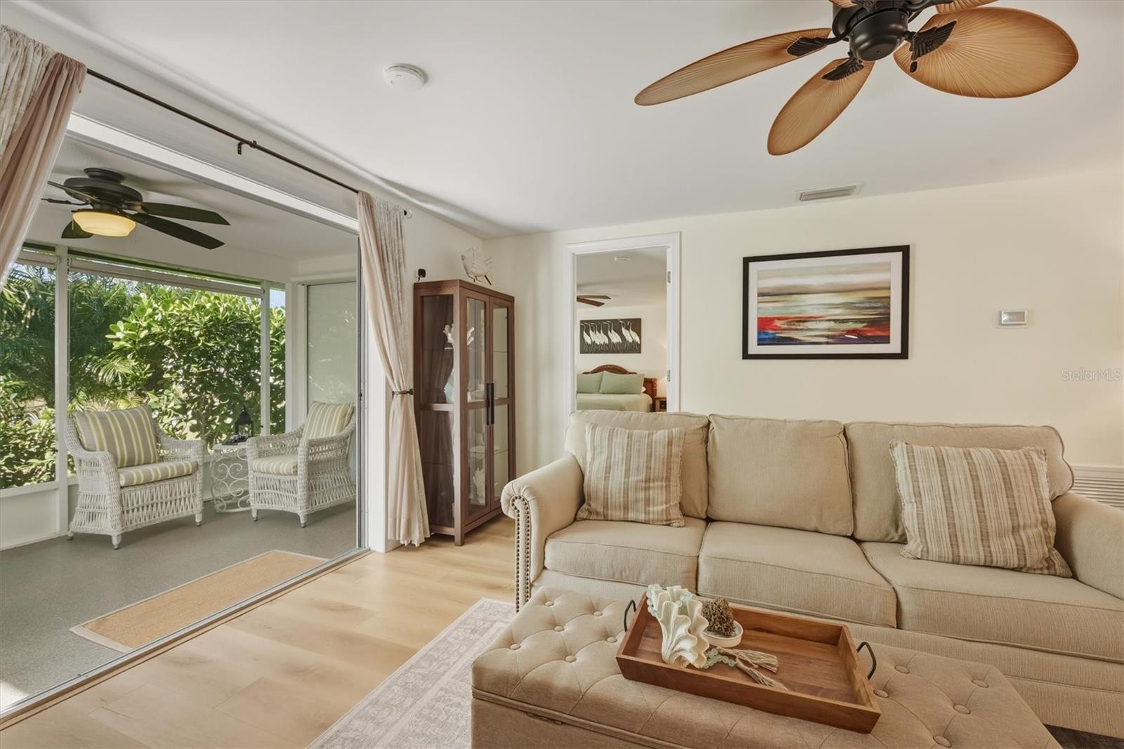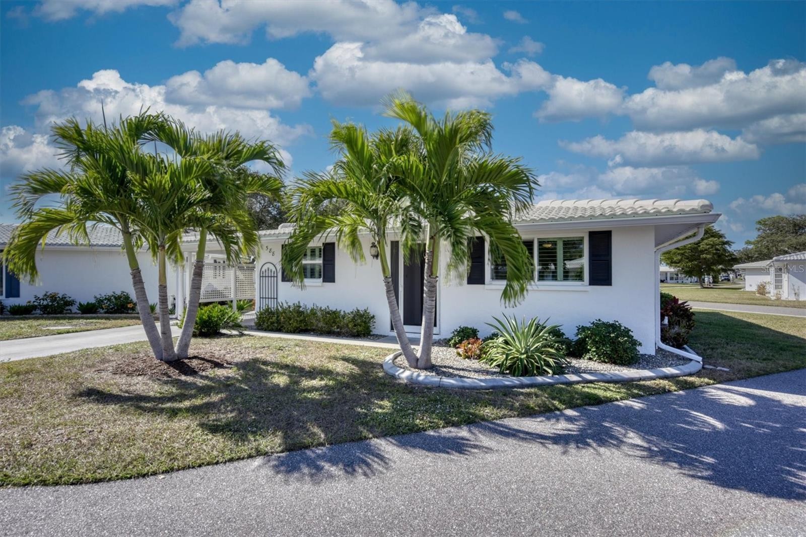 Discover the charm of this beautifully updated free-standing villa, offering over 1,000 square feet of inviting living space. With 2 bedrooms and 2 baths, this home is designed for comfort and style. Step outside to your private screened-in 126-square-foot lanai, perfect for relaxing evenings, plus an additional paved patio ideal for soaking up the sun. Built for peace of mind, the villa features impact windows, elegant plantation shutters, and recently installed smoke alarms. Modern conveniences include a recent washing machine, dishwasher, and water heater. Freshly painted inside and out, with maintenance-free gables added in 2025, this property exudes freshness and durability. The professionally landscaped grounds enhance the curb appeal, while inside, newer luxury vinyl flooring—accompanied by crisp baseboards and casings—creates a seamless, carpet-free flow. The efficient kitchen boasts warm wood cabinets, sleek granite countertops, and plenty of natural light, making it a bright and stylish heart of the home. Ceiling fans throughout keep things cool and comfortable. Nestled in an active community with a bustling calendar of events, and just a short drive from beautiful beaches, this villa is more than a home—it’s a lifestyle waiting for you!