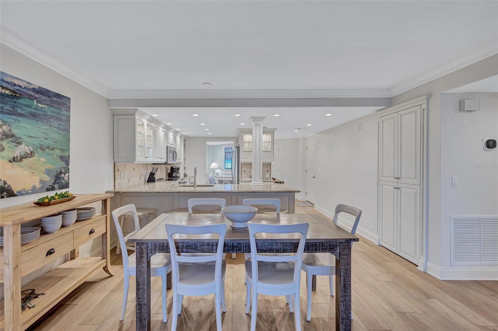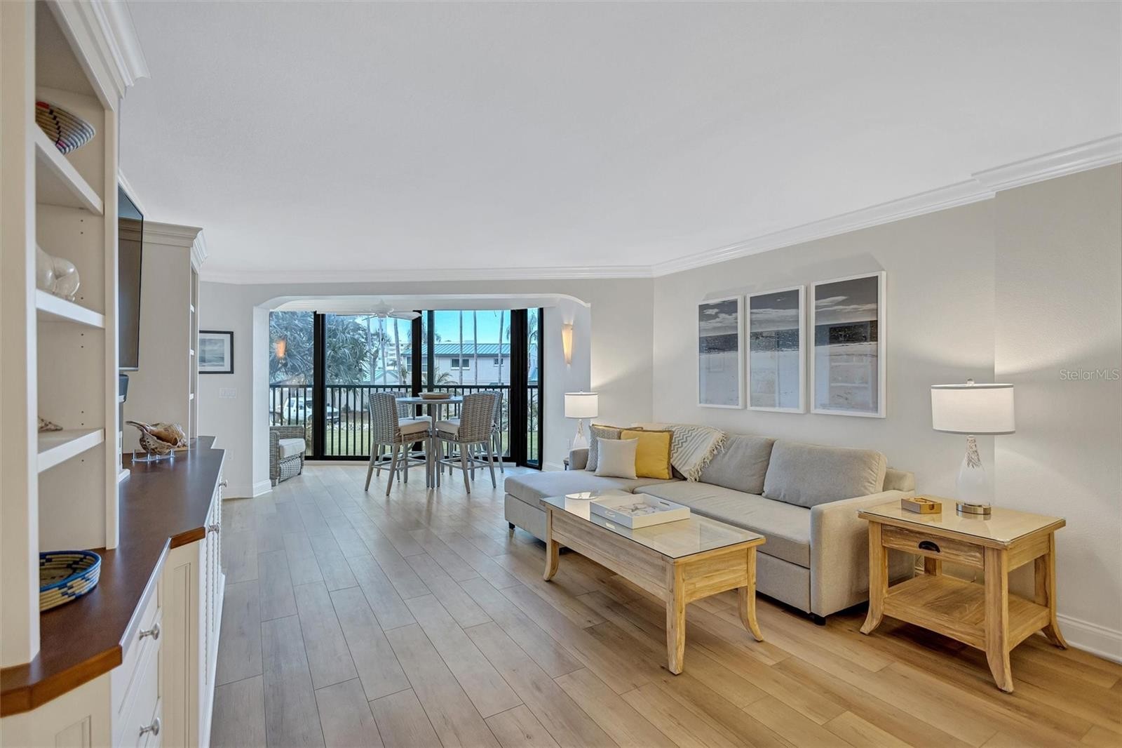 Find your beach get-away in this remodeled three-bedroom Casarina condo located on Siesta Key’s famous Crescent Beach. This stunning TURNKEY FURNISHED and updated unit includes an open concept kitchen with high-end custom soft-close cabinetry, designer hardware and granite countertops. The great room was extended to incorporate the balcony into the living space creating an open and airy feeling to this home. A wall mounted television with Sonos audio provides family entertainment. The spacious primary bedroom with a Closet Tech designed walk-in closet opens to a large bathroom with custom cabinets, dual sinks and large walk-in shower. A third bedroom was created during the recent remodel and includes a built-in under window desk. The full-sized laundry room allows for plenty of storage. Luxury vinyl flooring was installed in 2020 in all public rooms. Impact windows were added in 2016. Electric blinds can close off the sliding glass doors to the outside view while all other windows have custom designed plantation shutters. Crown molding and solid wood doors are found throughout the unit. Casarina is an 89-unit condominium complex that sits on 200 feet of private beach and encompasses 7 acres of tropical landscaping. The complex has a clubhouse with kitchen. Spend your days enjoying the beachside pool and spa, play a game of pickleball on one of the two lighted tennis courts, or relax on the island’s famous crystal sand beach. Hop on the free trolley to enjoy the dining, shopping and entertainment at Siesta Key Village. CASARINA ALLOWS OWNERS ONE SMALL PET. View the video at: https://sunnylensmedia.hd.pics/5880-Midnight-Pass-Rd-1/idx