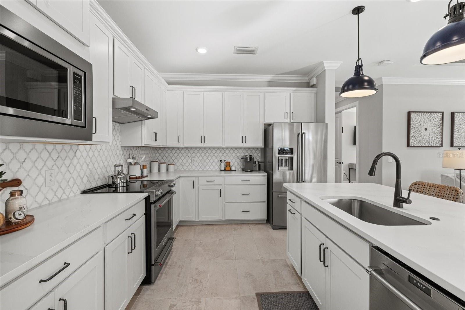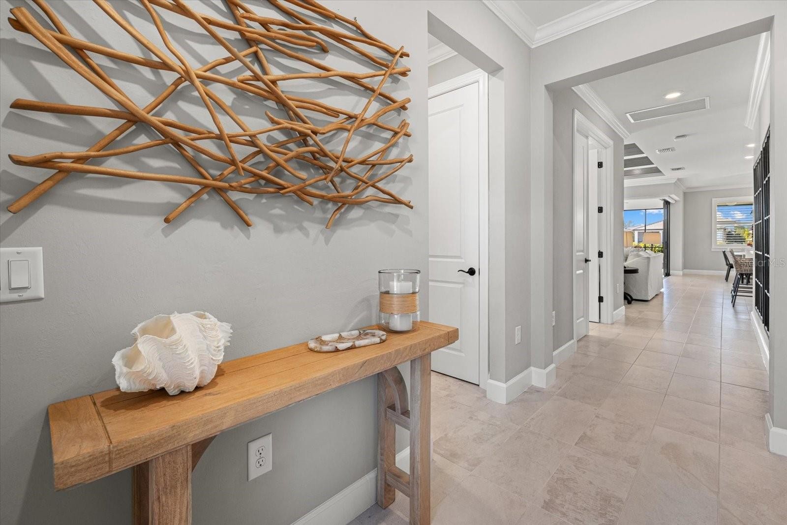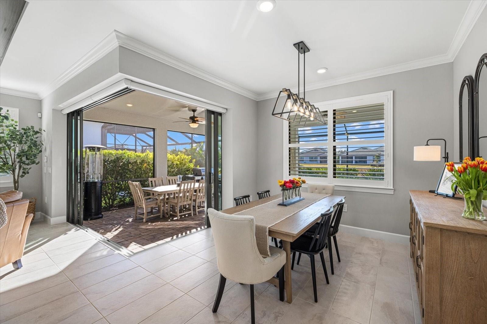 Welcome to this Mystique model home located in the gated community of Sapphire Point at Lakewood Ranch, just steps from the community amenities. This move-in-ready residence offers three bedrooms plus a den and two bathrooms, thoughtfully designed for comfort, functionality, and modern Florida living. Interior features include tray ceilings with decorative beams, crown molding throughout, and ceiling fans in every room. The kitchen is enhanced by a walk-in pantry, while the functional laundry room and drop zone provide excellent everyday organization. Additional upgrades include pull-down attic stairs and added garage rafters, offering valuable storage solutions. The home’s widened driveway provides additional parking, while the epoxy-finished garage floor and desirable four-foot garage extension create extra space ideal for storage, larger vehicles, or a workshop area. The main living area opens seamlessly to the outdoors through zero-corner pocket sliding glass doors, leading to an upgraded extended covered lanai designed to maximize shaded outdoor living and entertaining space. This exceptional outdoor retreat features a heated pool and spa, custom lanai lighting for evening ambiance, and tranquil pond views, creating the perfect setting for both relaxing and hosting guests year-round. Sapphire Point offers resort-style amenities including a clubhouse, fitness center, dog park, basketball courts, covered playground, fire pit, and an active social calendar. Conveniently located near top-rated schools, shopping, dining, and everything Lakewood Ranch has to offer, this home delivers an exceptional combination of upgrades, location, and lifestyle.