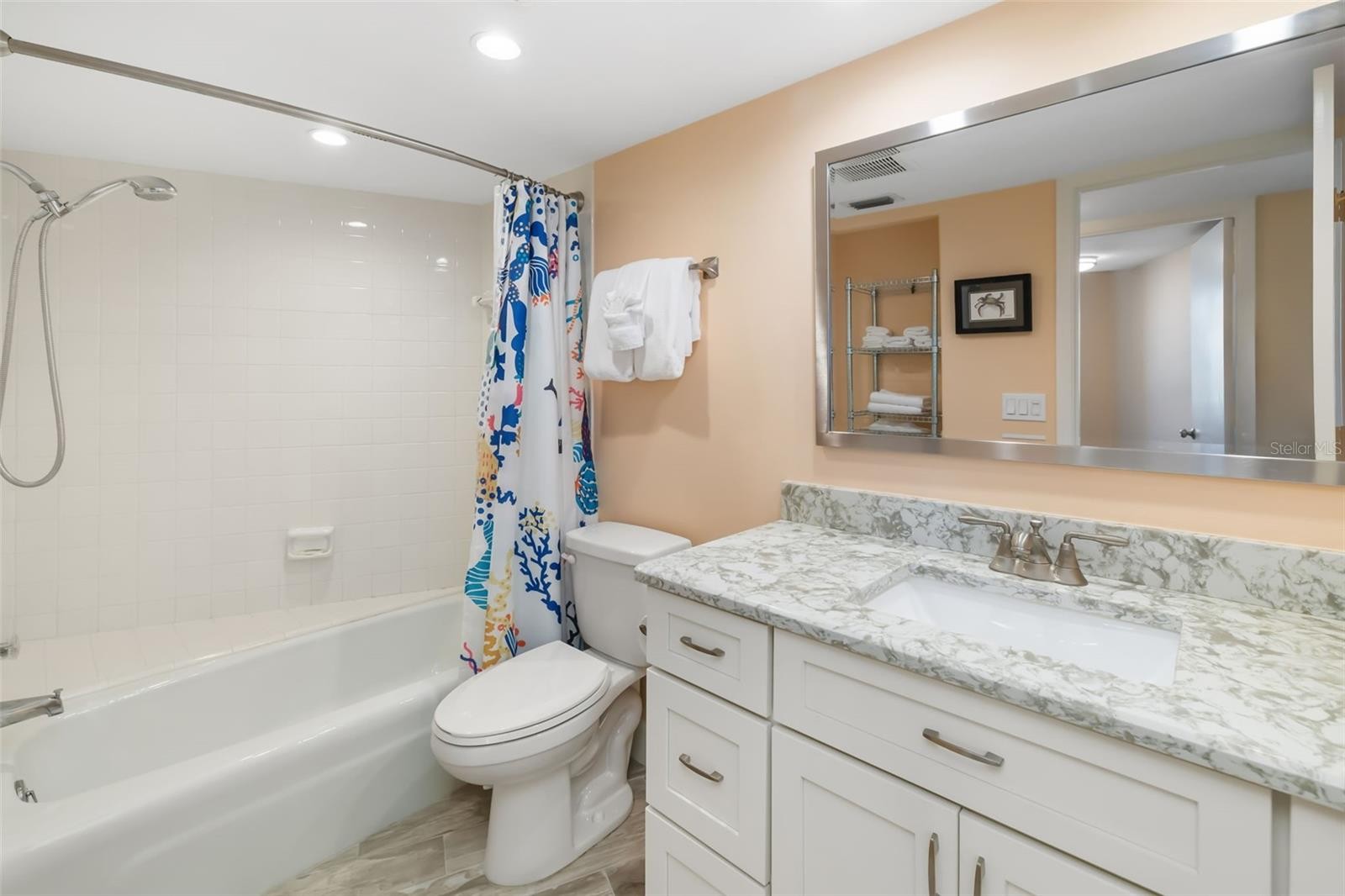Welcome to an exceptional new offering in the highly sought-after Sarasota Surf & Racquet Club. Perfectly positioned on the 7th floor of the coveted tower building, this beautifully upgraded two-bedroom, two-bath residence captures expansive views and cooling Gulf breezes while delivering a refined, move-in-ready coastal experience. The thoughtfully renovated kitchen has been redesigned to enhance both form and function, opening sight lines to the living space and creating a true gathering hub. White cabinetry, quartz countertops, and a newly added kitchen island replace the former peninsula, while the removal of the original owner’s closet provides additional counter and storage space—ideal for your coffee bar, display of fine spirits or to lay out your coastal cuisine buffet style. Both bathrooms have been upgraded with matching quartz countertops, creating a cohesive and modern aesthetic throughout. The primary suite offers a spa-inspired bath with an expanded layout, a sleek stand-up shower with frameless glass doors, and a newly added water closet for enhanced comfort and privacy. A locked owner’s closet allows for easy “lock-and-leave” ownership, perfect for seasonal use or rental flexibility. The guest bedroom comfortably accommodates two queen beds and features a generous walk-in closet with existing washer/dryer vent access, ready for a future installation if desired. Ownership at Sarasota Surf & Racquet Club feels effortless and exclusive as it includes access to two heated swimming pools, a fitness center, BBQ pavilion and recreation hall. An active tennis community brings residents together for fitness, fellowship, and a little competitive fun. The onsite rental management team cares for your investment, with a rare and advantageous 3-night rental minimum policy, and organizes all of the reservations and turnovers while you enjoy your return on investment. Ideally poised on Siesta Key’s pristine shoreline, this residence offers a rare blend of elevated design, resort-style amenities, and effortless island living.