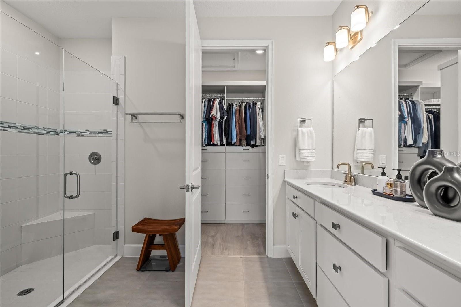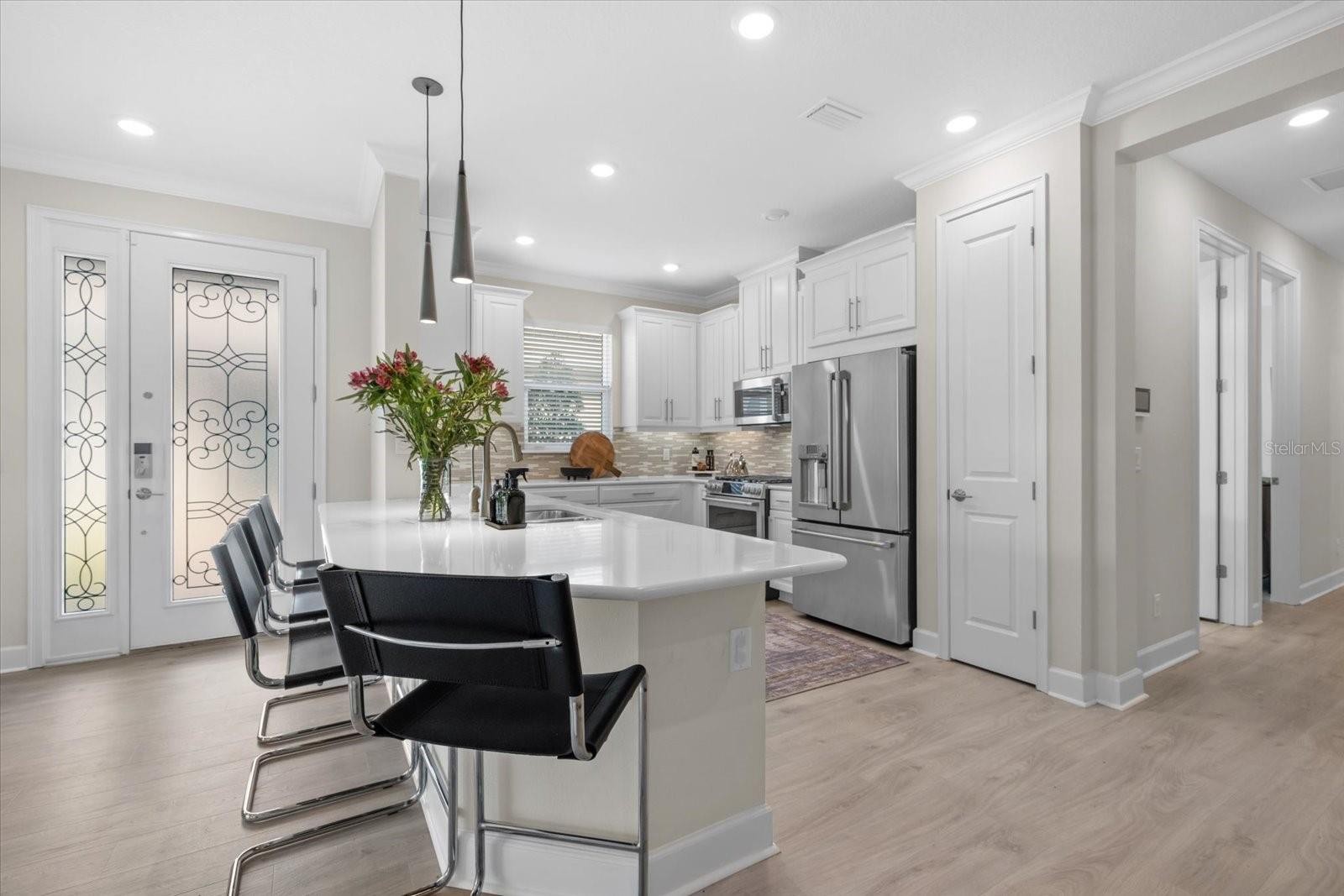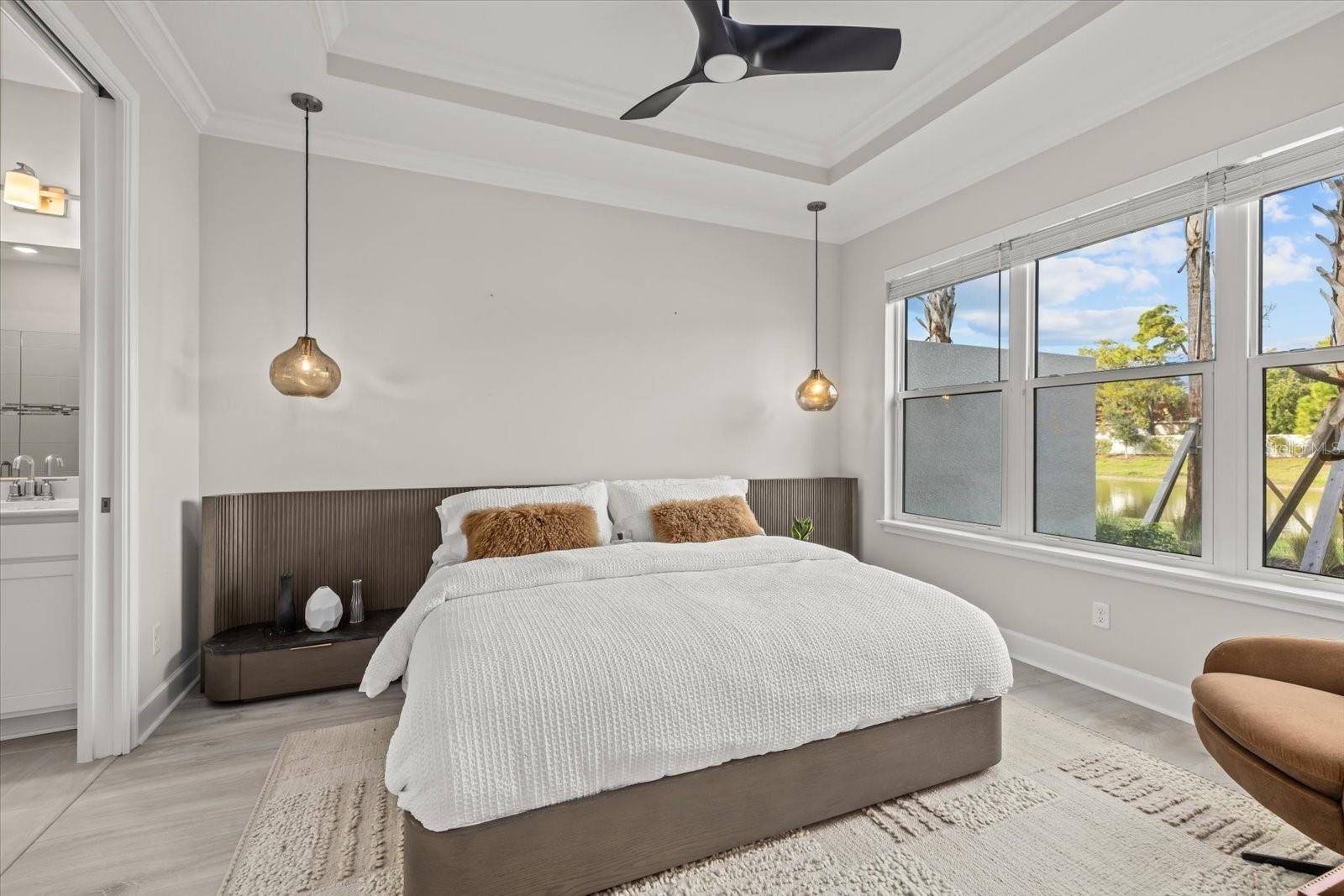 Presenting an extraordinary opportunity to acquire one of Esplanade at the Heights’ finest residences—a stunning villa that epitomizes luxury living in Bradenton’s premier, resort-style community, just moments from Sarasota. Every detail in this residence is curated for those with discerning tastes. Experience refined elegance with Taylor Morrison’s sought-after Ibis floor plan, offering 1,533 square feet of immaculate living space. This remarkable, barely-lived-in home features two spacious bedrooms with a luxurious primary suite showcasing a tailor made built in closet system. The versatile flex room shines with high-end built-in shelving, and a designer desk perfect for an office or creative studio. The living room boasts a dramatic TV accent wall. Designed for seamless indoor-outdoor Florida living, revel in breathtaking private water views from the lanai creating the ideal setting for entertaining or relaxation, blending sophistication with comfort. The open-concept layout boasts luxury vinyl plank flooring, an expansive tray ceiling, and exquisite crown molding throughout. The gourmet kitchen is a chef’s delight, featuring GE Café stainless steel appliances, gleaming quartz countertops, and custom designer lighting. Enjoy premium upgrades including hurricane impact windows throughout, 8-foot interior doors, a beautifully appointed laundry room with custom cabinetry, upgraded window treatments, custom motorized shades over the sliding doors and smart-home Uxari security system enhancements for effortless, modern living. As a resident of Esplanade at the Heights, enjoy an active, vibrant lifestyle with exclusive resort style amenities—pickleball, tennis, pool, clubhouse, spa, walking trails, fitness center and an activities director. You’ll be ideally situated near upscale shopping, acclaimed dining, renowned health care, and spectacular beaches. Seize this rare opportunity to embrace resort-inspired living in an exceptional Bradenton home—contact me today to schedule your private tour and discover true luxury! Note: Chandelier in the Dining Room, pendant lights in the Primary Bedroom, Culligan Water System and televisions do not convey with the property.