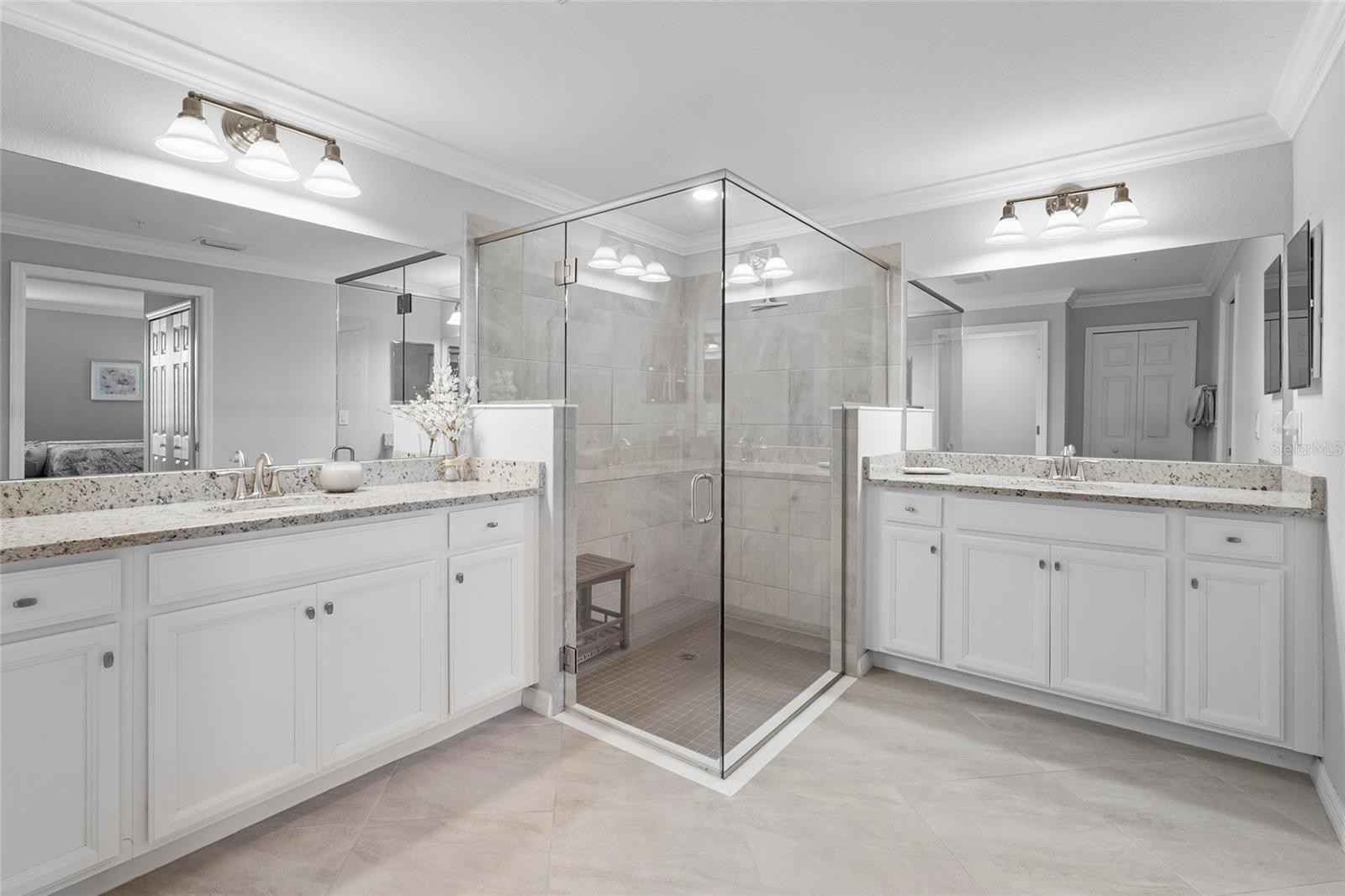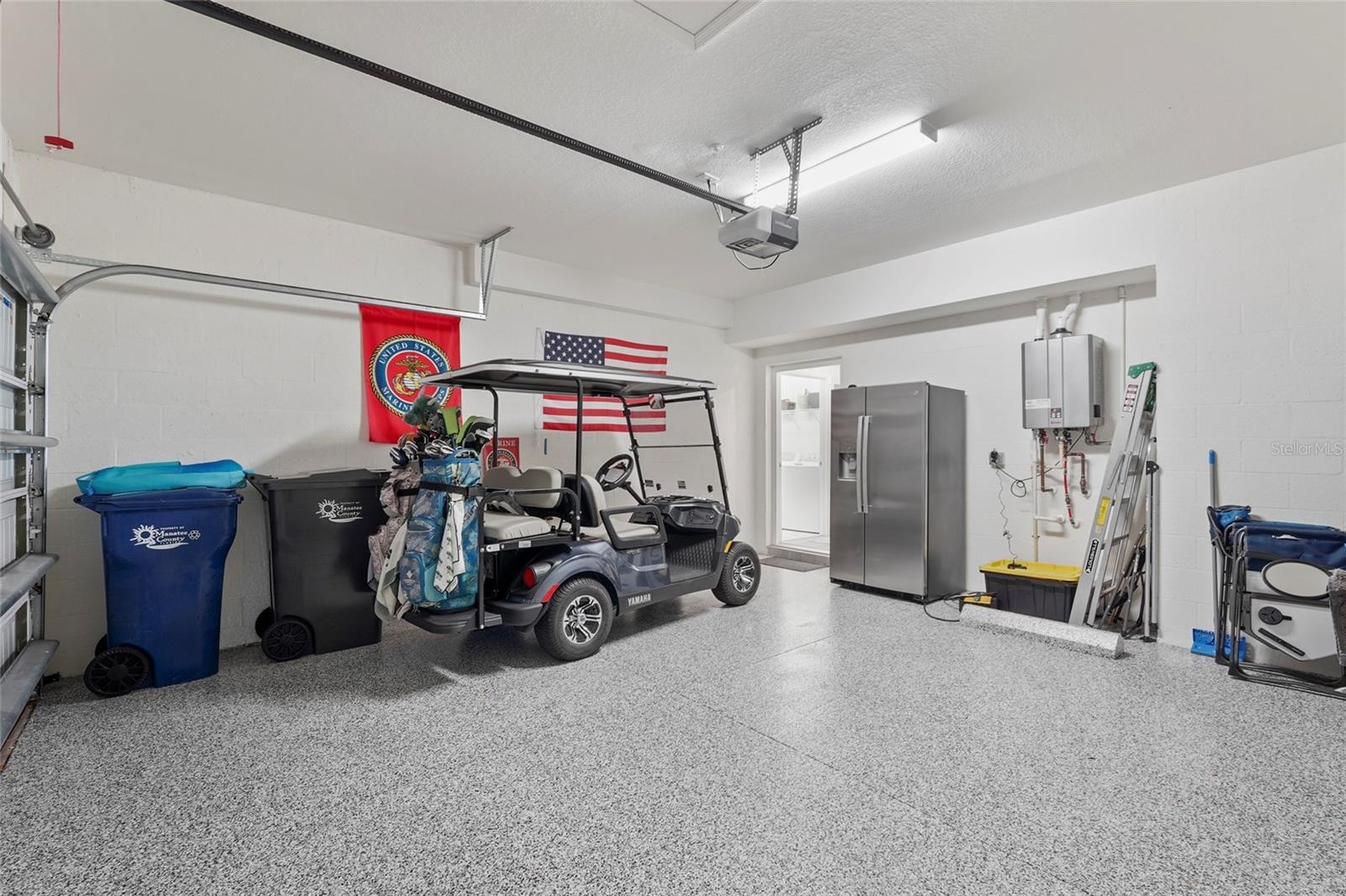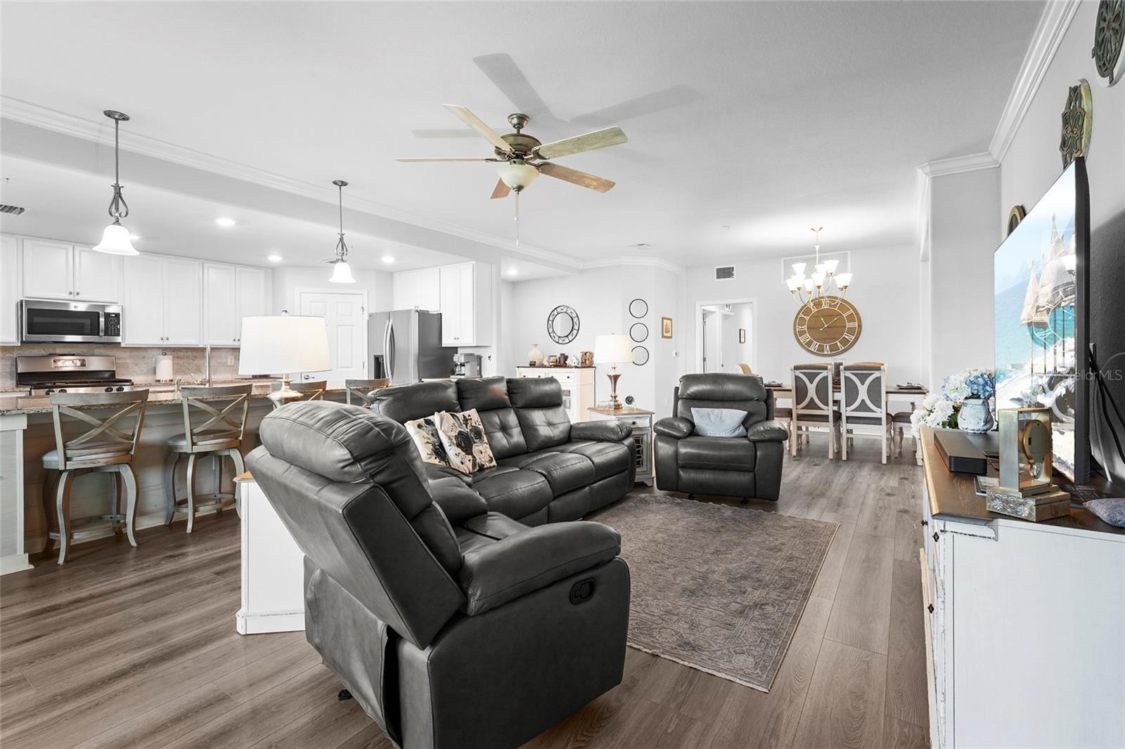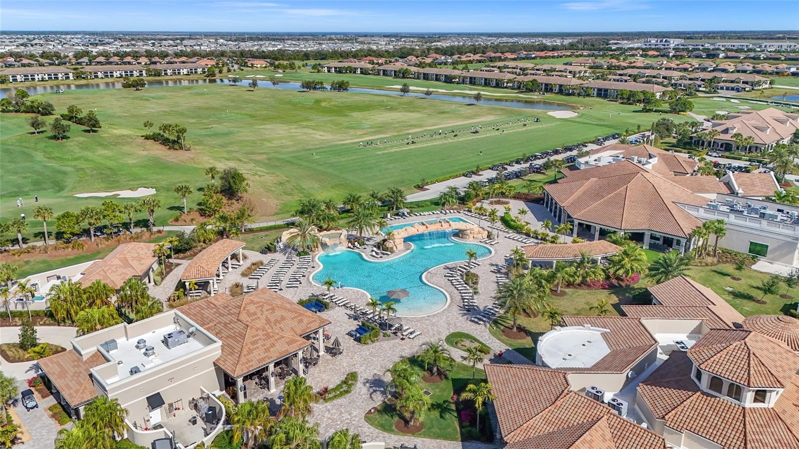 Enjoy front-row views of the fairway from this ground-floor coach home in Lakewood National Golf Club. This well-appointed residence offers impact windows, thoughtful upgrades, and the option to be sold fully furnished or unfurnished. The main living areas and bedrooms feature laminate flooring, with 18x18 diagonal tile in the baths. Crown molding runs through the main living areas and bedrooms, complemented by plantation shutters and ceiling fans in every room. The kitchen includes granite countertops, white cabinetry, a gas range, an accented island with seating for four, and new LG refrigerator and KitchenAid dishwasher (both one month old with a three-year warranty). An additional refrigerator in the garage adds extra storage. The screened lanai offers electric hurricane-rated shades (up to 40 mph) and overlooks the championship golf course. Inside, there are also electric shades on the sliding glass doors and in the primary bedroom. Recent interior paint updates have been completed in the primary bedroom and main living areas. The primary suite features a wood accent wall, two walk-in closets, dual sinks, linen closet, and a walk-in tiled shower with frameless glass. Bedrooms two and three include pocket-door closure separating from the main living area , ideal for guest privacy or a home office. Lakewood National Golf Club offers bundled golf with a 36-hole Arnold Palmer–designed championship course, along with a grand clubhouse, resort-style lagoon pool, fitness center, clay tennis courts, full-service spa, and on-site dining, all supported by full-time golf, fitness, and racquet professionals.