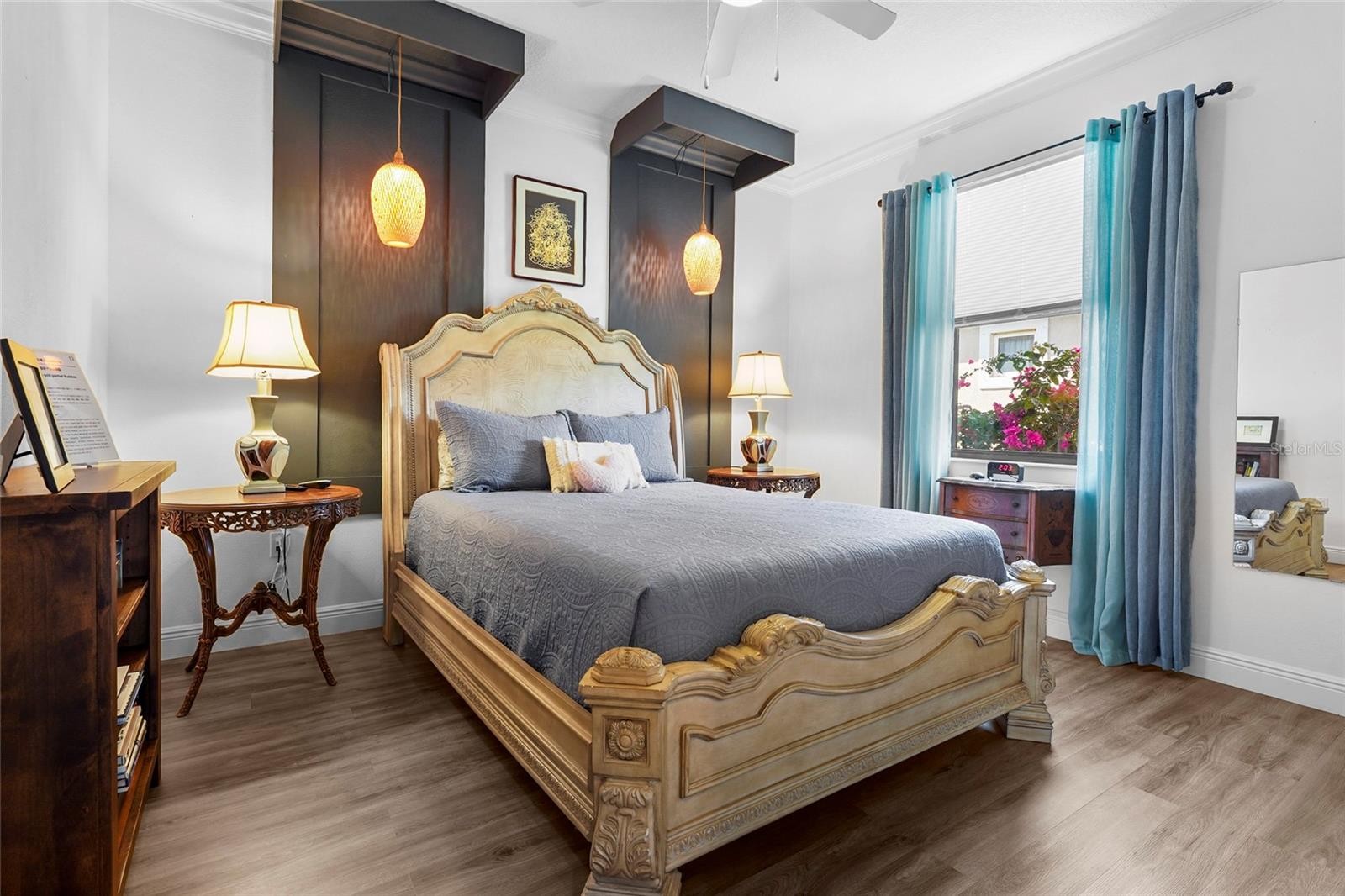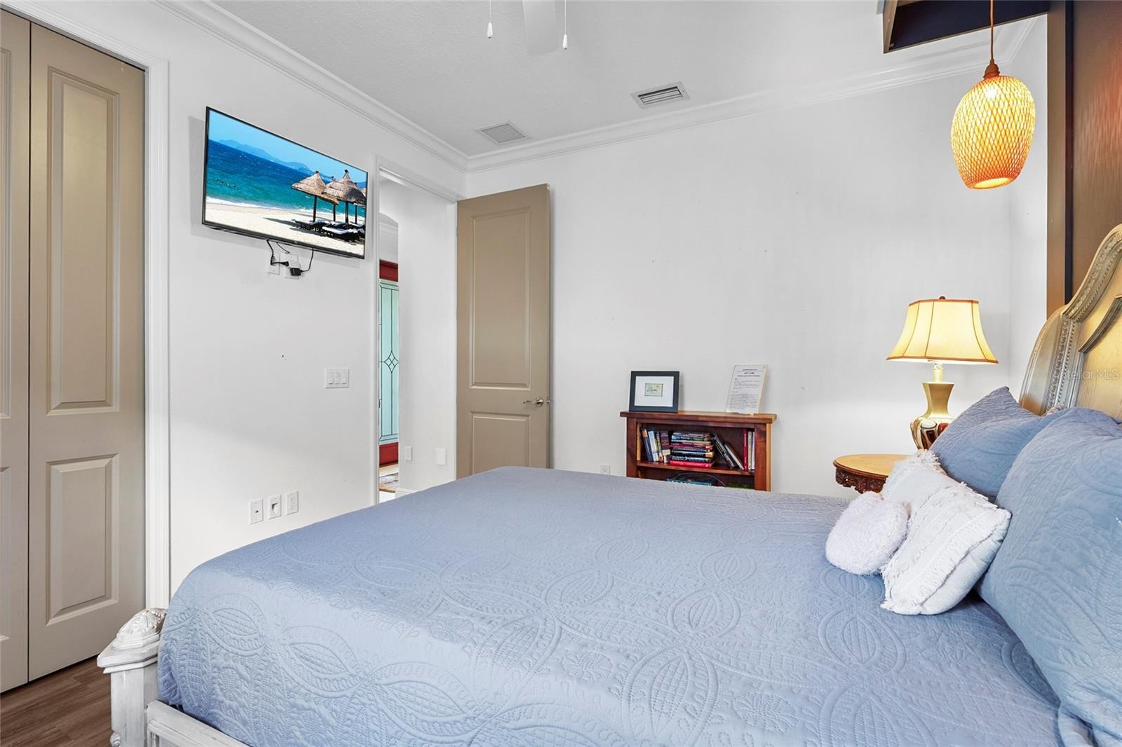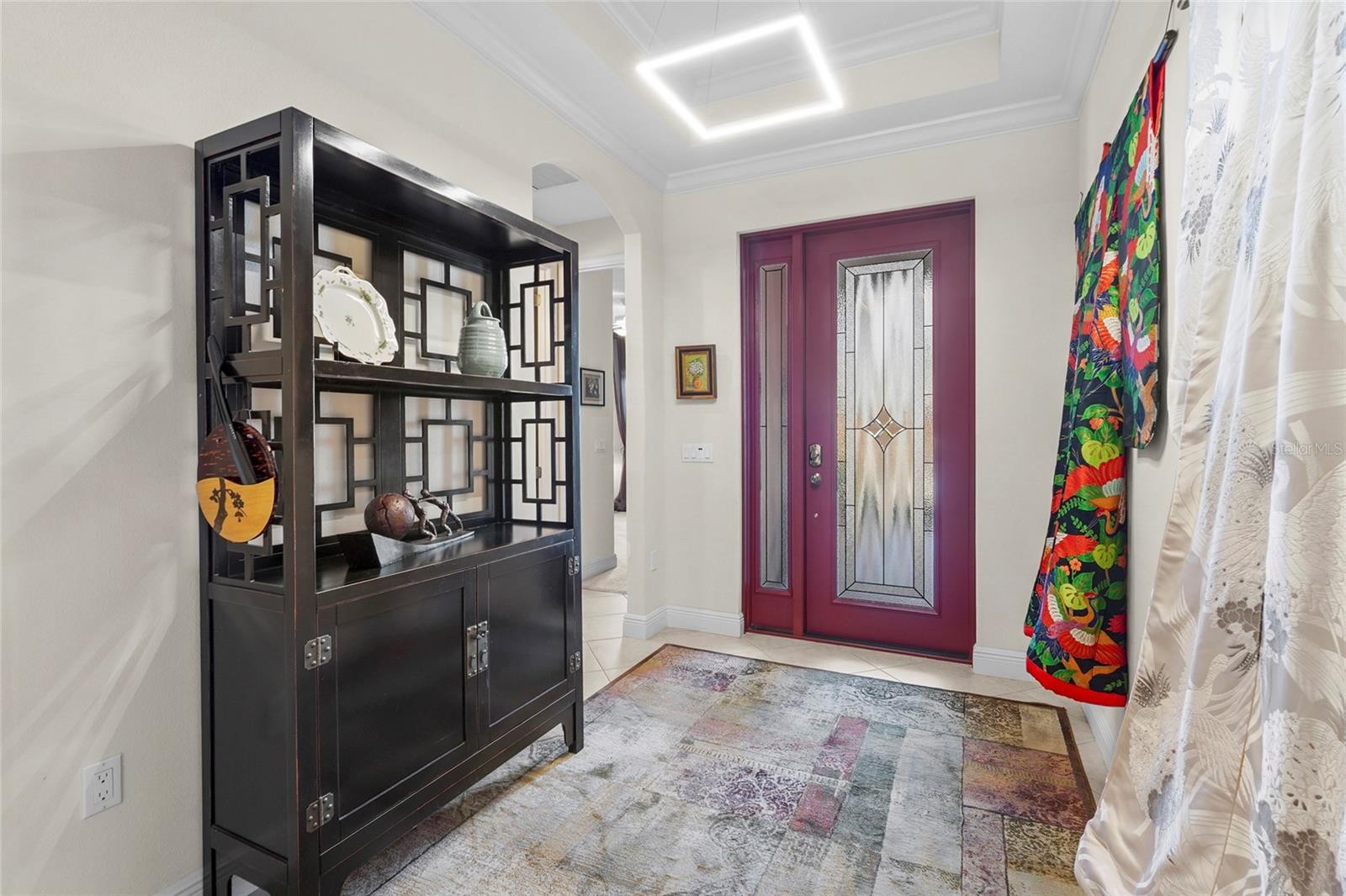Set within the established, gated community of Greyhawk Landing, this sought after Kingsley model by Homes by Towne was built in 2016 and positioned on a generous lot with tranquil water views, offering a balance of space, privacy, and thoughtful design. Inside, crown molding, soaring ceilings, tray details, and eight foot interior doors create an open and elevated feel throughout the main living areas. The layout offers four bedrooms and three baths, designed to live comfortably while still feeling refined. Natural gas stove and new kitchen updates anchor the heart of the home, complemented by granite countertops and a custom dry bar featuring European style cabinetry, beverage refrigeration, and a distinctive live edge bar top with cobalt blue river detail. The primary suite is a true retreat, with direct access to the lanai, separate vanities, built-ins within the walk-in closet, and a spacious walk in shower. The guest bathroom includes a walk in tub for added comfort and accessibility. Additional features include a whole home water filtration system, central vacuum, security system, and a vehicle charging station. Outdoor living is where this home truly shines. The lanai features an automated built in hurricane screen, a brand new custom outdoor kitchen and grill, and a beautifully designed pool and hot tub, all accented by LED cage lighting. Mature areca palms provide exceptional natural privacy, while the northwest facing water views across the pool deck create a peaceful and inviting setting. Storage has been carefully considered throughout, including a three car garage with extensive custom cabinetry that will appeal to anyone who values organization, functionality, or creative workspace. Greyhawk Landing residents enjoy resort style amenities including a clubhouse, fitness center, community pool, tennis and basketball courts, playgrounds, and miles of sidewalks winding through lakes and preserves, all while remaining conveniently close to Lakewood Ranch, UTC, and major commuter routes.