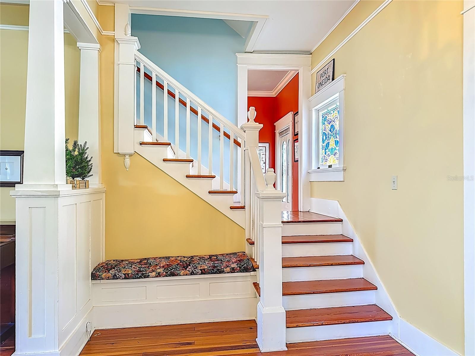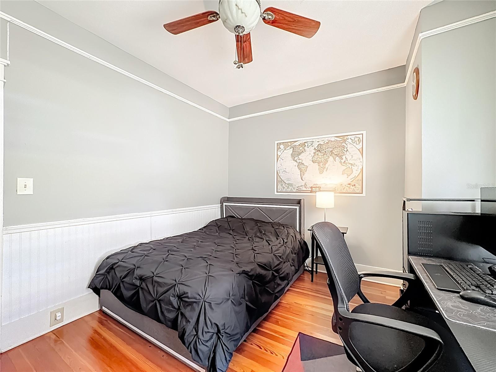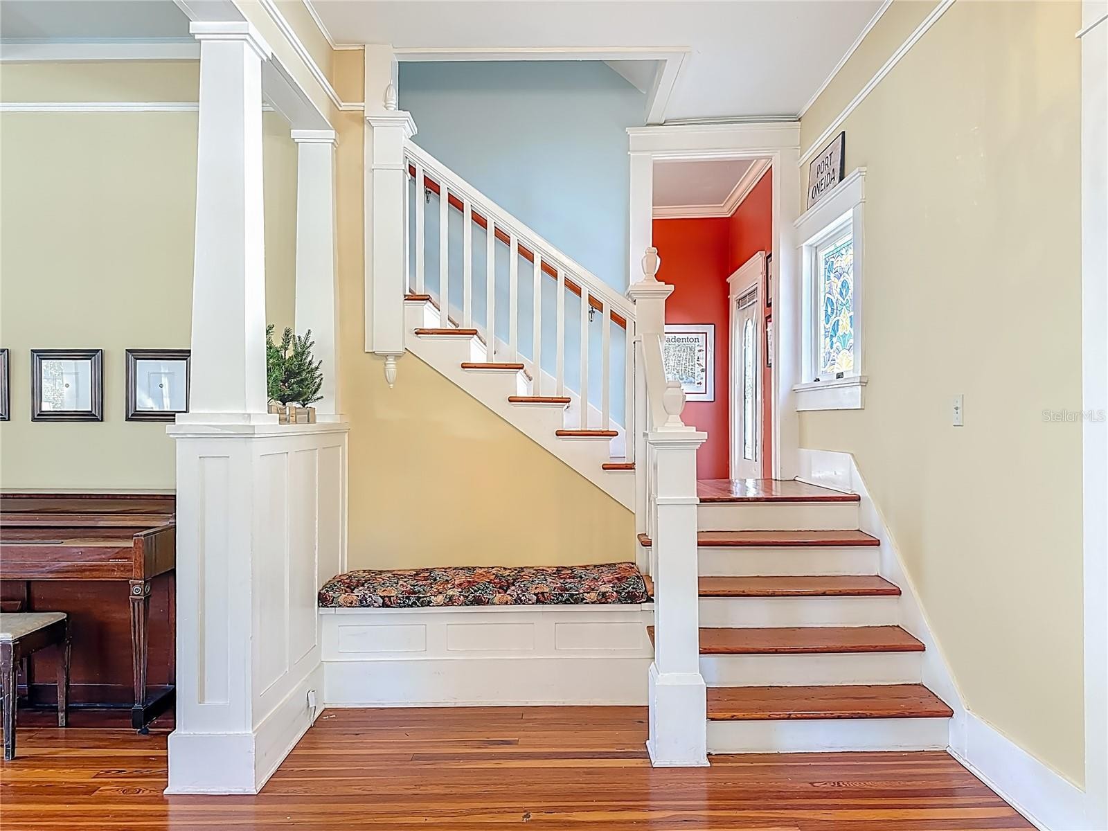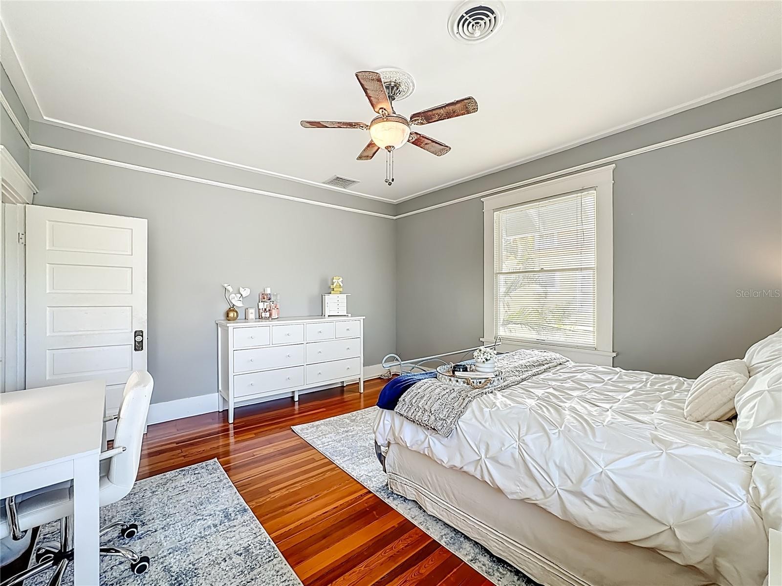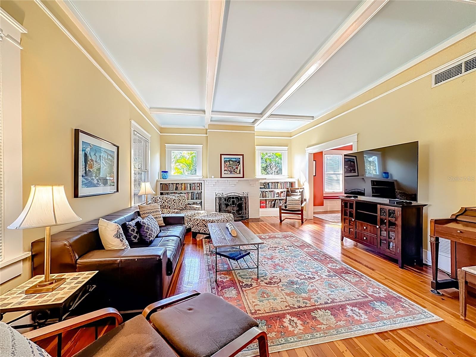 Where History Lives Beautifully — A 1914 Downtown Bradenton Classic! This historic home showcases the timeless craftsmanship and architectural character of early Florida residences. Designed for the subtropical climate, the home features high ceilings, generous windows, and a welcoming wraparound front porch that expands the living space and reflects the relaxed elegance of a bygone era. A coffered wood ceiling adds architectural depth, while hardwood floors, solid interior doors, and classic trim details enhance the historic appeal. The main home features 3 bedrooms and 2.5 baths. Working wood-burning fireplaces are featured in the living room, dining room, and primary bedroom. The primary suite includes an adjoining bonus room ideal for a nursery, office, or fitness space, a walk-in closet, and a renovated ensuite bath with double vanity, walk-in shower, and private water closet. The updated kitchen blends classic charm with modern functionality and includes stainless steel appliances, a double-oven five-burner gas range, dishwasher, and built-in wine cooler. The spacious dining room comfortably accommodates gatherings of family and friends, creating a warm setting for memorable meals. Recent improvements include a new roof and gutters (2025), exterior paint, replacement of the wood deck, stairs, and landing to the garage apartment, and a new rear fence (all 2024). Additional updates include A/C systems replaced in 2019 and 2023, and spray foam insulation added to the attic for improved energy efficiency. A separate garage apartment offers flexibility with one bedroom, full bath, living room, and kitchenette—ideal for guests, extended family, or potential income. Located within walking distance to Old Main Street and downtown Bradenton, enjoy easy access to the Bradenton Public Market, restaurants, boutiques, library, and museums. A rare opportunity to own a historic home with modern livability in the heart of the city.