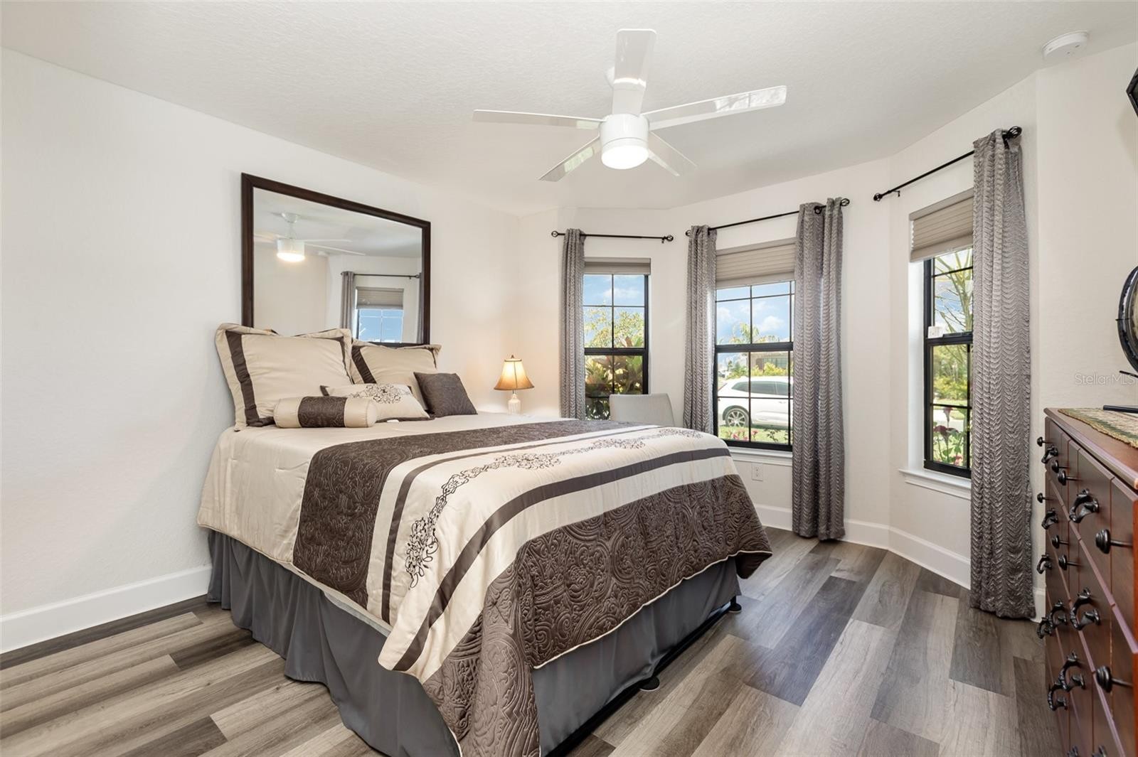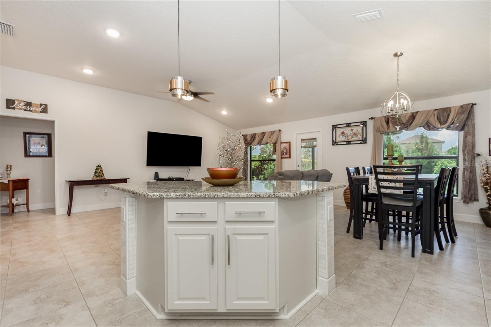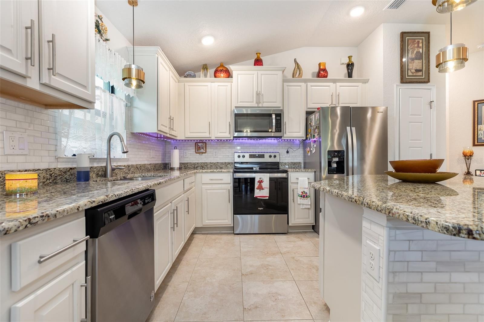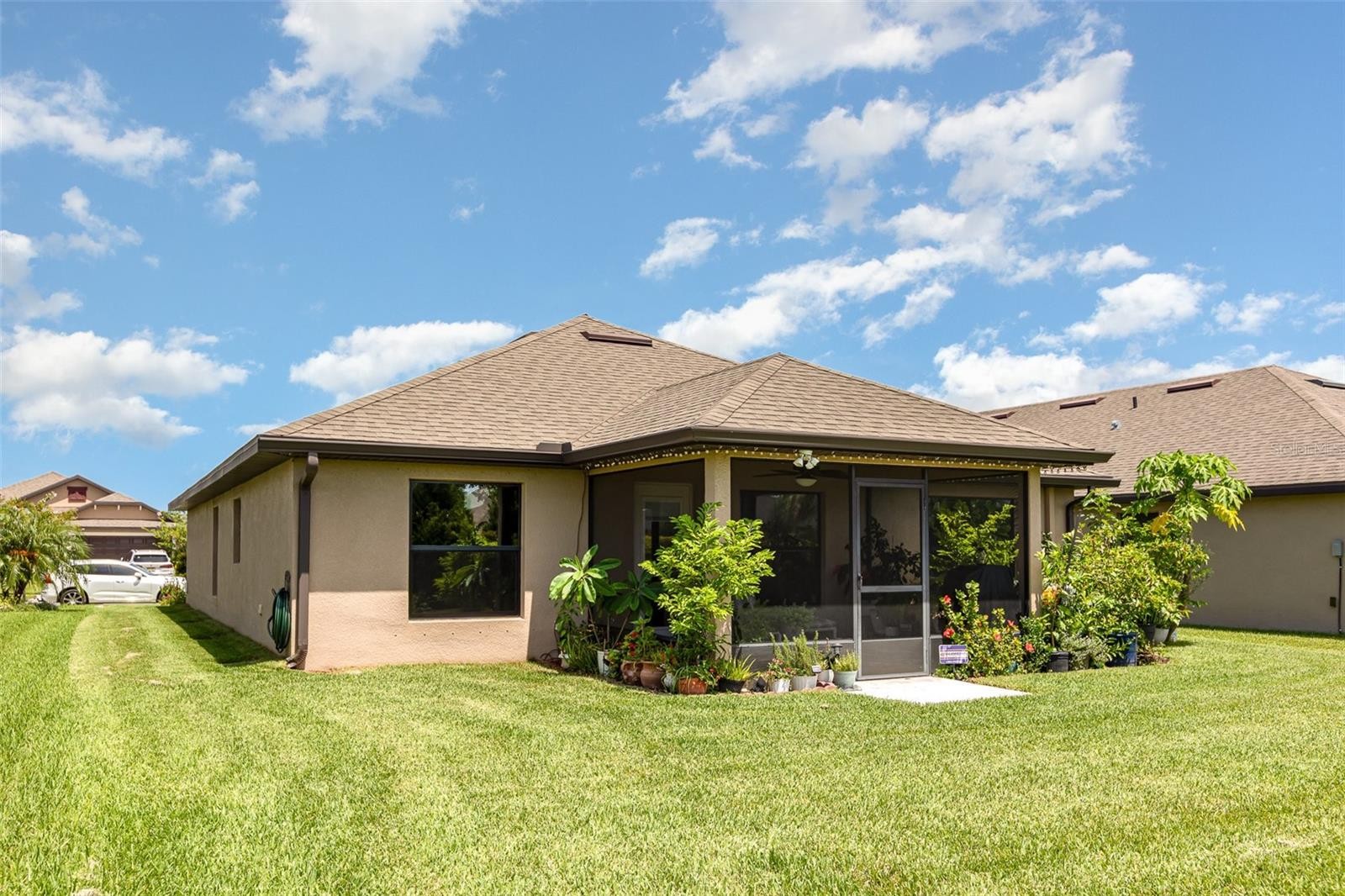 Welcome to this beautifully upgraded 3-bedroom, 2-bath home in Aviary at Rutland Ranch, where style, comfort, and functionality blend seamlessly. Step inside and discover spacious living areas adorned with durable tile flooring and elegant designer ceiling fans and lighting, creating an inviting ambiance. All three bedrooms offer a warm retreat with luxury vinyl plank flooring and ample closet space. The heart of this home is its gourmet kitchen, a true chef's delight featuring soft-close solid wood cabinets with crown molding, gleaming granite countertops, a custom backsplash, and stainless steel appliances, all complemented by a convenient closet pantry. Escape to the large primary suite, a peaceful sanctuary boasting a luxurious en suite bath. This spa-like space includes dual vanities, granite countertops, stylish fixtures, and a spacious walk-in closet. The home's split floor plan ensures privacy, with two additional bedrooms sharing a well-appointed bath featuring granite countertops and updated fixtures. Step outside to your screened rear lanai, perfect for relaxing or entertaining while enjoying the Florida lifestyle year-round. The two-car garage features an epoxy-coated floor for durability and a polished look. Beyond the aesthetics, this home boasts practical updates for enhanced comfort and peace of mind, including tinted windows for energy efficiency and privacy, a whole home surge protector for added protection, and sustainable landscaping with three producing sugar apple trees, a thriving blackberry plant, and newly established papaya. Living in Aviary at Rutland Ranch grants you access to top-tier community amenities, including a heated resort-style pool, playground, pickleball and basketball courts, and scenic walking trails. Perfectly located just minutes from breathtaking beaches, popular local attractions, shopping, and dining, this home offers the ideal mix of tranquility and convenience
