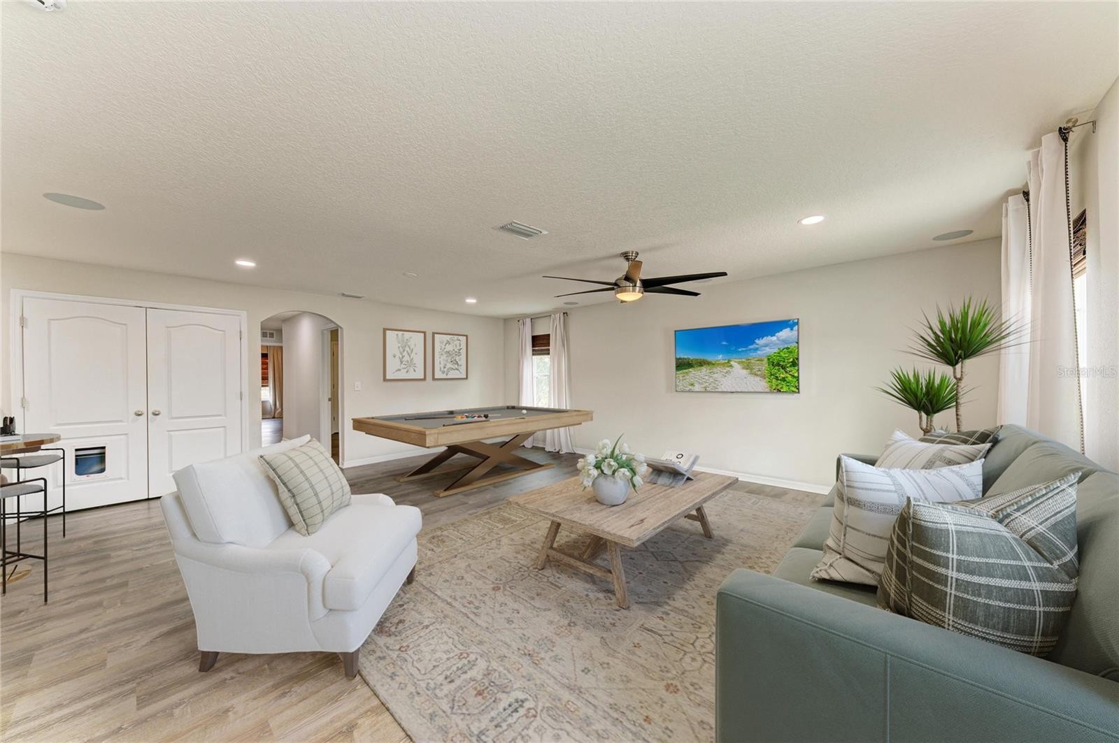 One or more photo(s) has been virtually staged. Welcome to your dream home in Bradenton, FL! Discover your slice of paradise in this stunning 4-bedroom, 2.5-bath residence that offers an exceptional blend of modern upgrades and serene privacy. Featuring multiple living spaces and boasting an impeccably refreshed spacious and bright floorplan, this large residence offers an abundance of natural light and modern elegance, with no carpet in sight—ceramic tile and luxury vinyl plank flooring flow seamlessly throughout. Enjoy the peace of mind with a NEW ROOF (2025) and NEW HVAC system (2024). Step inside to discover designer touches throughout. The completely revitalized interior, has been freshly painted, features custom blinds and window treatments in every room, a powder room that feels like a magical jewel box, custom lighting, ceiling fans, and LED can lighting throughout for a bright, inviting ambiance. The gourmet kitchen shines with brand new stainless steel appliances (2025), quartz countertops, a custom marble backsplash, an oversized stainless-steel sink, built-in wine rack, new disposal, tons of counter and cabinet space, ample counter seating and new kitchen faucet—perfect for culinary enthusiasts. Oversized sliding doors in the adjacent living room frame stunning backyard views. A massive bonus room upstairs includes a 65” Samsung TV and surround sound for the ultimate in entertainment. There are closets galore in this house so no need to worry about storage needs! Florida living is elevated with a freshly painted exterior, hurricane shutters, an impact-resistant garage door, screened lanai, and a fully fenced yard offering ultimate privacy—no neighbors to the north or behind, with protected green space ensuring nothing can ever be built there. Savor breathtaking sunsets from your serene outdoor oasis. The oversized garage provides ample storage, and this home's excellent condition makes it move-in ready. Ideally located near I-75, pristine Gulf beaches, UTC shopping, Sarasota airport, downtown Sarasota, and downtown Bradenton, convenience is at your doorstep. Don't miss this turnkey gem—schedule your showing today! Seller is a licensed Florida Realtor.