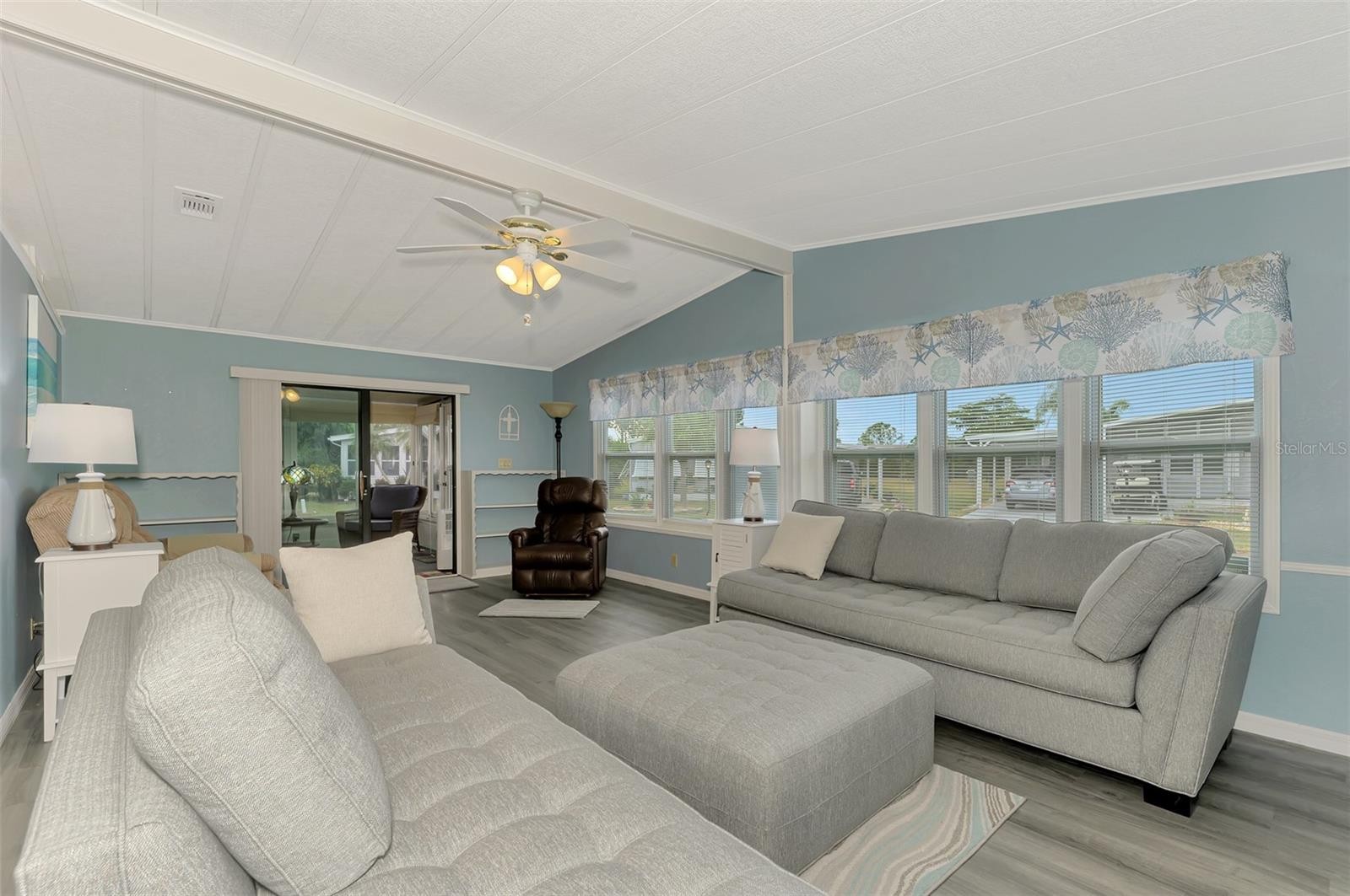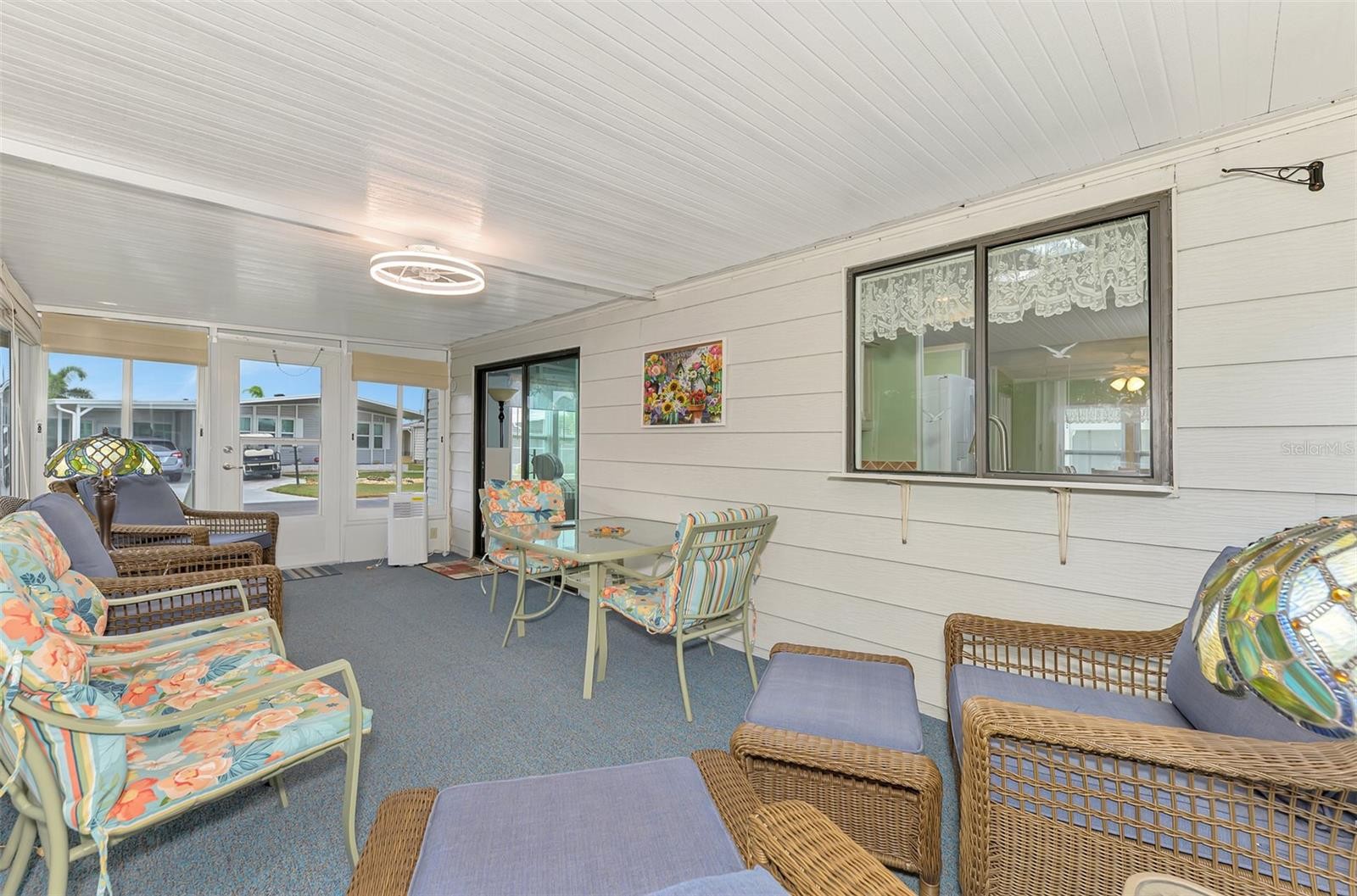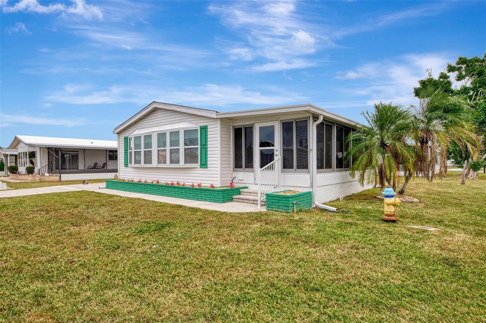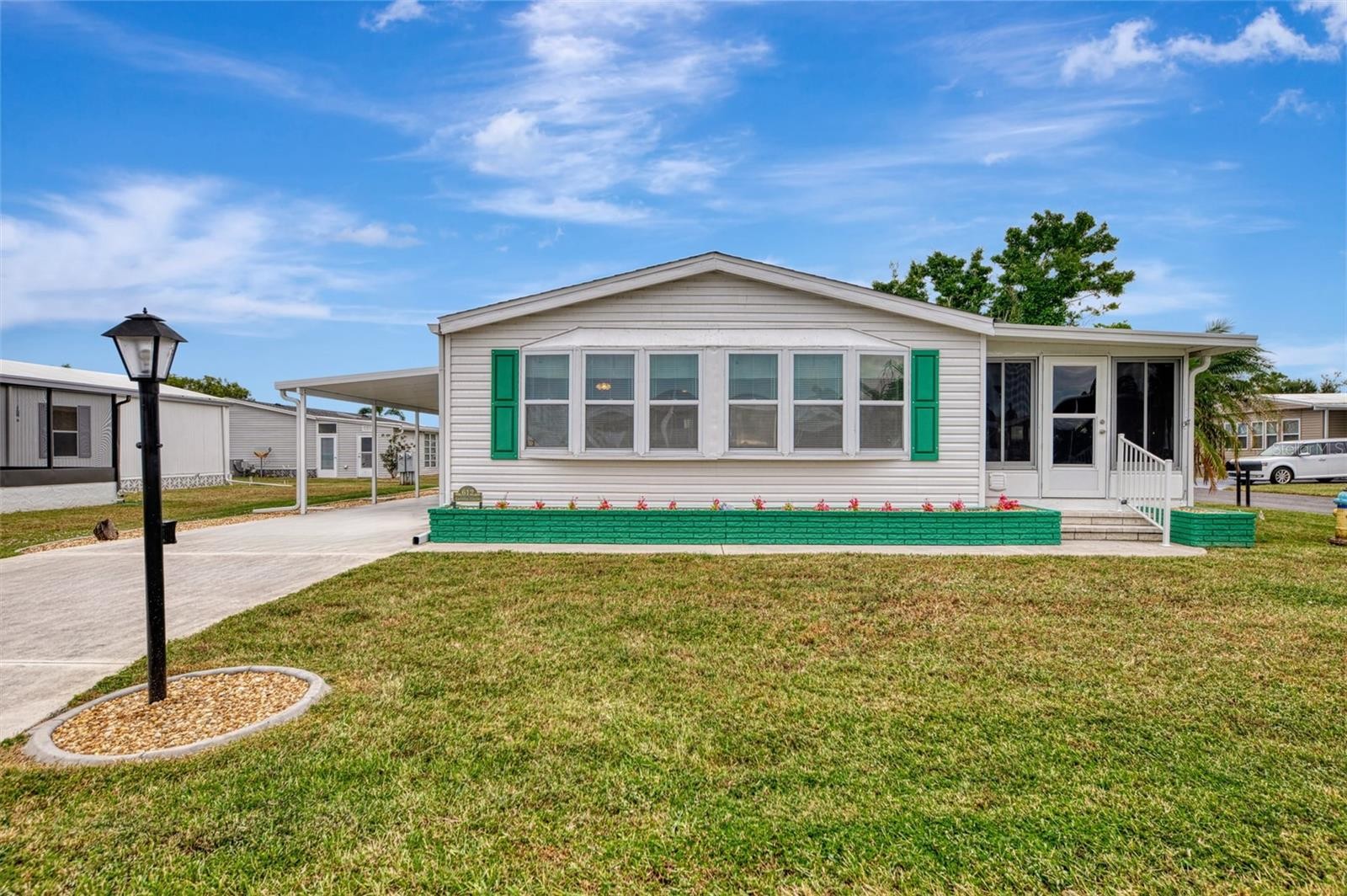 You’ll love this beautifully maintained Turn Key 2-bedroom, 2-bath home, where thoughtful design and modern updates come together in perfect harmony. Located in the friendly 55+ Mobile Home Community of “La Casa”, this home features a new AC unit (2023) with a humidistat and ceiling fans that ensures year-round comfort, newer windows, acrylic Florida room panels (2022), a brand-new shingle roof (2022), and a fresh carport and vinyl siding (2023)—all adding peace of mind and lasting value. From the moment you step inside, you’ll notice how much care and detail have gone into creating a space that feels both inviting and practical. The entryway sets the tone with a built-in desk and cabinets—ideal for organization or creative projects—along with easy access to the guest bath. Move into the heart of the home, where the kitchen shines with its smart layout and upgraded features. A solar tube skylight fills the space with natural light, while the new sink, disposal, faucet, and modern glass cooktop add a sleek, contemporary feel. The living room offers a seamless flow to the enclosed Florida room, a carpeted and vinyl-wrapped space filled with sunshine—perfect for enjoying a quiet morning or relaxing in the evening. A sliding door opens to the front walkway, blending indoor comfort with outdoor charm. The guest bedroom features a convenient Murphy bed and two double closets, maximizing space and functionality. The guest bath includes a tub/shower combo, linen closet, and modern vanity for a polished look. The primary bedroom is spacious and comfortable, featuring two double closets and an adjoining bath with a walk-in shower, linen storage, and updated cabinetry for a fresh touch. Throughout the home, new Pergo flooring enhances the open feel, while vaulted ceilings in the kitchen, dining, and living areas add to the airy atmosphere. The utility room includes a large washer and dryer, new plywood walls, and plenty of space for storage. Outside, the landscaped yard shines with custom curbing, pebble stones, and a vibrant foxtail palm, offering a relaxing outdoor setting. Perfectly situated on a corner lot, this home blends comfort, quality, and charm—ready for you to move in and enjoy every thoughtful detail. Centrally located, close to shopping plazas and restaurants! Call to schedule your private tour!