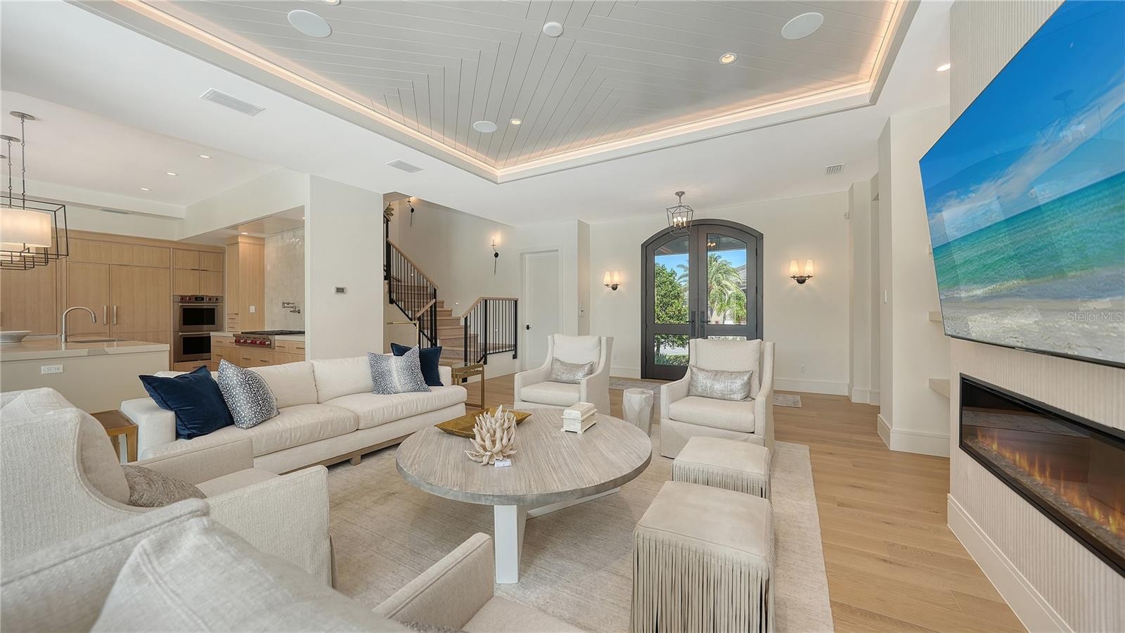 Built in 2022 by Voigt Brothers and designed by Arieno Custom Home Design, this new impeccable waterfront estate pairs sleek contemporary architecture with the comforts of elevated Bird Key living. Nestled along deep sailboat water just off Sarasota Bay, this Bird Key home spans over 4,700 square feet of beautifully finished interiors, seamlessly integrated with an expansive outdoor living experience. A pavered circular driveway framed by manicured landscaping welcomes you to this modern coastal residence. The elevated two-story design features a durable metal roof, impact-rated glass throughout, and an oversized two-car garage complete with epoxy flooring, mini-split A/C, storage, and elevator access. Inside, a blend of thoughtful engineering and elegant design unfolds—highlighted by solid hardwood floors, soaring 10’ and 12’ ceilings, Lutron-controlled lighting and shade systems, and walls of pocketing sliders that merge indoor and outdoor spaces with effortless grace. The heart of the home is a gourmet kitchen designed to both impress and perform. Anchored by a massive quartz-topped island, it features professional-grade Wolf appliances, hidden range hood, double built-in ovens, 6-burner gas Wolf cooktop with pot filler, and custom cabinetry offering abundant storage. A wine cooler with refrigerator drawers, prep sink, and dedicated Butler’s pantry with built-in desk enhance everyday functionality. This culinary hub flows into the dining room and great room, where a gas fireplace, tray ceiling, and custom floating shelves set a refined tone. The main-level primary suite offers a private retreat, with vaulted ceilings, its own dedicated laundry room, French door access to the terrace, a spa bath with soaking tub and rainfall walk-in shower, and a custom closet system designed to accommodate two wardrobes. Completing the main level is the office and impressive club room that offers additional lounge space with media potential, opening directly to the outdoor lounge for effortless entertaining. Upstairs, a loft-style family room currently serves as a fitness area, alongside three spacious guest suites with walk-in closets, a second laundry room, and a morning bar for added convenience. Take the elevator or ascend the bespoke staircase to access every corner of this thoughtfully designed home. Outside, two levels of resort-style entertaining spaces include a covered lanai with summer kitchen, electronic screens, and multiple seating areas. The heated pool and spa feature a sun shelf and tranquil waterfall. At the water’s edge, a new seawall supports a dock with four-post platform lift, offering direct access to the open waters of Sarasota Bay and beyond. Located in the sought-after Bird Key neighborhood, residents enjoy a private island lifestyle just minutes from downtown Sarasota, St. Armands Circle, and Lido Beach. Indulge in boutique shopping, fine dining, and the area’s renowned cultural scene including theaters, art galleries, and the marina. Optional membership to the Bird Key Yacht Club offers additional opportunities for boating, tennis, and social engagement. This is coastal living redefined—crafted with intention, and ready for your next chapter.