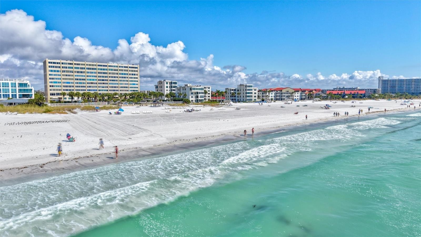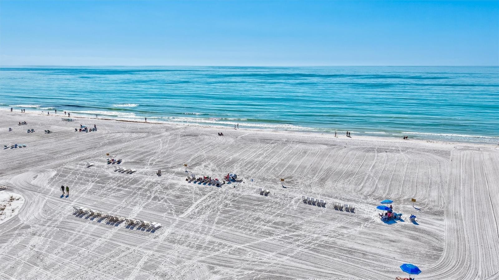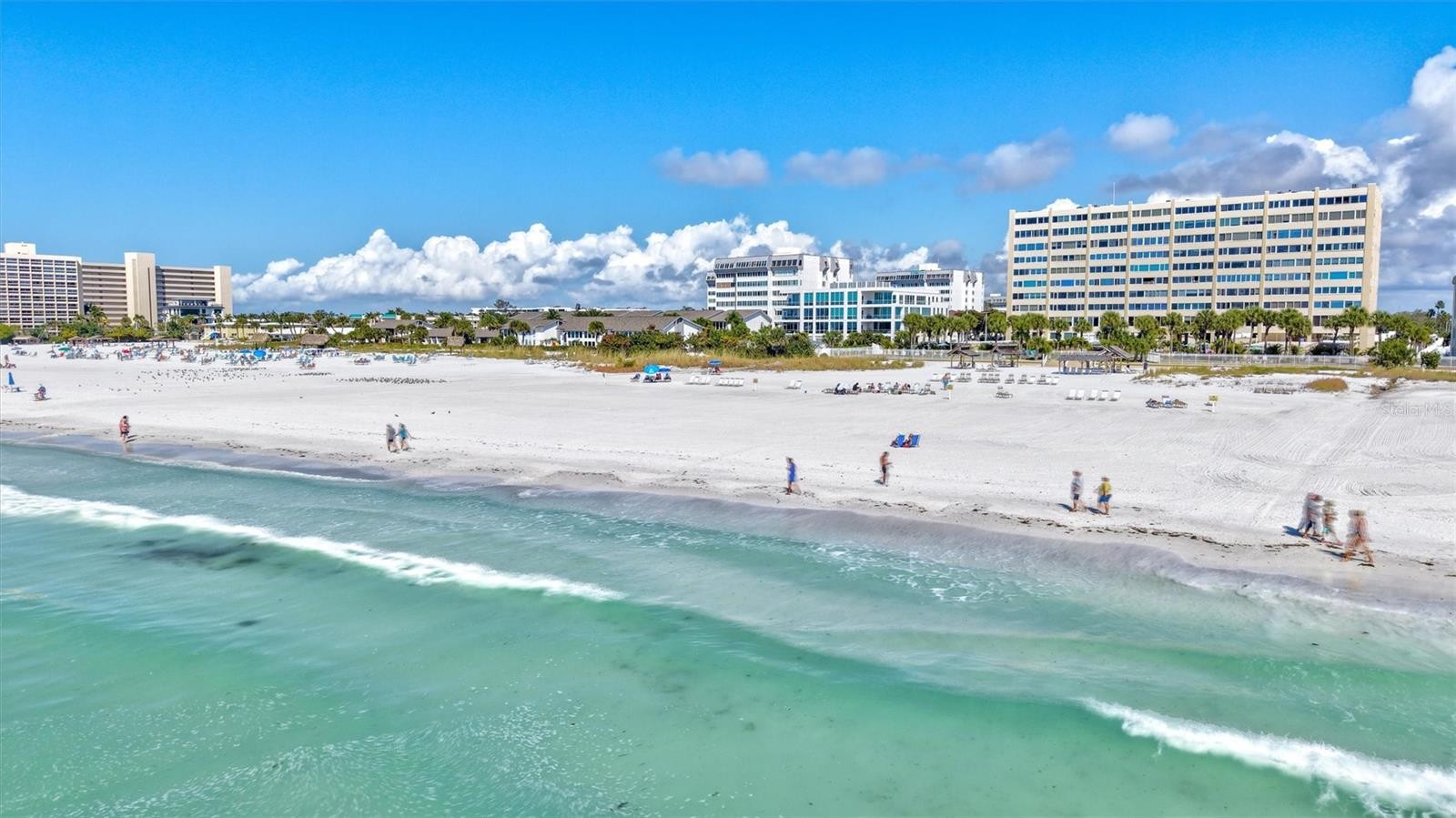 Experience the ultimate Siesta Key beach get-away in your TURNKEY FURNISHED, west-facing condo at Horizons West and just steps from your private beach with plenty of beach chairs and five sun cabanas. Enjoy the crystal sands of Crescent Beach where the sand is always cool and you’ll never miss a sunset. This spacious 1-bedroom retreat boasts over 1,000 sq. ft. and has tiered ceilings up to 9 ½ feet. The west facing wall of oversized 6-foot-high impact windows frame breathtaking panoramic Gulf, beach, resort pool and sunsets sunset views, including dolphin sightings. Perched above the lobby and mezzanine, use the elevator to enter this bright and cheerful end-unit with west and south facing windows in the living room. Enjoy an open, airy floor plan with a designer kitchen featuring stone countertops, stainless appliances, and a breakfast bar. The generously sized bedroom has south and east facing windows and an en-suite bathroom with a beautifully tiled walk-in shower. Resort-style amenities abound: 300 ft. of private beach, two pools, spa, cabanas, grills, and a bayside park with day dock. This unit comes with private carport storage for all your beach toys. Hop on the free Siesta Key trolley for world-class dining and shopping. Come see why Siesta Key is ranked the #1 Beach in the USA and #4 in the world—your piece of paradise awaits!