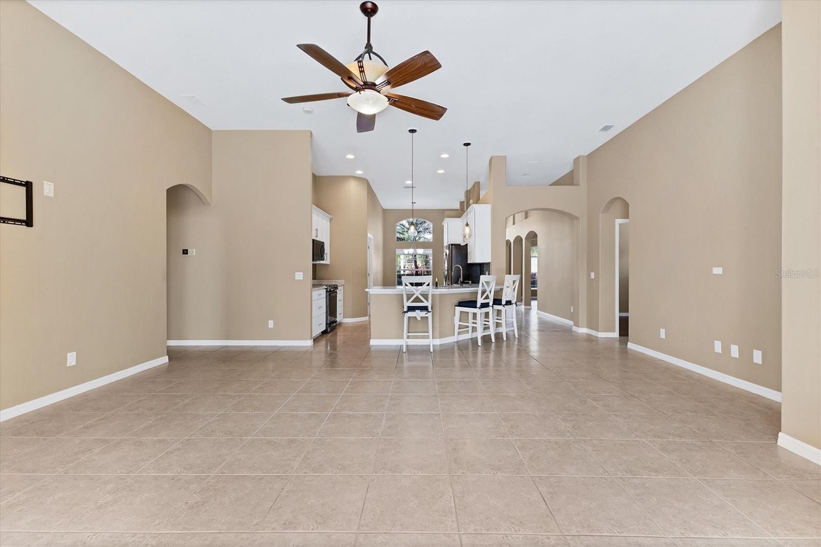 Open the dramatic double front door to appreciate this lovely executive home with generous space and affording a perfect lifestyle. In popular Mote Ranch, this home boasts four bedrooms, three baths and a stunning private pool, in 2,300 square feet of living space. Upon entering, the dining area adjoins a living room, ideal for a sofa and entertaining area. Leading into the great room, the soaring ceilings add much ambience to the home. The great room boasts sliding glass doors to the large pool area. Lots of space to entertain your friends. The kitchen has received a makeover with drawers and a new pantry added in 2023. The white cabinetry has been upgraded with 42-inch cabinets. The kitchen offers stunning Consentino Silestone counters, with an anthracite granite sink and Blanco faucet. The counter has a pop-up USB and 3E prong outlet for charging electronics. New pendant lights above the seated area in kitchen and glass subway tile backsplash. The primary bedroom is apart from the other bedrooms, adding quiet privacy! It has a beautifully tiered ceiling with crown molding. Two walk-in closets are located before entering the primary bath. The large bath offers two vanities and a walk-in shower with new sliding glass doors. A door opens onto the lanai area. All bath cabinetry has been refaced and drawers added. There are an additional bedroom and bath with a shower that can serve as a pool bath. The other two bedrooms share a full bath. The shimmering pool has new LED lights, a changing multi-colored light, glimmering in the pool and mounted LED lights surrounding the pool. The waterfall is an added distinctive feature. It is a saltwater pool with a solar system to heat the pool. The lanai was rescreened with upgraded screens. Numerous decorator’s touches throughout the home. Front doors have impact glass and are fiberglass. Upgraded crown molding in living room and dining room, porcelain tile and Tesoro wood-look porcelain plank in the living room, great room, all bedrooms and closets. Other features include Daikin air conditioner, new water heater, whole-house water purification, professional landscape and lanai lighting, and top-down blinds. All bath cabinets refaced and drawers added. Storm Smart hurricane lanai/patio screen. There are upgraded ceiling fans in bedrooms and great room with a light. The separate laundry room offers a laundry sink and washer, dryer and new built-in cabinetry for storage. There is a two-car garage with built-in upper storage. The attic is floored. The front area and driveway boast new pavers and 4-foot-wide extension on the driveway. There are hurricane shutters for storm protection and a whole-house alarm system. Mote Ranch has low HOA fees and no CDD. There is a community Junior Olympic pool, a playground, and a dock for kayaks and canoes to launch into the Braden River. In popular Mote Ranch, the home is close to UTC Mall, SRQ, restaurants, shopping and more. Convenient!
