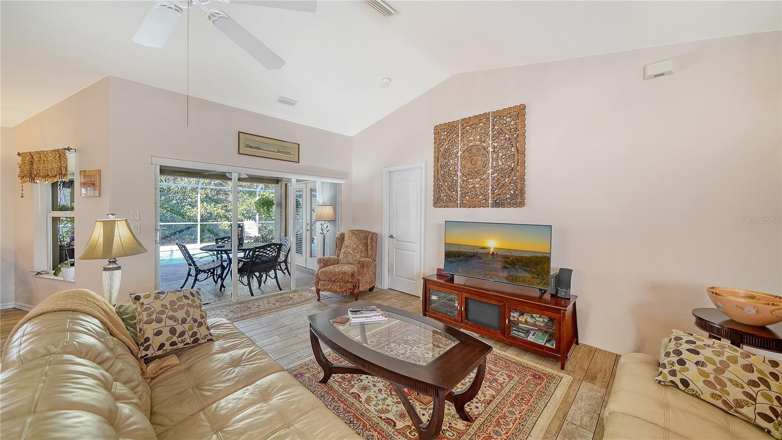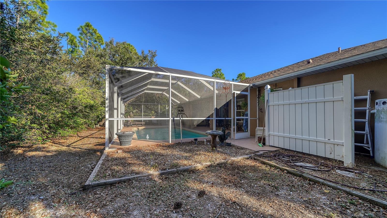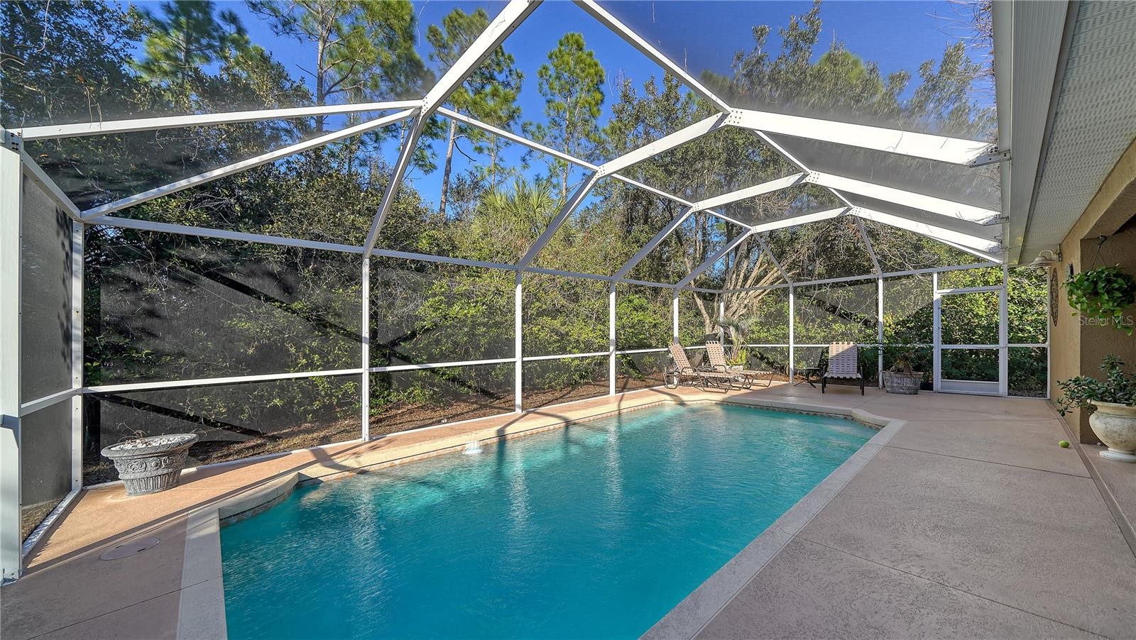 Located in the quiet and tranquil estates section of North Port, this Florida ranch style pool home checks all the boxes and is the only 3/2 pool home under $400k in the estates section of North Port. Starting with the exterior, the large lot is surrounded by lush vegetation on three sides for ultimate privacy and the large 6 car driveway provides plenty of parking for all your guests. The 2-car garage also features new garage door screen sliders to keep the cool breeze in and mosquitos out when working in the garage. Enjoy peace of mind with a newer roof (2022) and storm shutters for all the windows. Walk through the double front door entry and be amazed by the vaulted ceilings and true open concept. The large great room combines the living room, kitchen, and dining area to perfection with views of the pool from every angle making it the perfect space for entertaining and relaxing, simply put, the heart of the home. This 3 bedroom, 2 bathroom home features beautiful wood-look ceramic tile throughout (1 flooring) and ceiling fans in every room. The large master bedroom features his/her walk-in closets, French door access to the pool, and en-suite with dual vanity. Bedrooms 2 and 3 are also of ample size with large built-in closets and are located next to the guest bathroom, which has access to the pool. Enjoy true Florida living as you soak in the beautiful, heated pool year-round. The pool area gives off lagoon vibes with nothing but views of lush vegetation. NO HOA and NO CDD fees! Location, location, location...just minutes away from I-75, shopping, dining, and some of the best beaches Florida has to offer. Schedule your private showing today!