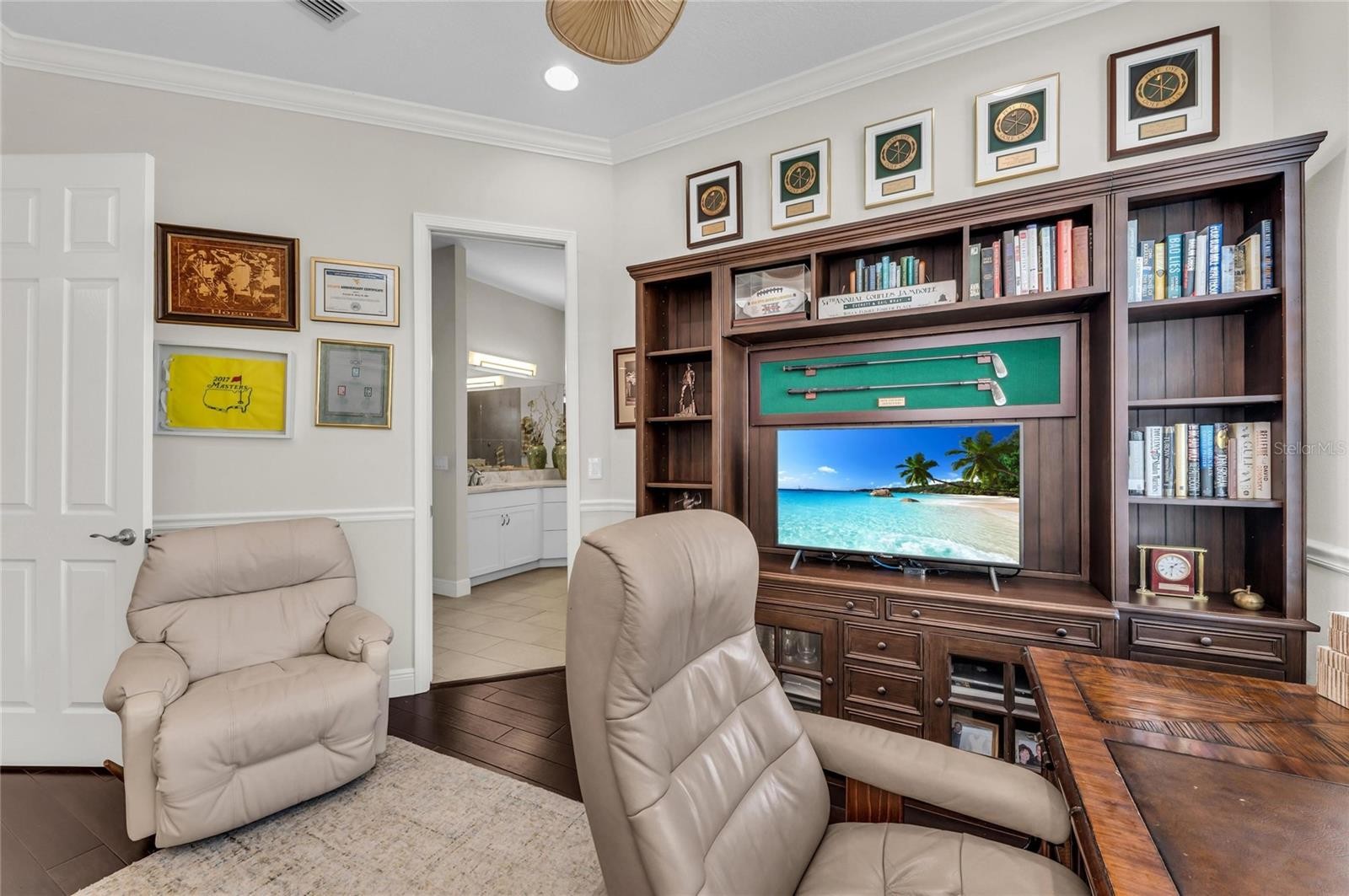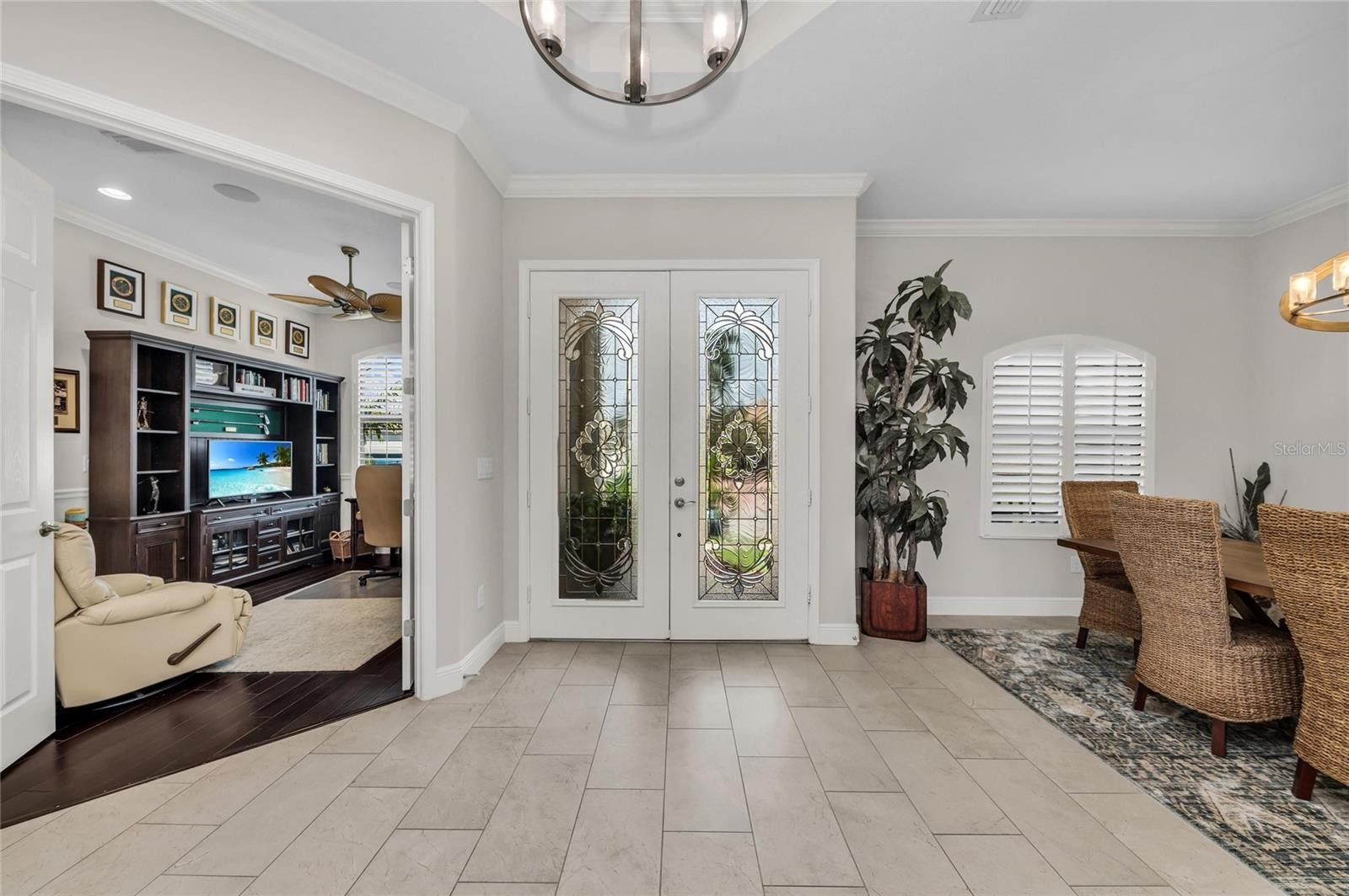 Welcome to a stunning 4-bedroom, plus office, home nestled in the gated Legends Bay neighborhood. This beautifully designed, energy-efficient residence offers the perfect blend of indoor and outdoor living. With its premium construction technology, including elevated stem wall construction, impact windows, and concrete block construction, this home provides comfort and reduced insurance costs. The heart of the home is a spacious and inviting gourmet kitchen, complete with top-of-the-line appliances and exquisite quartz countertops. The bright and cheerful design features designer lighting, crown molding, tray ceilings, plantation shutters, custom closet built-ins, and more. Tall impact sliding glass doors open to the outdoor area, offering an outdoor oasis with lovely water view. Residents of Legends Bay enjoy a prime location with convenient access to beaches, shopping, and cultural venues. Golf cart accessible to IMG. Book your tour to see this exceptional home!