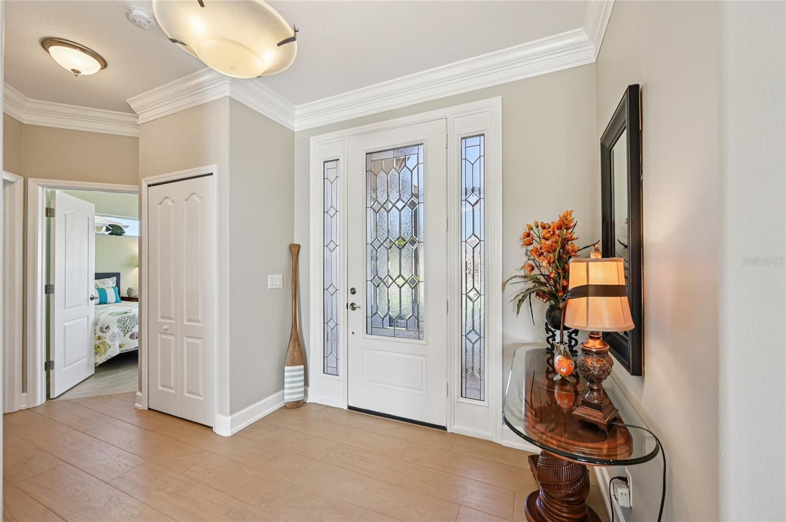 Welcome to relaxed pond-front Florida living at its finest in Park Forest. This fully furnished Garnet model, offering 3 bedrooms, 2 bathrooms, and a 2-car garage, blends comfort, beauty, and the ease of a maintenance-free and golf cart friendly community. From the moment you arrive, the home’s tropical curb appeal and screened front entry with a leaded glass door create a warm welcome. Step inside to find a bright and spacious great room with crown molding, volume ceilings, plantation shutters, oversized baseboards, and new wood-look tile floors that flow throughout the main living areas. The open layout makes it easy to enjoy everyday life or entertain friends, with triple pocket sliders leading to the impact-glass-enclosed Florida room where you can relax and watch the wildlife that frequents the pond. The large kitchen features abundant 48-inch wood cabinets, granite countertops, a raised breakfast bar, and both under-cabinet and pendant lighting. The adjoining dining area offers a large window with lovely lake views and sliding doors for easy access to the Florida room, making entertaining effortless. The primary suite feels like a peaceful retreat with a tray ceiling accented by crown molding, a walk-in closet, and a private bath featuring dual sinks, granite counters, and a glass-door, fully tiled walk-in shower. Both guest bedrooms are spacious with reach-in closets, and the guest bath includes a large, fully tiled walk-in shower. The interior laundry room is thoughtfully designed with built-in cabinets and a granite-topped folding area for added convenience and storage. Impact windows and an accordion shutter for the front door provide peace of mind, while the maintenance-free lifestyle lets you enjoy community amenities such as the pool, tennis courts, and recreation center. There’s even on-site storage available for your boat or RV. Park Forest offers a full social calendar and a friendly neighborhood atmosphere, all less than 10 miles from Gulf beaches, world-class fishing, boat ramps, hiking trails, parks, golf courses, shopping, and medical facilities. This is a wonderful opportunity at 624 Barnacle Court to live your dream Florida lifestyle. Call today to schedule your private showing.