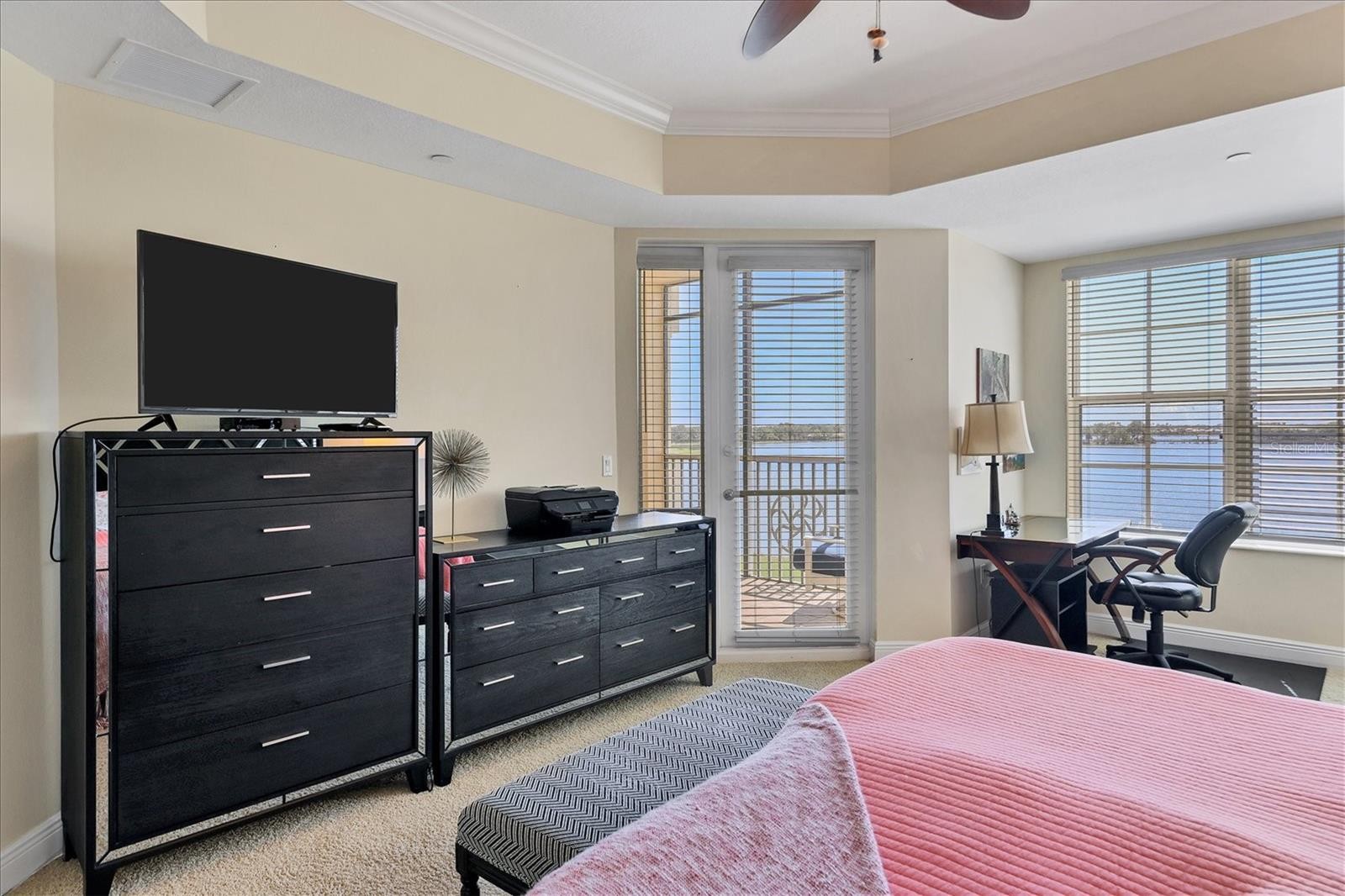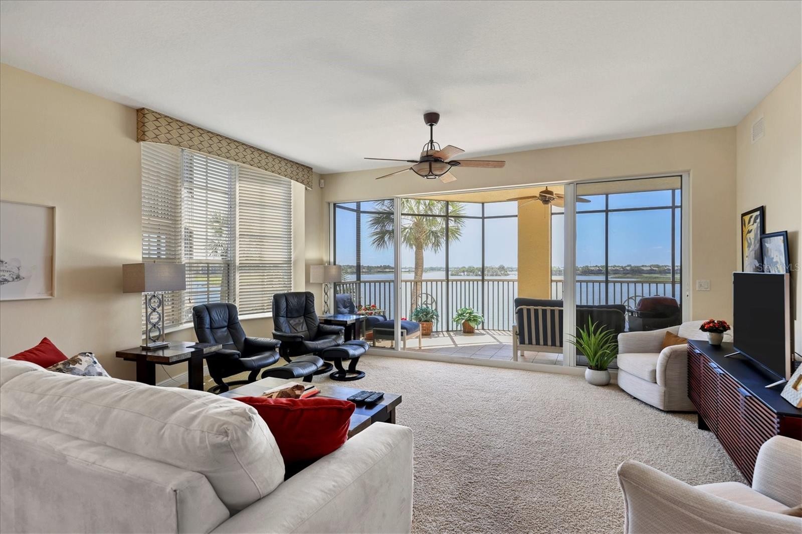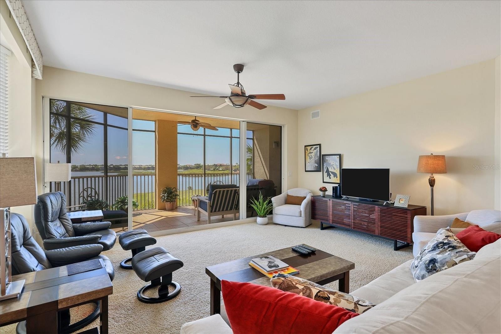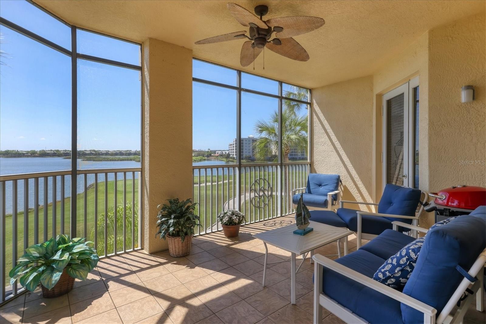 ONE OF THE BEST VIEWS IN WATERCREST! LAKEFRONT, CLEAN Three bedroom, Three bath, Two car enclosed garage, third floor END UNIT with a stunning view of Lake and Golf Course. FURNISHING'S OPTIONAL Sought after Mirabel floor plan in Watercrest is poised in the middle of Lakewood Ranch overlooking 160 acre Lake Uihlein. Few minutes walk to Lakewood Main street with restaurants, boutiques, and more! Furnishings optional, and 1 year home warranty provided. This unit has one of the best views to enjoy from your Living Area, Primary Bedroom, and Large Screened/Covered Lanai! Large wall to wall sliding doors to fully enjoy the AMAZING view of the Lake! Primary Bedroom also has access to the Lanai, ensuite Bath with soaker tub, separate shower, and dual sinks, with two large walk-in closets. Kitchen is spacious featuring tall wooden cabinetry, granite counters, and a breakfast bar integrated with the dining area, and Great Room open floor plan. Being an end unit there are three large windows in the living area and LOTS of light. Guest bedrooms each have en-suite bathrooms! Bath #2 tub/shower combination, and Bath #3 has a stand up shower, and the 3rd bedroom has its own private juliette balcony! Laundry Room room is off the Hallway featuring a utility closet, full size washer & dryer, sink, and built in ironing board. Lakewood Ranch, is an award winning Master Planned community, has glorious weather, and a perfect location to all. Inland, and safe during storms. Golf Courses, world renowned Siesta, Lido, & Longboat Key, and Anna Maria Island Beaches, Boating, Fishing, Biking, walking trails, etc ...hobbies you can enjoy year round! Short drive to UTC Mall and numerous restaurants. Downtown Sarasota, a jewel of a city with Hip chic vibe, wonderful restaurants...Historic Bradenton, more wonderful restaurants and rooftop bars, and cultural venues to explore. Several international airports within an hour drive or less. Welcome to the Gulf Coast of Florida, a lifestyle second to none!