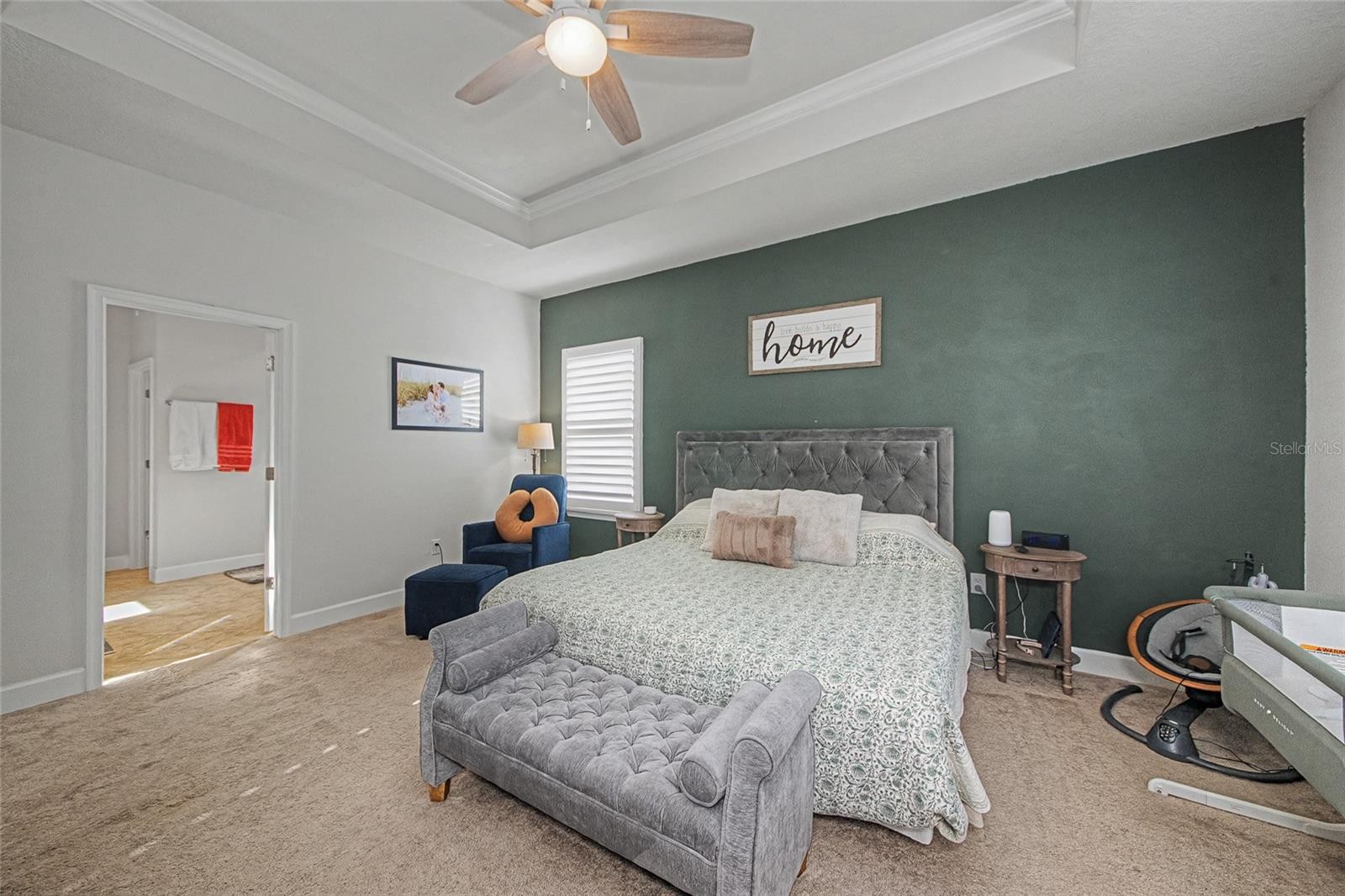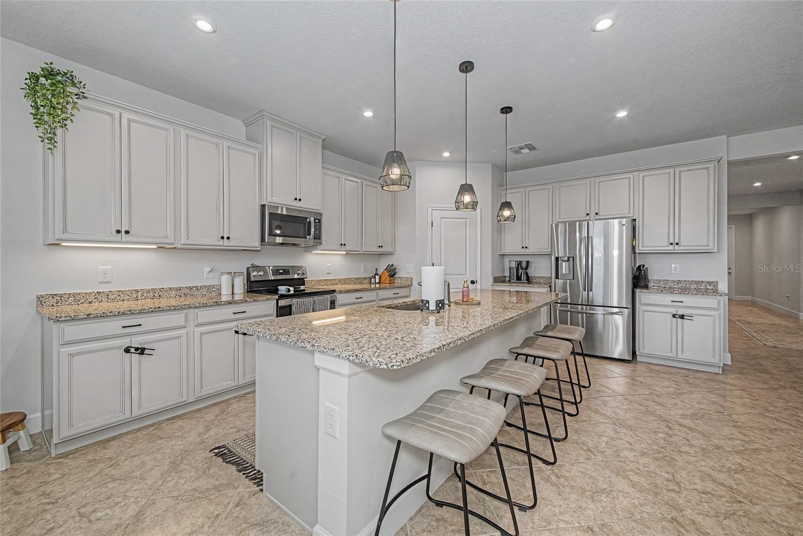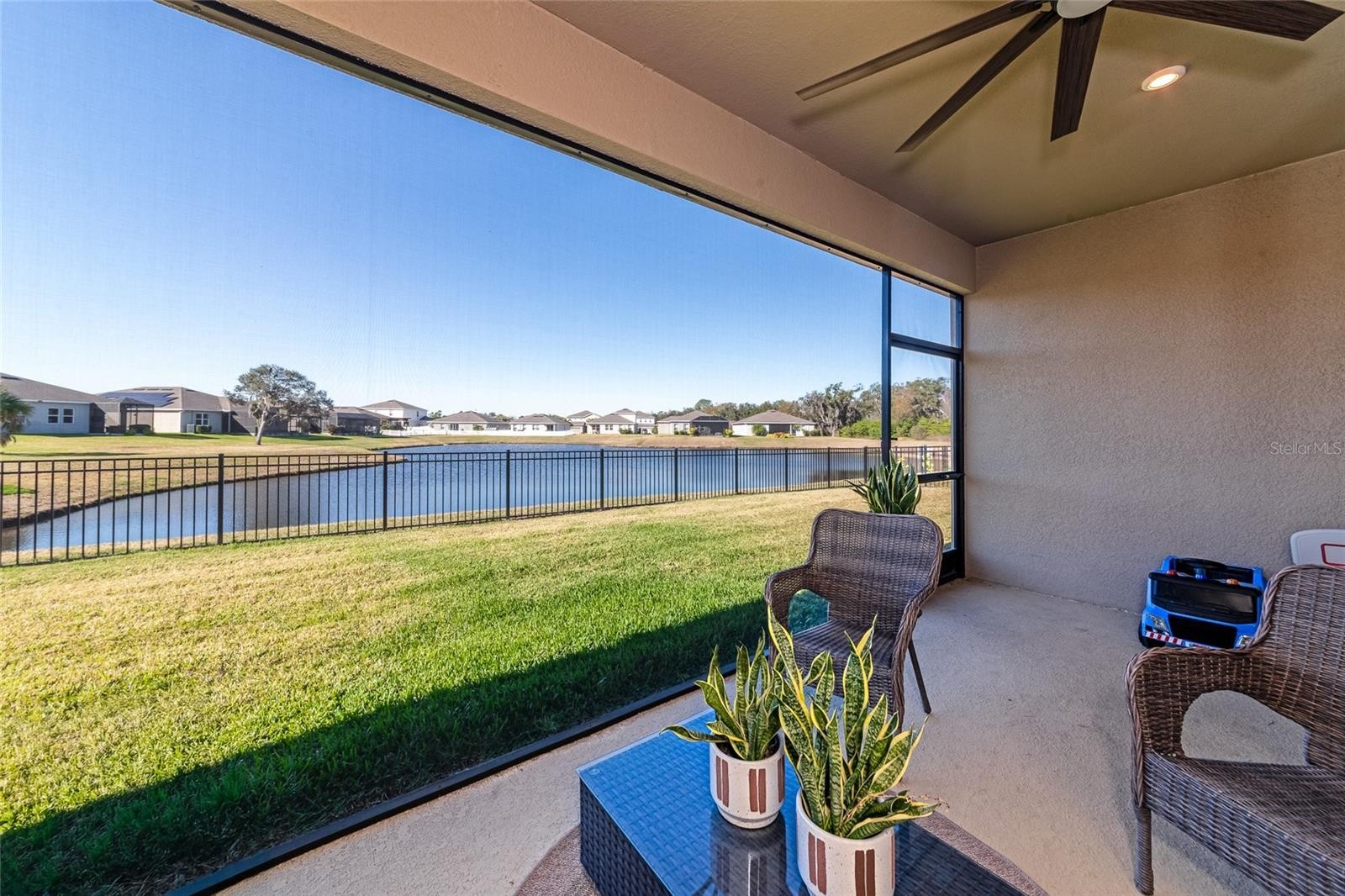 From striking curb appeal to countless modern upgrades, this exceptional home is sure to impress! The moment you step inside, you’ll appreciate the bright, open-concept layout featuring diagonally laid tile flooring throughout the main living spaces, upgraded designer ceiling fans in every room, and a grand double slider leading to serene, panoramic pond views. Just off the foyer, two spacious bedrooms showcase generous closet storage and share a beautifully appointed hallway bath with a dual-sink vanity, soaking tub, and premium cabinetry. Across the hall, past the oversized laundry room with abundant storage options, you’ll find a private ensuite bedroom, perfect for guests or extended family. The chef-inspired kitchen showcases a large center island, stainless steel appliances—including a Samsung French Door Refrigerator—and elegant lighting features with recessed high hats, pendant fixtures, and under-cabinet illumination, creating the perfect ambiance for entertaining and family gatherings. The sunlit dining area, surrounded by windows, fills the space with natural light. Gorgeous designer finishes complement the cabinetry, granite counters, and wall tones, blending harmoniously throughout. The luxurious owner’s suite features a tray ceiling adding architectural interest, expansive windows framing peaceful lake views, and a walk-in closet with ample space. The spa-style master bath offers a frameless glass Roman shower with built-in seating, a double-sink vanity, and upgraded cabinetry. A versatile study/den behind elegant French glass doors provides an ideal setting for work or relaxation. Step out to the screened lanai with aquarium-style windows, where you can unwind and take in the breathtaking Florida scenery, enhanced by rear yard lighting for nighttime enjoyment. A fenced-in yard offers privacy, security, and peace of mind along with a safe space for pets to play freely. The three-car garage provides plenty of storage and parking flexibility. With NO CDD fees and LOW HOA dues, residents enjoy access to a community pool, recreation area, walking trails, and dog park. Conveniently located near top-rated schools, shopping, and dining venues, this home offers the perfect combination of comfort, style, and location. Skip the wait—your dream home is ready today!