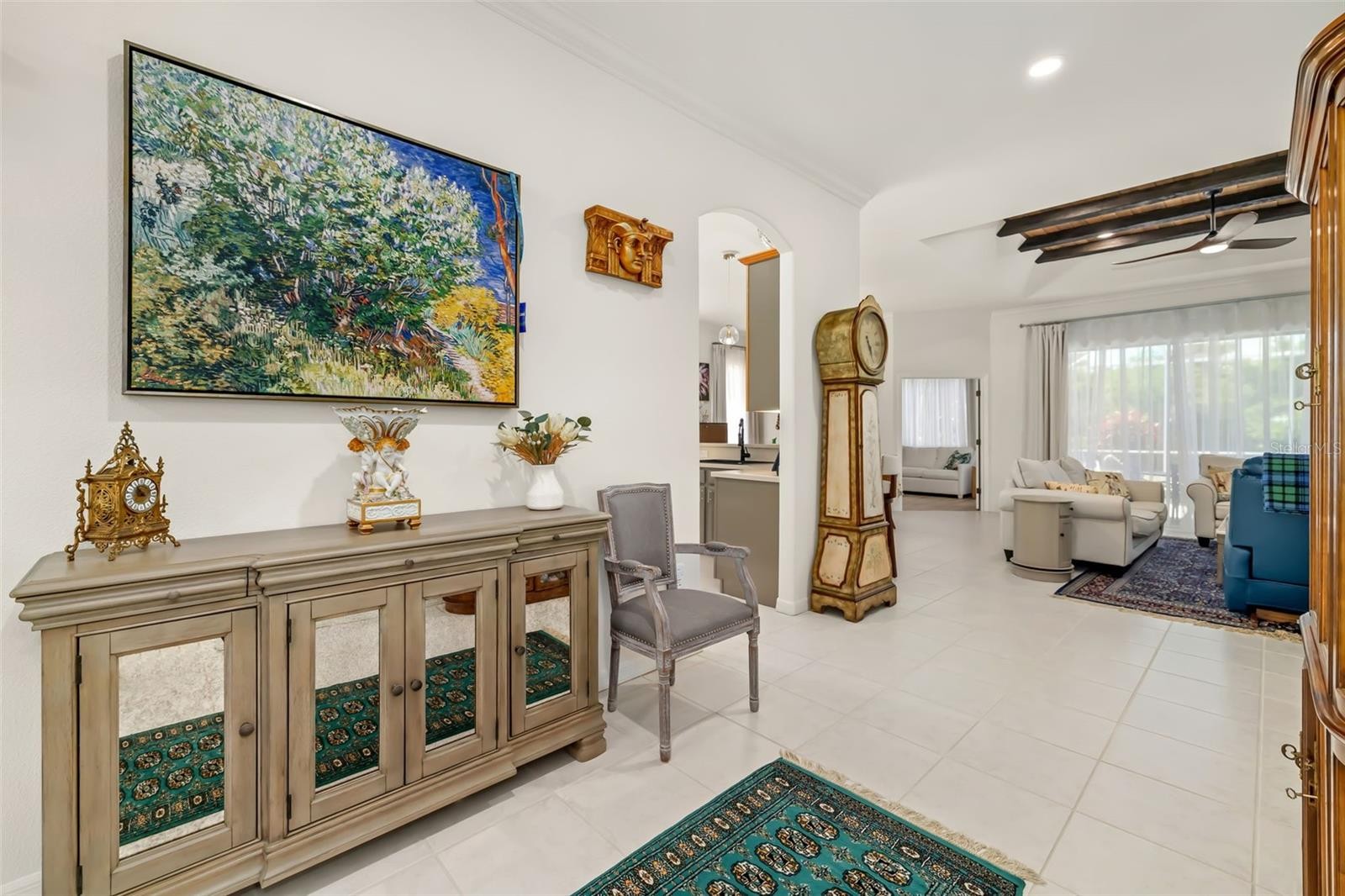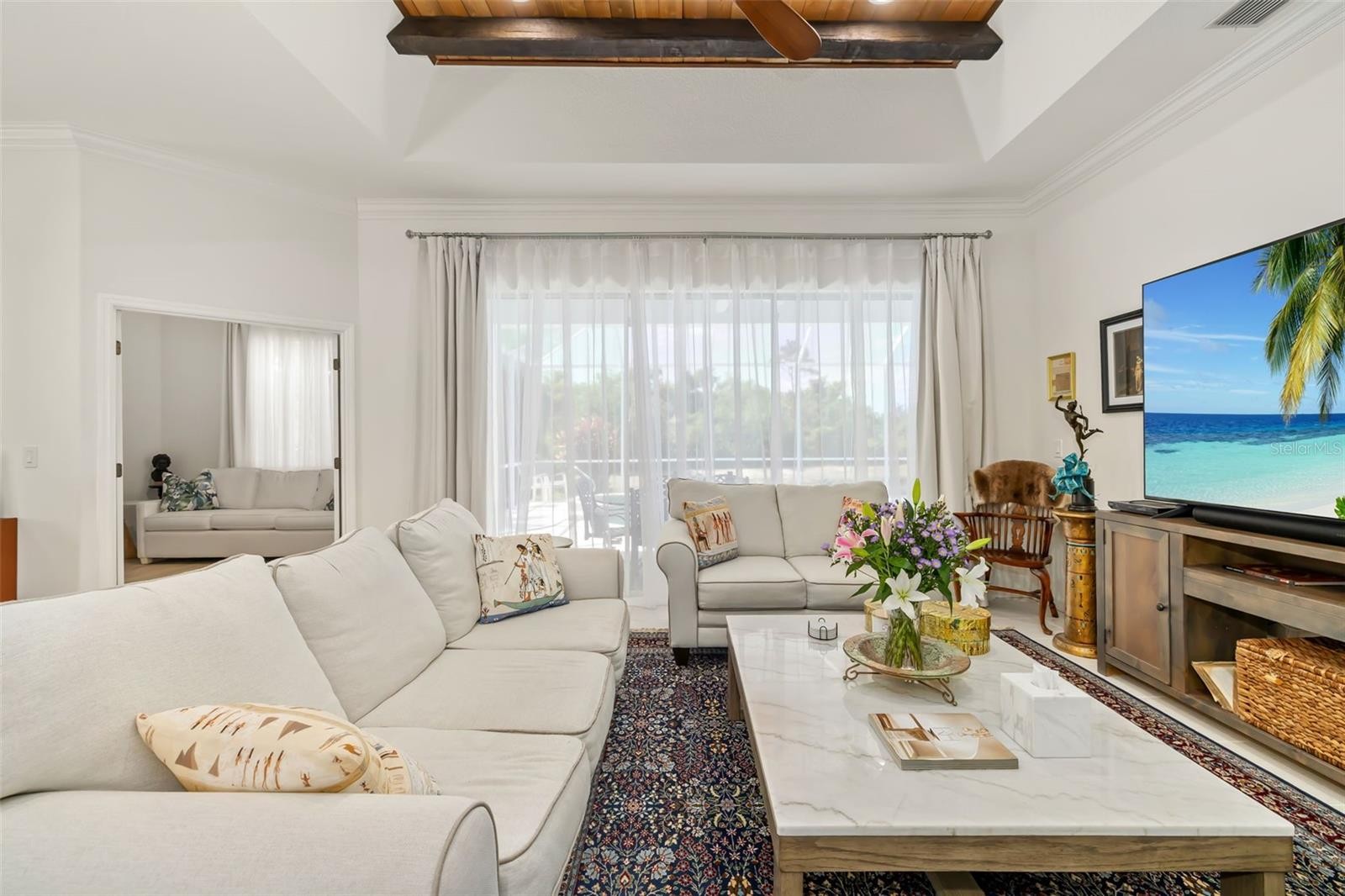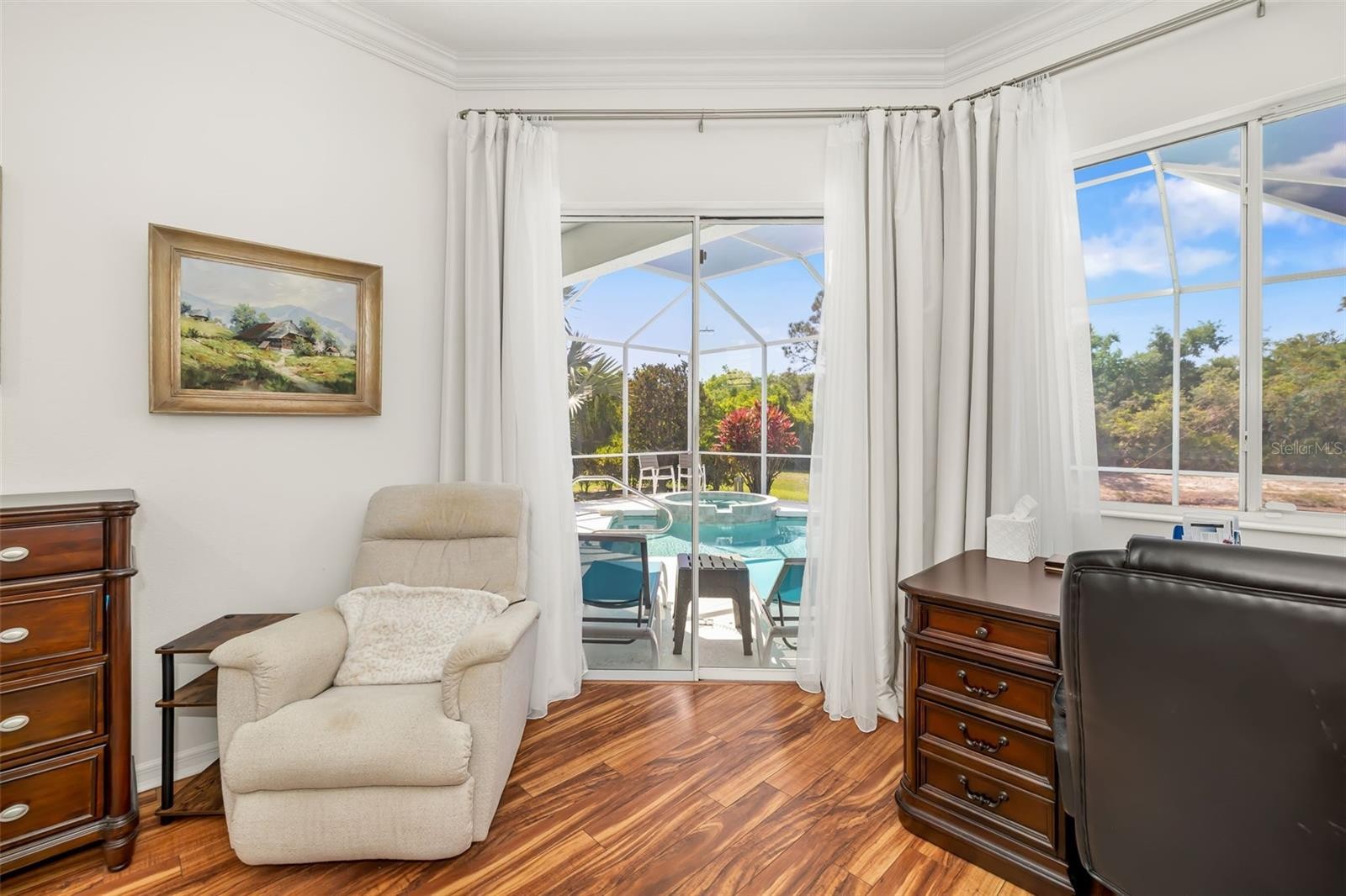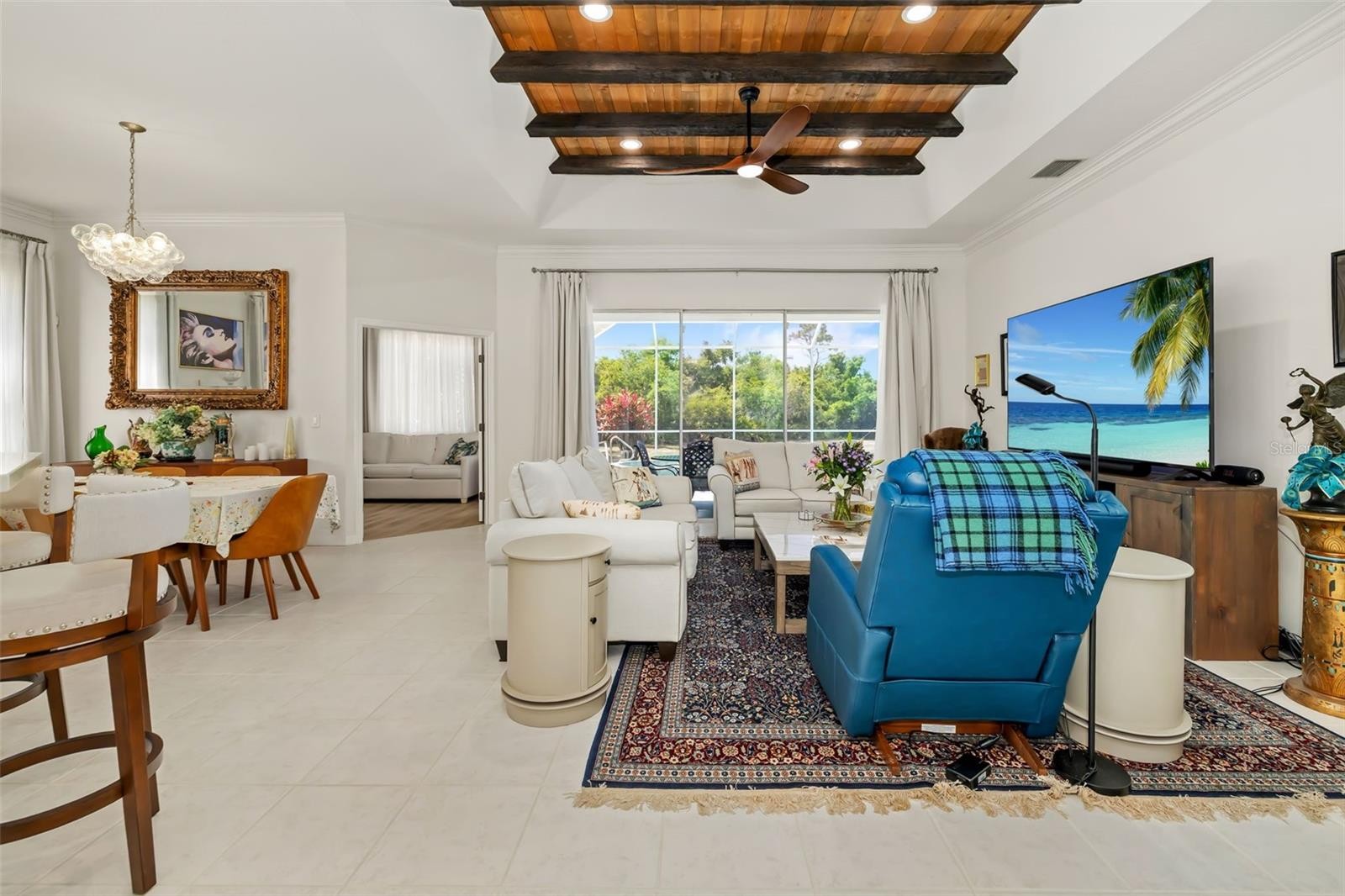 Situated within the highly desirable Mote Ranch community in Bradenton, this beautifully maintained and thoughtfully upgraded 3-bedroom, 2-bath residence offers a functional layout designed for both comfortable living and effortless entertaining. From the moment you arrive, you’re greeted by enhanced curb appeal with upgraded landscaping and a striking palm tree that adds to the home’s Florida charm. Inside, the home has been fully refreshed, featuring new paint throughout, updated lighting with dimmers, crown molding in the living area, and soaring ceilings ranging from 10 feet throughout to 12 feet in the living room and an impressive 13–14 feet in the foyer, creating a bright and spacious atmosphere. The interior showcases a seamless flow between living spaces, complemented by a versatile bonus room ideal for a home office, den, or flex space. The split-bedroom floor plan ensures privacy, while the spacious primary suite provides direct access to the outdoor living area. The kitchen and main living areas have been tastefully updated with painted cabinetry, new hardware, a new sink and garbage disposal, and a full suite of upgraded LG appliances, including a double oven with air fryer functionality. Additional interior improvements include luxury vinyl flooring in the bedrooms, updated bathrooms with new toilets and fixtures, freshly sealed grout, new curtains and rods, high-efficiency ceiling fans, and elegant chandeliers. Step outside to your private screened-in pool and spa, now enhanced with a new pool pump and a heater/cooling system allowing you to heat the spa quickly for a relaxing experience or cool the pool during warmer months. The backyard offers a tranquil setting, perfect for enjoying peaceful outdoor living. This home has also been carefully maintained and upgraded behind the scenes, including a serviced A/C system (2017), updated insulation, a newer water heater, fully tested plumbing, and a recently updated sprinkler system. Additional features include a garage door motor replacement, GFCI outlets, sealed doors for improved efficiency, and a security system with ADT alarm and Google front camera. Residents of Mote Ranch enjoy access to community amenities including a pool, kayak launch, and recreational areas, all with low HOA fees. Conveniently located near top-rated schools such as Braden River Elementary School, Braden River Middle School, and Braden River High School, as well as shopping, dining, and major roadways. Just a short drive to UTC, parks, and the beautiful Gulf Coast beaches. This property presents an exceptional opportunity to own a move-in ready home with extensive upgrades in a prime location schedule your private showing today.