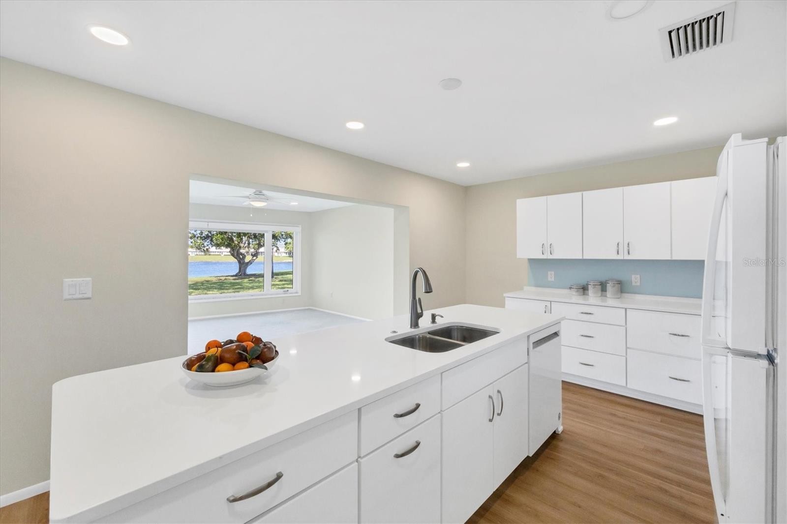 One or more photo(s) has been virtually staged. Live the Florida Lifestyle in this ever popular Village Green Villa Condo, where comfort, style and convenience come together! A prime West Bradenton location located just 5.8 miles from Holmes Beach on beautiful Anna Maria Island. This spacious 2,153 sq. ft. Model D floor plan with a oversized 2 car garage is one of the largest available and features charming lakefront views! Exceptional upgrades feature hurricane ready PGT high impact double pane insulated windows. A stylish steel gated entry adds extra security and leading to a spacious foyer with wood laminate flooring and a large closet. No outdated popcorn ceilings here! They’ve been scraped and textured complemented by recessed lighting throughout. The interior is professionally painted. The open concept kitchen has been completely transformed into a chef’s paradise featuring a large island workstation perfect for cooking and entertaining, custom wood cabinets with dovetail fasteners and soft close hardware. The sleek quartz countertops give it that high end modern feel. The spacious master suite easily fits a king-size bed with room to spare! Both bedrooms feature huge closets for all your storage needs. Both bathrooms remodeled include quality wood vanities, solid surface countertops, updated lighting, faucets, fixtures, & ceramic tile. The combination laundry room craft room is a true bonus with plenty of storage cabinets, counter space and a full-size washer & dryer. More updates for a peace of mind are the hot water heater replaced in 2024. The A/C system and added returns replaced in 2017. The energy-efficient barrel tile roof Installed 4/14/2010. Village Green is a fantastic community with a heated pool and a charming gazebo overlooking the lake. Also conveniently close to GT Bray Park, Robinson Preserve, Downtown Riverwalk and the SRQ Airport. The condo fee covers landscaping (except behind front pillars or private patios), exterior painting approximately every 10 years, pool upkeep & lake maintenance, irrigation, internet, basic Spectrum cable, annual roof cleaning, driveway and sidewalk repair. Don’t miss your chance to own one of the most sought-after villas in Village Green. Schedule your showing today and start living the Florida dream!