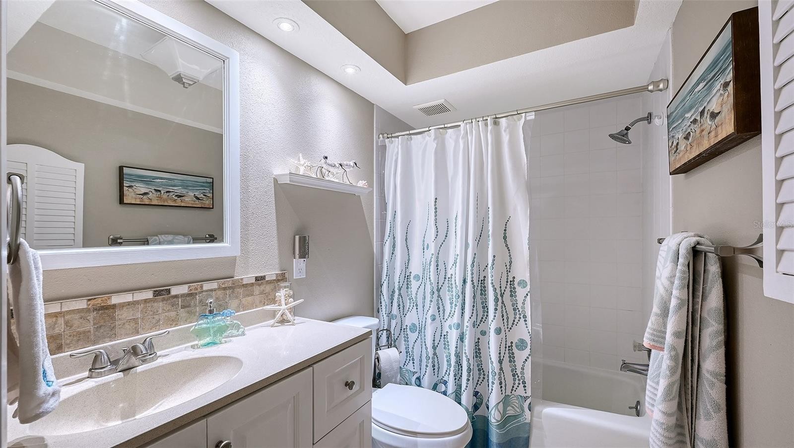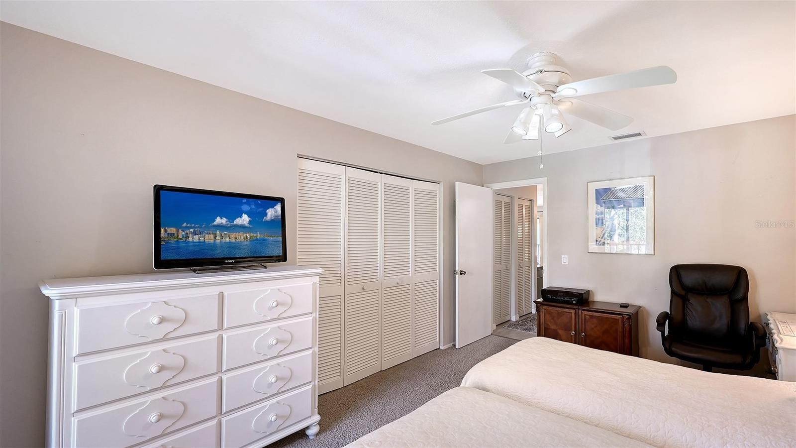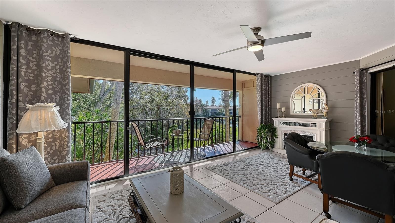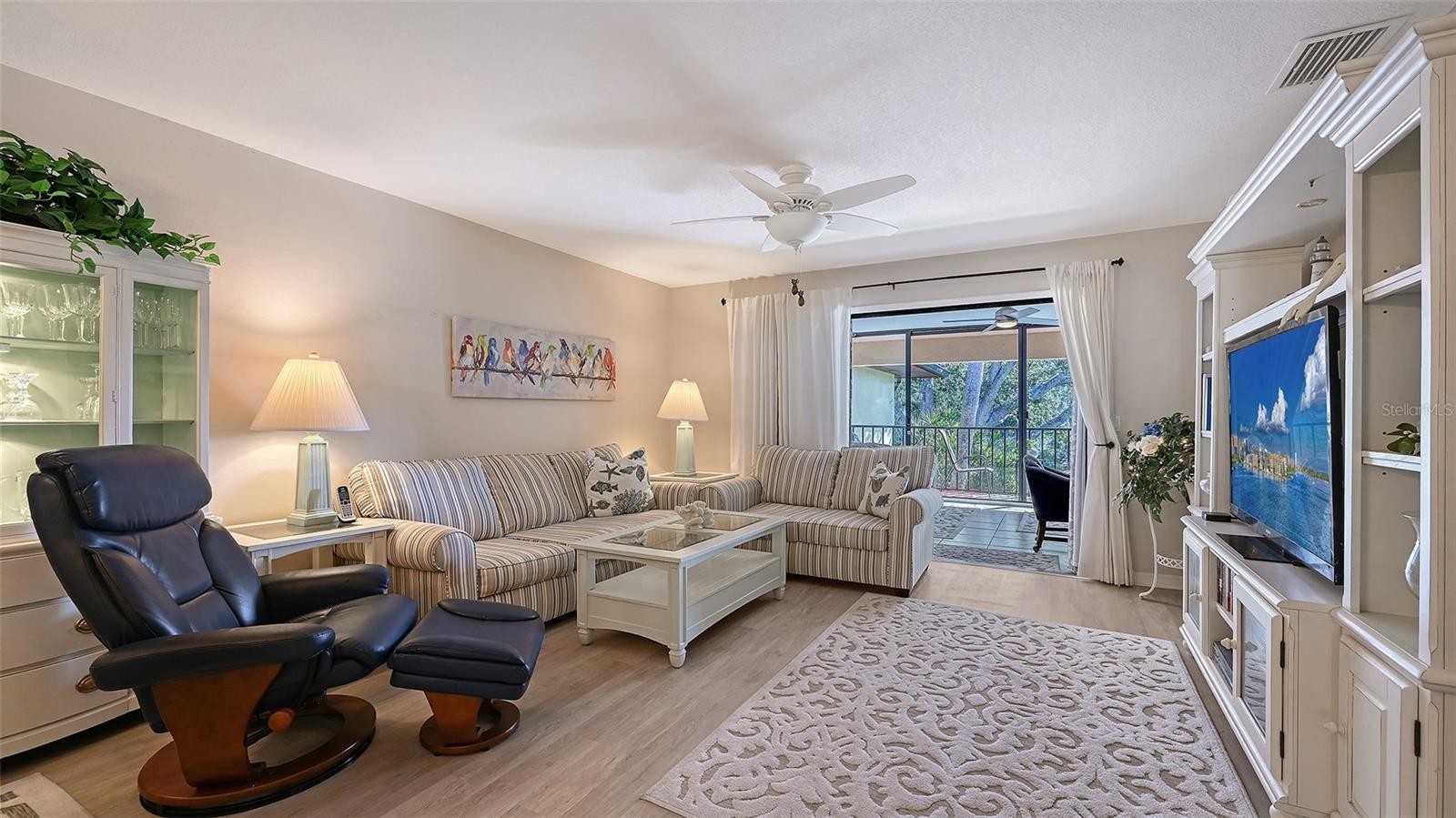 Wake up to serene lake views and lush tropical surroundings in this light and inviting condo with ideal eastern exposure. The layout is open, comfortable, and spacious, with beautiful natural light throughout. Most of the furniture is included, making this a wonderful move in ready opportunity. Inside, you’ll find a nicely updated interior featuring luxury vinyl flooring throughout most of the home. The kitchen is bright and functional with an eat in area, charming built in window seating with extra storage, newer upper cabinets, and upgraded granite countertops. A convenient kitchen closet houses the laundry, tankless hot water heater, and pantry storage, keeping everything organized and within easy reach. Corner windows bring in even more natural light, giving the space an airy feel throughout the day. Both bathrooms have been refreshed with new vanities and quartz countertops for a clean, modern look. The primary bedroom is ensuite and features a large walk in closet with custom California Closets, along with peaceful views out to the lanai and treetops beyond. The second bedroom is generously sized and also offers dual closets with California Closets for excellent storage. The enclosed lanai adds the perfect bonus space for relaxing, entertaining, or simply taking in the view of the water and pool area beyond, expanding the living area to a comfortable 1,557 square feet. Shiplap detailing and an electric fireplace add a cozy, stylish touch, making it a space you will enjoy year round. Additional features include smart storm shutters on the front windows for added peace of mind. The HOA recently replaced the roof in 2024, and the condo had no wind or water damage from last year’s hurricanes. The community offers a beautiful lakeside pool and spa, along with a beautiful setting for walking, running, or biking. You’re also just minutes from IMG Golf and Country Club, bayfront dining, and the Racquet Club of El Conquistador. Conveniently located about 15 minutes from Gulf beaches, close to IMG Academy, and within easy reach of Sarasota’s dining, shopping, and arts, this is a fantastic option whether you’re looking for a full time home, seasonal retreat, or investment property.