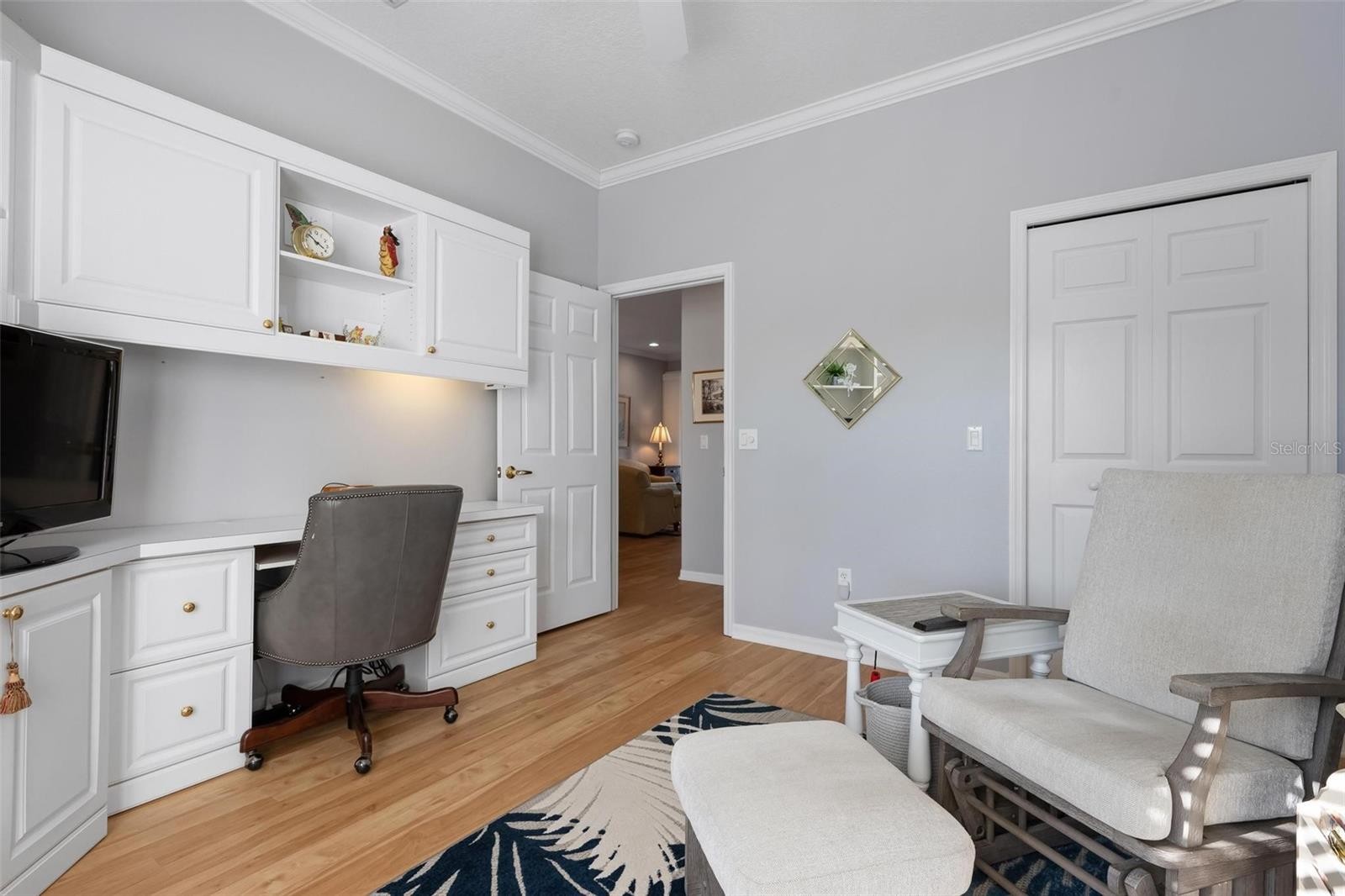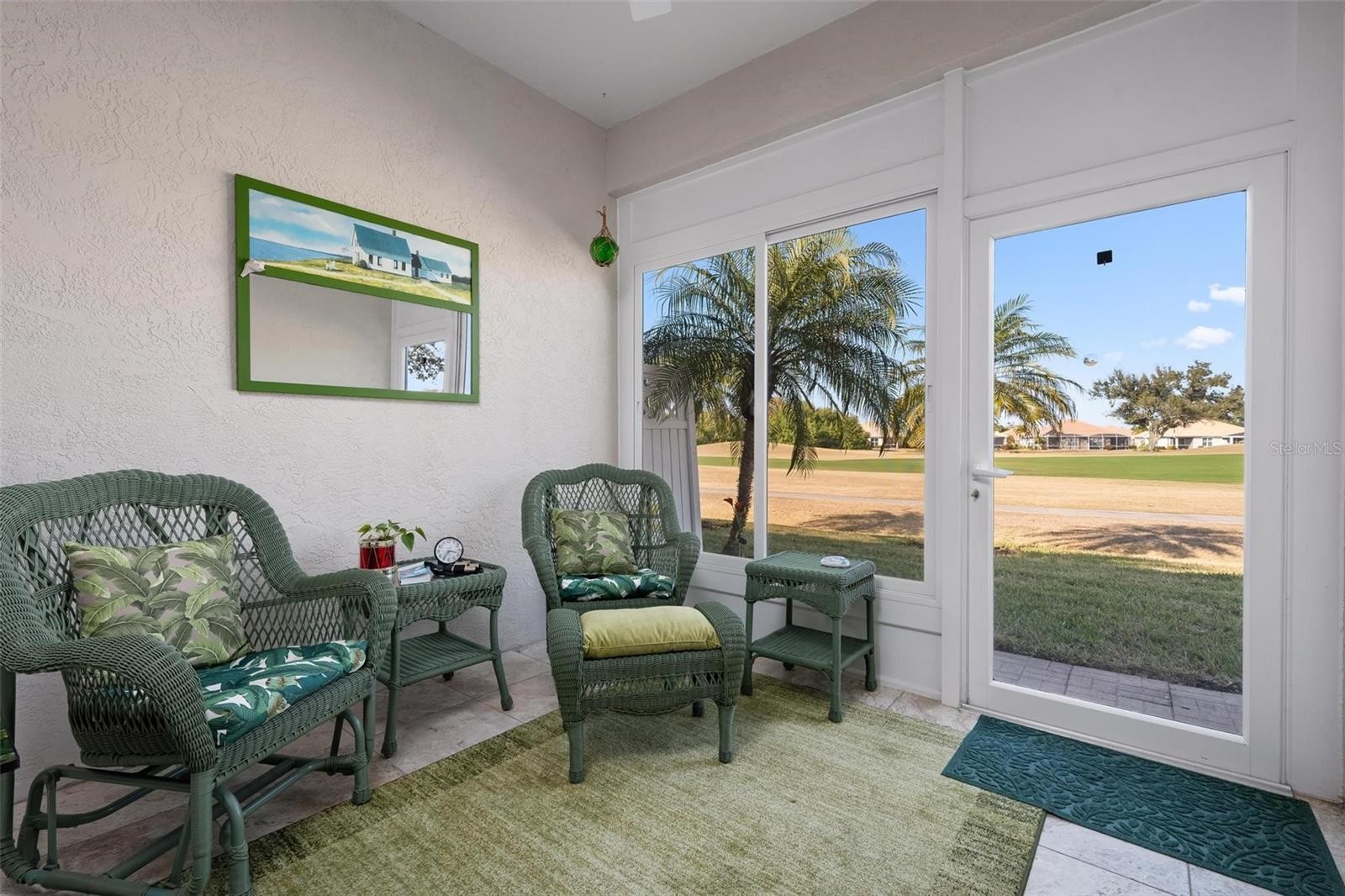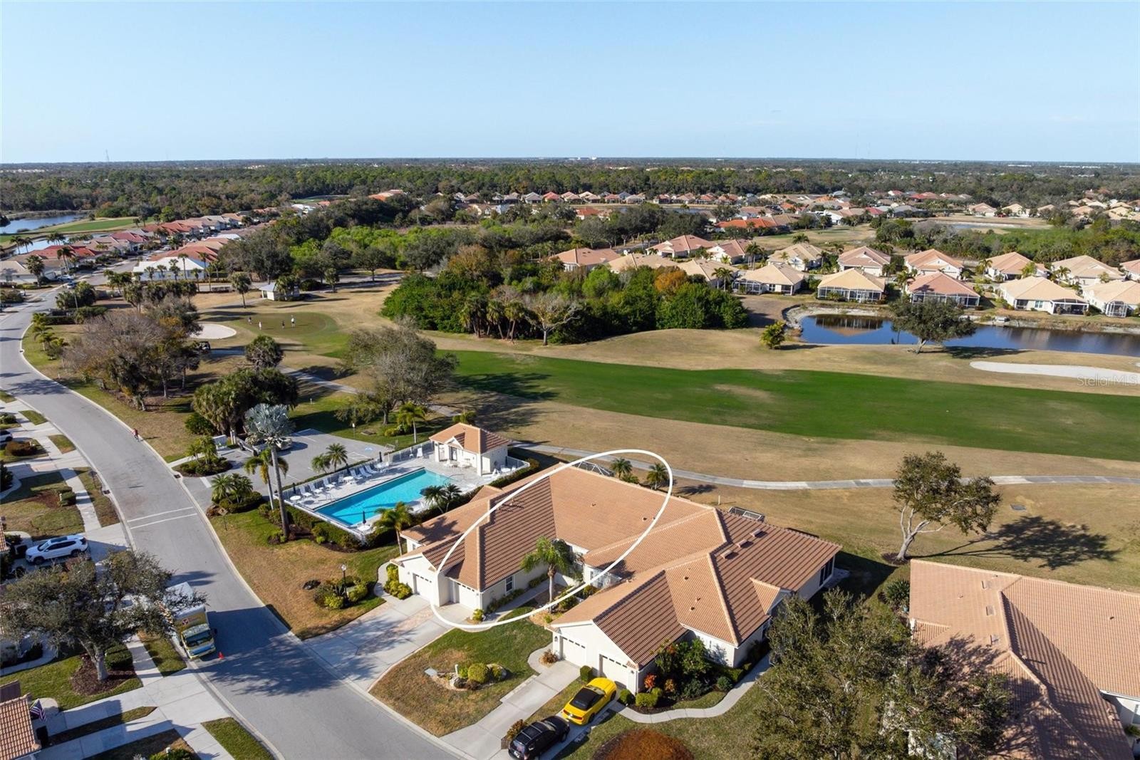 Simply lovely villa in The Links at Pelican Pointe Golf & Country Club, overlooking the par-4 14th hole of the Meadows Course. Conveniently situated approximately 100 feet from the Villas’ heated community pool. Virtually all structural and mechanical components have been replaced within the past few years, including tile roof (2023), all windows – hurricane rated (2022), HVAC (2022), lanai converted to a sunroom with hurricane-rated windows and doors (2022), all appliances (2021-2025), whole house surge protector (2018), and re-piped. Similarly, the interior was recently refashioned with luxury vinyl flooring (2022), crown moldings (2022), whole house interior painted (2002), and epoxy garage floor (2021). Additional features include plantation shutters, granite countertops in the kitchen and baths (each bathroom equipped with Hi-Line toilets), and guest bedroom/office with custom built-in cabinets, draws, desk, and Murphy bed. Enjoy maintenance-exterior free living at The Links, where low HOA fees include 24/7 guard service, high speed internet and expanded cable, and a clubhouse and facilities which include a Ladies Association with over 45 activities/groups, the primary pool, fitness, tennis, new pickleball courts, casual dining, social and event space. Offering 27 holes of semi-private golf, where you can join as a member or pay-as-you-play. Minutes away are the beaches, shopping, dining, walking/biking trails, other recreational activities, and cultural venues of Venice Island.