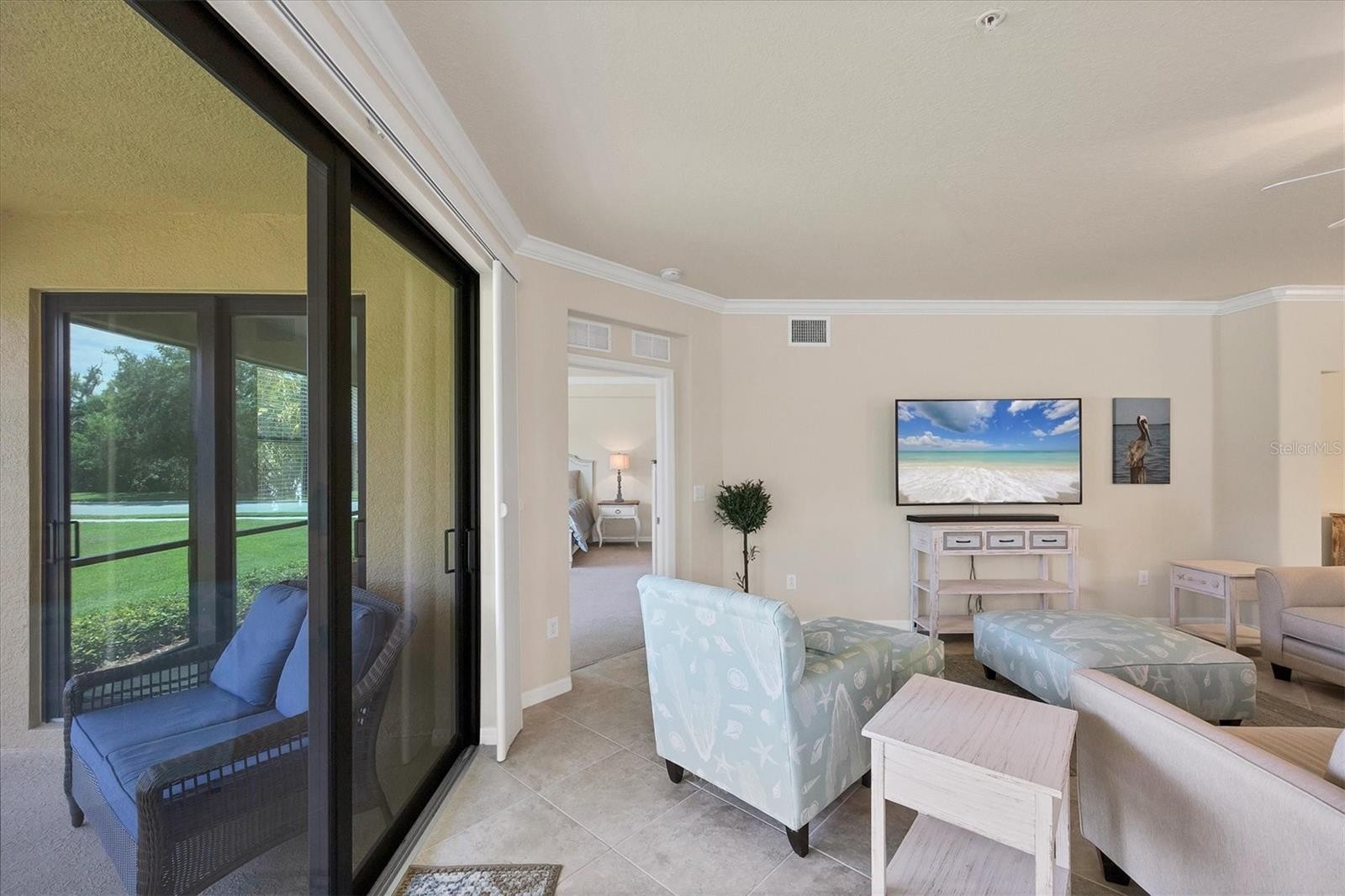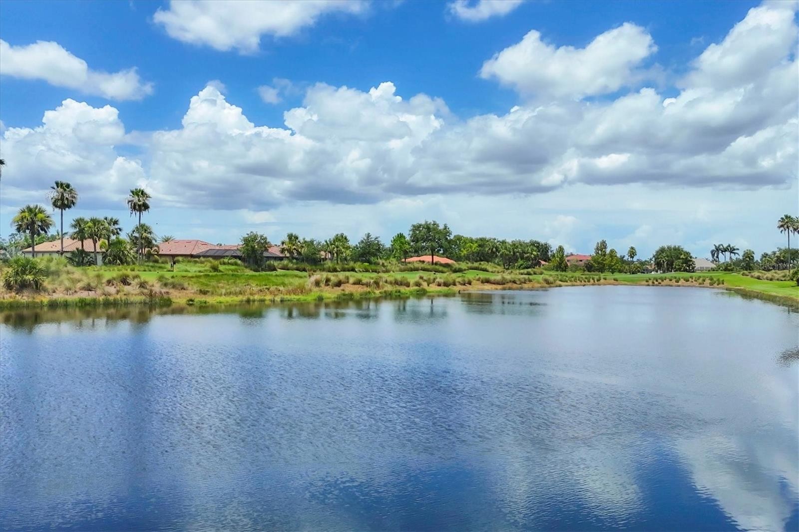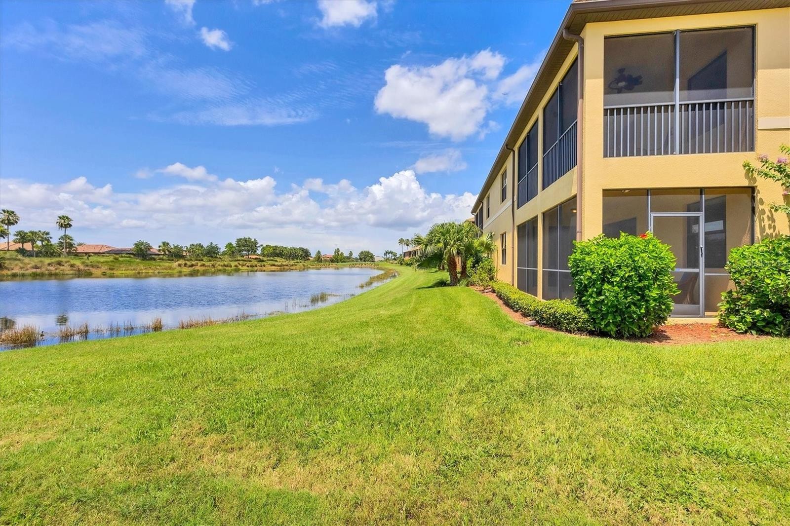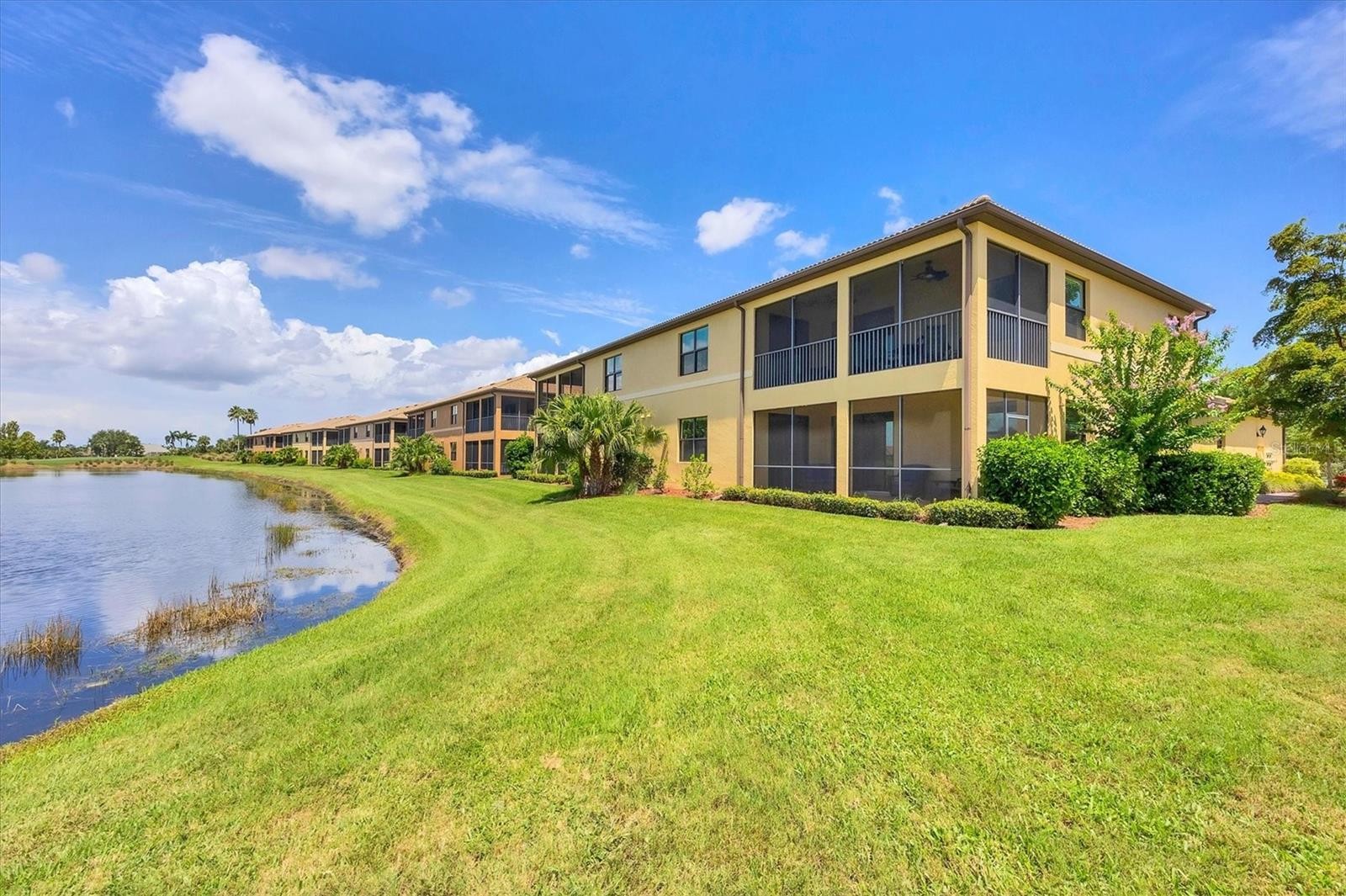Check out this furniture optional, meticulously maintained, move-in ready ''Hibiscus'' floorplan with premium lake view! Located on a corner lot, with no neighbors to one side and plenty of mature landscaping to appreciate, this first floor coach home is one of the newest builds In the community and also features discounted fees, being a "Social Membership". This stunning property is built strong and safe with its cinder block construction, concrete tile roof and HURRICANE IMPACT WINDOWS throughout! Your new home boasts 3 bedrooms, 2 full baths, great room, dining room, kitchen with dinette area, indoor laundry room and covered extended screened in lanai! Throughout the home you will find crown molding, ceramic tile in the main areas, LED recessed lighting and much more. The kitchen boasts a nice sized closet pantry, LED lighting, high level granite countertops, upgraded back-splash and matching stainless steel appliances. The master bedroom includes luxurious crown molding, TWO oversized walk-in closets, large vanity with dual sinks, a soothing garden tub and a walk in shower with upgraded tile. On the other wing of the home, a pocket slider separates the two guest bedrooms and guest bathroom, convenient privacy when having guests stay. Step outside either one of your HURRICANE IMPACT rated sliders and be instantly mesmerized by your private rear lake view! You will love your morning coffees out on the covered screened lanai when soaking up the sounds of the birds and sun glistening off the water just outside your lanai! The 2-car garage comes equipped with an epoxy floor and HURRICANE IMPACT garage door as well! The fact that you are walking distance from one of the SIX satellite pools truly makes this a year round staycation! River Strand Golf & Country Club is a thriving, activity rich community with a social calendar of exciting activities for all as well as 24-hour gated security, exterior maintenance, cable/WiFi, water, trash, sewer are all included in your condo & HOA fees, your only utility that you pay for is electricity! You can also expect a 27 hole championship golf facility designed by world renowned architect Arthur Hills, 9 Har-Tru Tennis Courts, 8 Pickleball courts, 2 Resort-Style Pools with tiki bar and poolside service, Clubhouse with restaurant, Community Center & 2 fitness centers in this luxury gated community!