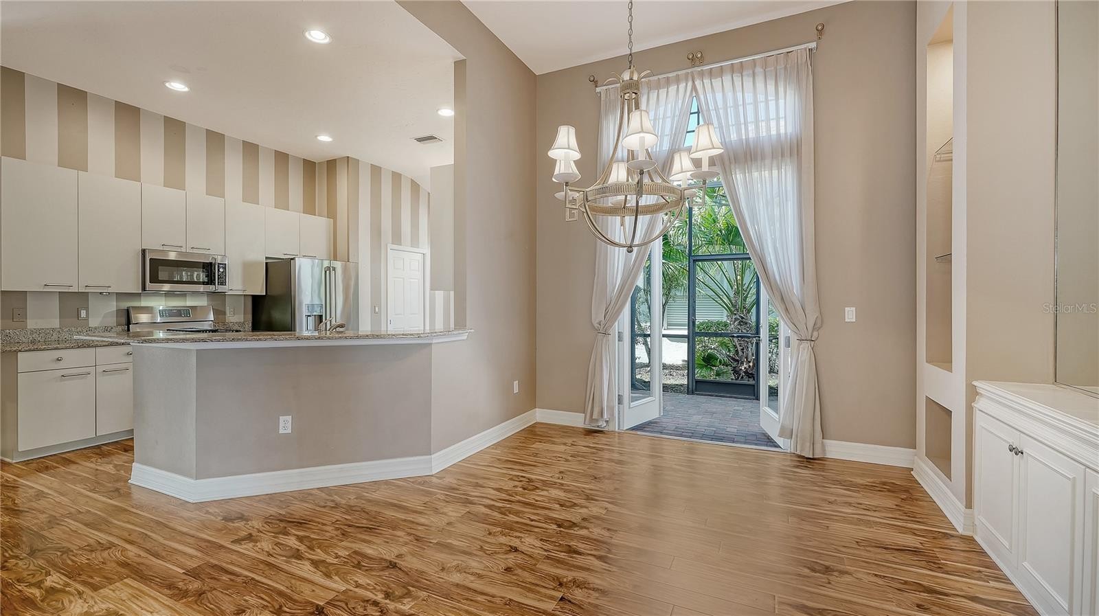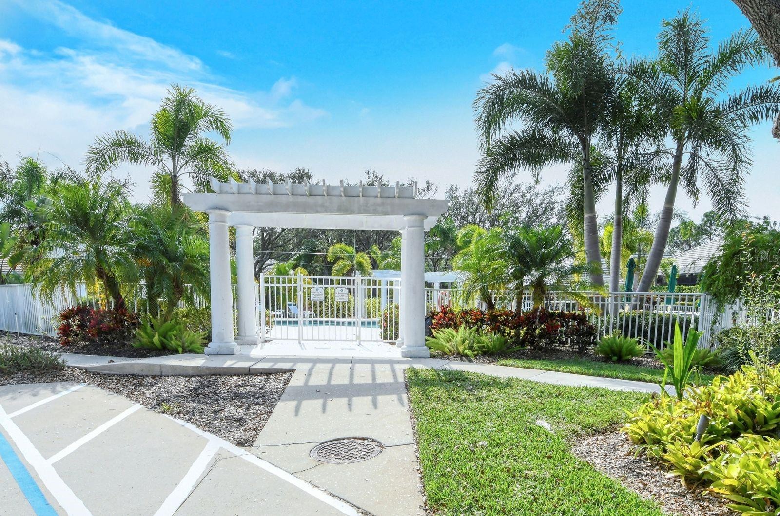 Enjoy the Florida lifestyle with effortless, maintenance-free living in the desirable Muirfield neighborhood of Lakewood Ranch Country Club. This beautifully maintained home features a new roof and a tranquil preserve view with the golf course visible in the distance. The private, extended brick-paver lanai offers a versatile heated spa-pool, perfect for a refreshing dip or relaxing hydrotherapy, creating an ideal outdoor entertaining area. The spacious owner’s suite includes a tiled sitting area with direct access to the spa-pool, along with a well-appointed en suite featuring dual vanities, a soaking tub, a separate frameless glass shower, and a walk-in closet with custom shelving and luggage storage. Soaring twelve-foot ceilings, architectural niches, transom windows and built-ins enhance the light-filled great room and formal dining area, adding refined designer touches throughout. The kitchen is accented by granite countertops, an island, and eat in dining area, while privacy pocket doors open to a den that can be used for extra living space or a home office. Additional outdoor living space includes a second screened patio, ideal for grilling or relaxing, accessible from the dining room through French doors or via a slider from the dinette. The intimate enclave of just 64 homes also offers a community pool, gathering area, and low HOA fees, completing this exceptional lifestyle opportunity.