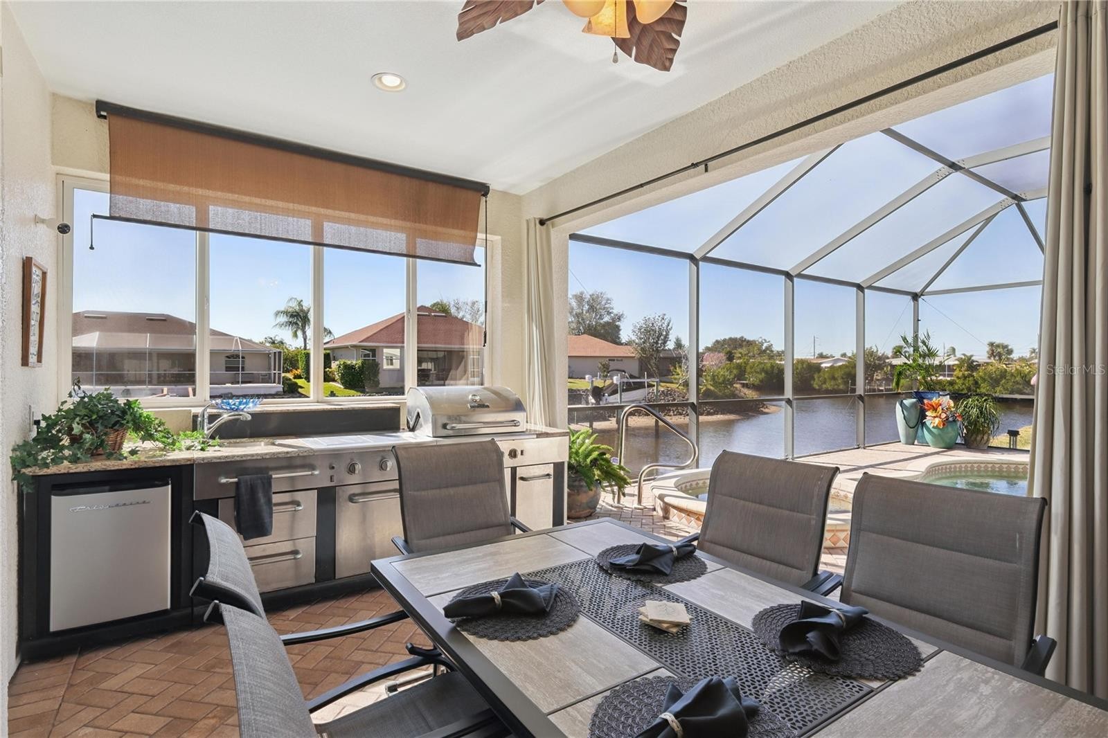 Beautiful 3 bedroom, 3 bath, 3 CAR GARAGE + office on the island of Duck Key in North Port. This home is on a WATER FRONT CANAL with DOCK & BOAT lift having direct access to the Myakka and the Gulf of Mexico. The home is open concept with split floor plan and WATER VIEWS! The gormet kitchen is as inviting as it is spacious! The kitchen features granite counter tops, solid wood cabints, reverse osmosis water system, large walk in pantry, SS appliances, bar counter, large island, & breakfast area. The primary master has sparkling WATER & POOL VIEWS, soaring catherdral ceilings with double tray crown molding, and two walk in CUSTOM DESIGNED closets. Your luxurious private bath has a walk thru Roman shower, dual granite vanities as well as a soaking tub. Additionally, there are two spacious bedrooms, each having a bath. One bedroom has a water view and the bath has pool access and a water view. The lanai expands the home into an entertainers dream! Starting with the sliding pocket doors that lead onto sealed brick pavers. There's a complete Master Forge kitchen! The OUTDOOR KITCHEN features a granite counter tops, griddle, gas burners, grill, sink and brand NEW 2026 refrigerator. The screen enclosed lanai includes BOTH a sun solar and /or electric heated salt water pool & spa! Each has Pebble Tec pool lining. The pool and spa are app automated. All are overlooking the canal where you can view natures finest birds, turtles, jumping fish and perhaps a manatee or alligator! Steps away is a TREX DOCK featuring water and electric, plus a 10,000 LB boat lift and direct access to the Myakka River and the Gulf of Mexico. This home also has owner OWNED 20 electric Solar Panels to significantly reduce your electricity bill! The home also boasts a NEW TILE ROOF and EXTERIOR PAINT in 2023, brand NEW HVAC unit in 2024, newer lanai screens and pool equipment. A NEW spa pump was installed in 2025. The EXTENDED paver drive has additional parking. Also, worth mentioning is an automated lawn irrigation sysytem, newer stove top & diswasher in 2023, built in garage cabinets, salt water system, and security system. Minutes away is Wellen Park, offering waterfront dining, boutique shopping, live music, weekly events and a splash pad. Also, available is Cool Today park with Braves spring training stadium and Charlotte Sports Park hosting the Tampa Bay Rays for spring training. North Port has access to good medical care. Sarasota memorial Health Care Cente and ER are minutes away. North Port is currently undergoing the construction of a new top-tier 100 bed hopital. The HOA is low AT $700/year and NO CDD. This home has never had flood damage. Duck Key has all electric lines underground. What are you waiting for? This is everything you've dreamed of!!