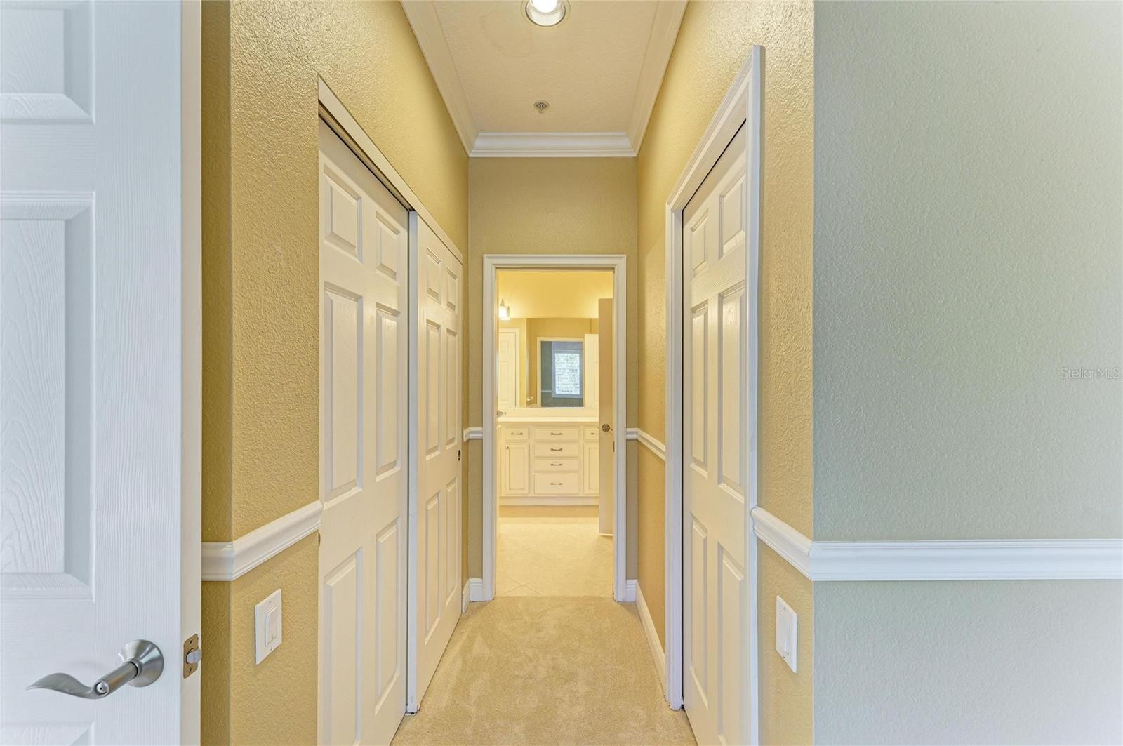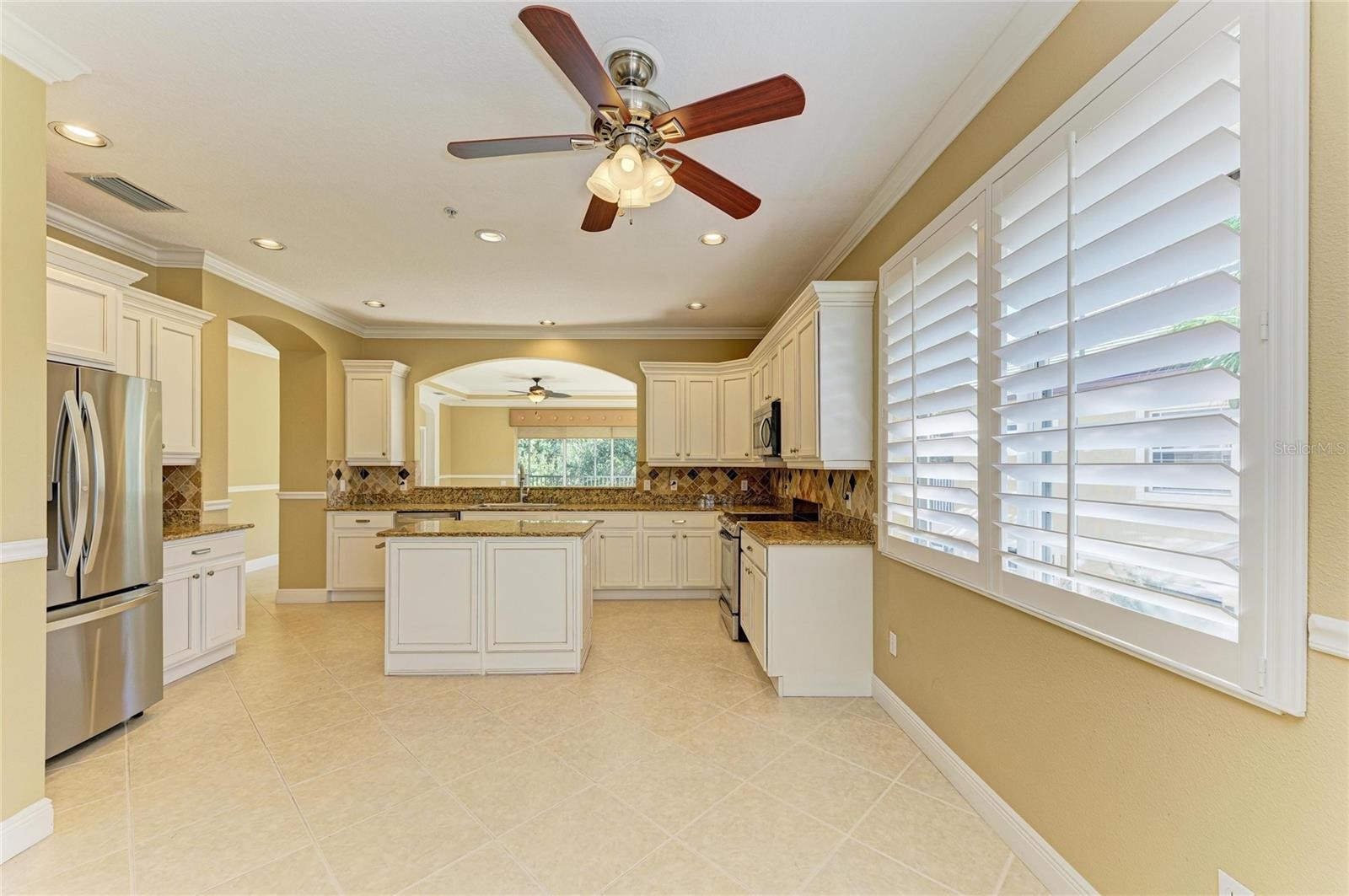 One or more photo(s) has been virtually staged. This beautifully designed condo overlooks a peaceful park setting with majestic trees. The spacious home offers 3 bedrooms, 3 baths plus a bonus room. The split-bedroom layout offers exceptional privacy, with the primary suite and secondary ensuite positioned at opposite ends of the home. The large, screened balcony features adjustable shades for sun control and privacy. Inside, the great room includes a wall of sliders that open to the balcony creating a seamless indoor-outdoor living experience. This room may be used as an oversize living area or combined living and dining areas. New carpeting in the bedrooms compliments upscale finishes including crown moldings and plantation shutters found throughout the home. All bedrooms and the pantry feature California Closets for exceptional organization. All bathrooms include linen closets. The primary suite boasts direct access to the balcony, 2 closets (one is a walk-in), and an ensuite bathroom with 2 sinks, walk in shower, and private water closet. A second bedroom and bath were used as a home office. A third bedroom suite with bath and walk-in closet is located on the opposite side of condo for comfort and privacy. The spacious kitchen is enhanced with granite countertops, stainless appliances, center island, walk-in pantry, and abundant cabinetry with pull out shelves. There is room for a kitchen table set ideal for both everyday living and entertaining. A versatile bonus room off the stairway offers flexible space for formal dining, a home office or a game room. The laundry room is impressive with a window for natural light, utility sink, storage cabinets, custom hanging rod, washer and dryer. A 2-car garage with built-in cabinets provides extra storage and workspace. A new roof was installed in 2023, new AC in 2022, new refrigerator in 2024. Residents enjoy a clubhouse with exceptional amenities including a heated pool and spa, Tiki Bar, screened outdoor kitchen and seating, indoor fitness center, and social rooms including a full kitchen. A private peninsula offers a picnic area and water access to the lake. Located a short walk to Main St Lakewood Ranch - shops, restaurants, theater, and entertainment are just steps away. A short drive will get you to the popular UTC Mall area with extensive shopping, restaurants, entertainment and events.