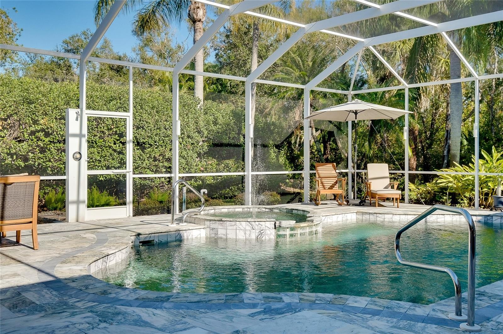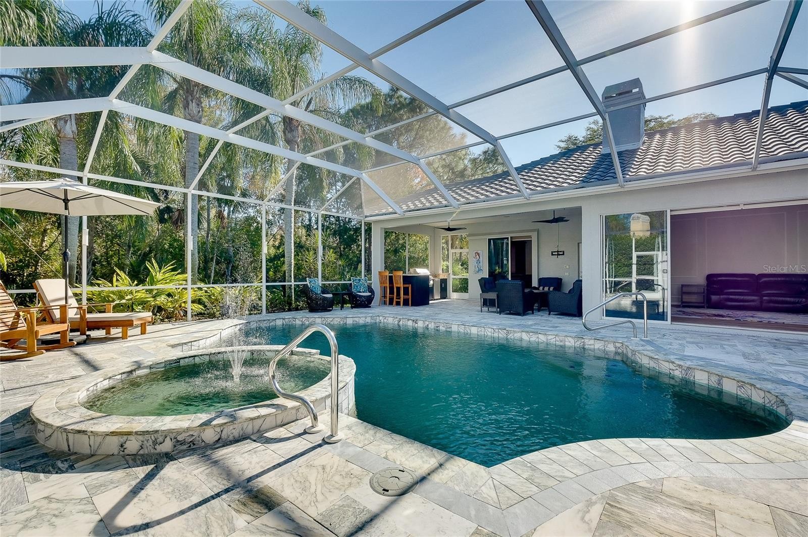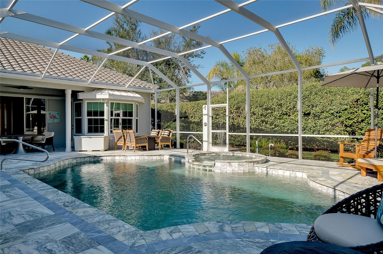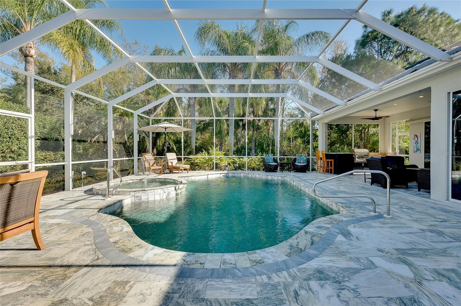 Exceptional Opportunity to discover this beautifully upgraded pool home located in the highly sought-after, gated Edgewater community of Lakewood Ranch. From the moment you arrive, the home delivers a true WOW factor, beginning with the impressive double entry featuring stunning iron doors added in 2023. Built by Todd Johnston, this residence offers a spacious split-bedroom floor plan with 3 bedrooms plus a den/office with custom built-ins, 3 bathrooms, and multiple living spaces including a formal living and dining area as well as a family room with an adjacent dinette. The home has been thoughtfully remodeled to complement its exceptionally private preserve-view lot, tucked away on a quiet one-way cul-de-sac. Designed for both comfort and entertaining, the main living areas feature newer luxury vinyl and tile flooring and flow seamlessly through fully pocketing sliding glass doors to the expansive outdoor living space. Enjoy cozy evenings by the gas fireplace, framed by quadruple sliding doors overlooking the impeccably landscaped backyard and serene preserve views. The gourmet kitchen is a chef’s delight, showcasing granite countertops, rich wood cabinetry, and stainless steel appliances, including a Wolf gas range and double oven. The spacious primary suite offers a tranquil retreat with a bay window overlooking the preserve, two walk-in closets, dual vanities, a soaking tub, a separate shower, and a private water closet. The secondary bedrooms, additional bathrooms, and den are thoughtfully positioned on the opposite side of the home for privacy. Elegant plantation shutters are featured throughout the home, adding timeless style and functionality. The expansive outdoor living area serves as the true centerpiece of the home, thoughtfully designed to accommodate large gatherings of 25+ guests with ease and enhanced by recently added leathered marble flooring, lanai cage lighting, a fully equipped outdoor kitchen with granite countertops, gas grill and burner, sink, and refrigerator, along with an outdoor shower, large pool, and spa. One of the guest bathrooms conveniently serves as both an en-suite and a pool bath. Major upgrades have already been completed, including a new roof (2022), new A/C system (2022), new water heater (2025), pool heater (2024), and washer/dryer (2023), and all newer hurricane impact windows, offering peace of mind for years to come. First impressions truly matter, and this home delivers exceptional curb appeal. Recent exterior upgrades include a refreshed landscaping package, elegant driveway pavers, updated exterior (and interior) paint, and new gutters—all completed within the past couple years. This home is also high and dry, being built higher than others in the area. Edgewater Village boasts a prime Lakewood Ranch location near University Parkway and Waterside, with very low HOA dues that even include kayak AND canoe storage at Lake Uihlein—perfect for leisurely paddles to Lakewood Ranch Main Street. With easy access to world-famous Florida beaches, exceptional shopping and dining, and multiple major airports, this home offers the ultimate Florida lifestyle. Don’t miss your opportunity to make this extraordinary property your private paradise.