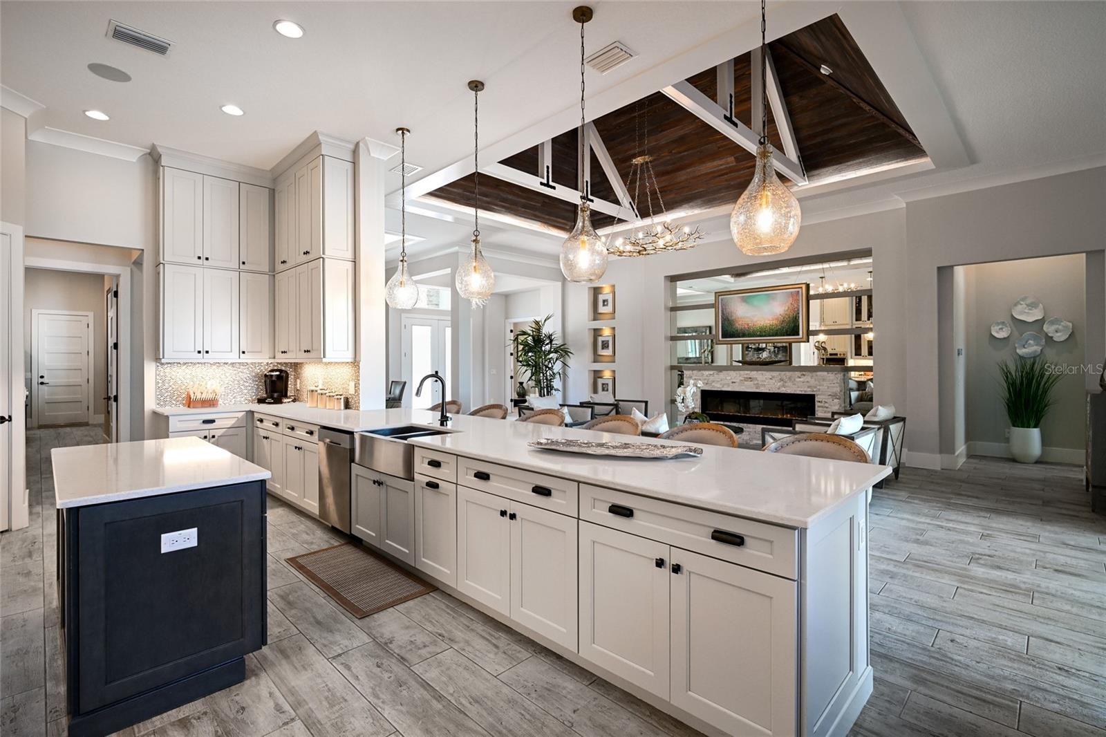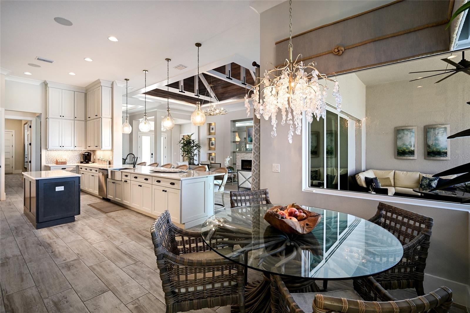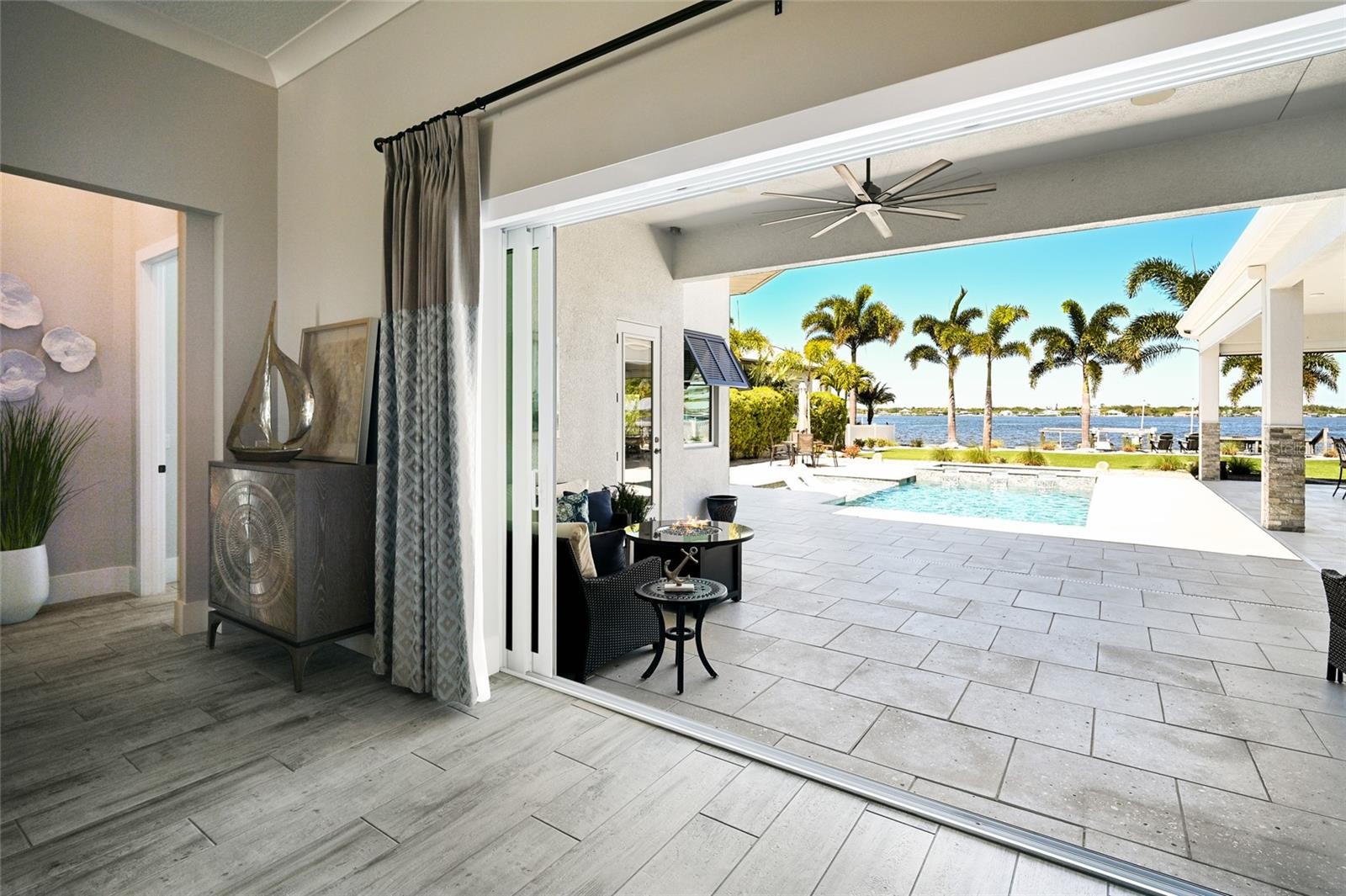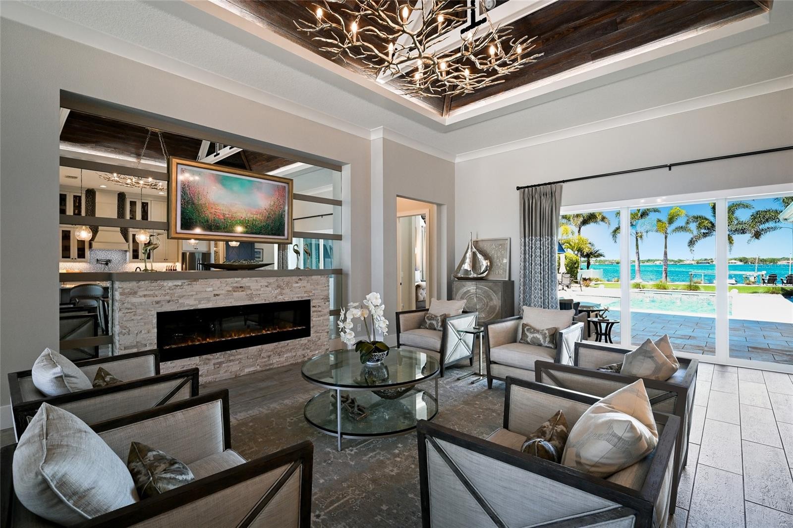 An extraordinary opportunity to own over 4,100 square feet of refined, single-level living on direct open water, complete with a private dock set against a breathtaking waterfront backdrop. Located within the exclusive, double-gated enclave of The Reserve at Harbour Walk on the Manatee River, this exceptional 2021-built estate offers the pinnacle of privacy, elegance, and coastal sophistication. From the moment you enter through the striking glass entry, you are welcomed by sweeping, unobstructed water views and a light-filled interior designed to impress. Professionally decorated with impeccable attention to detail, the home is offered furnished with an acceptable offer—presenting a true luxury experience. The grand vaulted living room showcases a sleek fireplace feature wall and a seamless blend of contemporary design and relaxed elegance. Expansive hurricane-impact windows and pocketing sliding glass doors seamlessly connect indoor and outdoor living spaces, while providing both beauty and peace of mind. The owner’s suite is a tranquil retreat, perfectly positioned to capture serene water vistas and complemented by a spacious walk-in closet. The spa-inspired bath features upscale finishes, dual vanities, and an oversized walk-in shower with a soaking tub enclosure. Guest accommodations are thoughtfully designed for comfort and privacy, each with adjacent baths. An expansive bonus room elevates the home’s entertainment appeal, complete with a wet bar, kegerator, and refrigerator—perfect for hosting while enjoying spectacular sunset views. A private office offers flexibility and can easily serve as a fourth bedroom. Outdoors, two generous lanai areas provide the ultimate waterfront lifestyle experience, enhanced by electric storm screens for added protection and comfort. A full outdoor kitchen, bar seating, and ample lounging space create an inviting setting to enjoy panoramic water views, vibrant sunsets, and abundant wildlife. The private dock is equipped with two boat lifts (30,000 lb and 10,000 lb), offering direct access to the Intracoastal Waterway and the Gulf, with waterfront dining and marinas just moments away. Further enhancing the home’s quality and resilience is a whole-house generator, ensuring uninterrupted comfort year-round. Residents of The Reserve at Harbour Walk enjoy a premier lifestyle with a guarded entrance, additional gated security, tennis courts, walking trails, kayak launch, playground, and observation pier. Ideally situated near I-75, upscale shopping and dining, world-renowned beaches, major airports, and IMG Academy, this residence embodies the very best of luxury waterfront living. This is a rare opportunity to own a fully curated waterfront retreat and experience Florida coastal living at its finest.