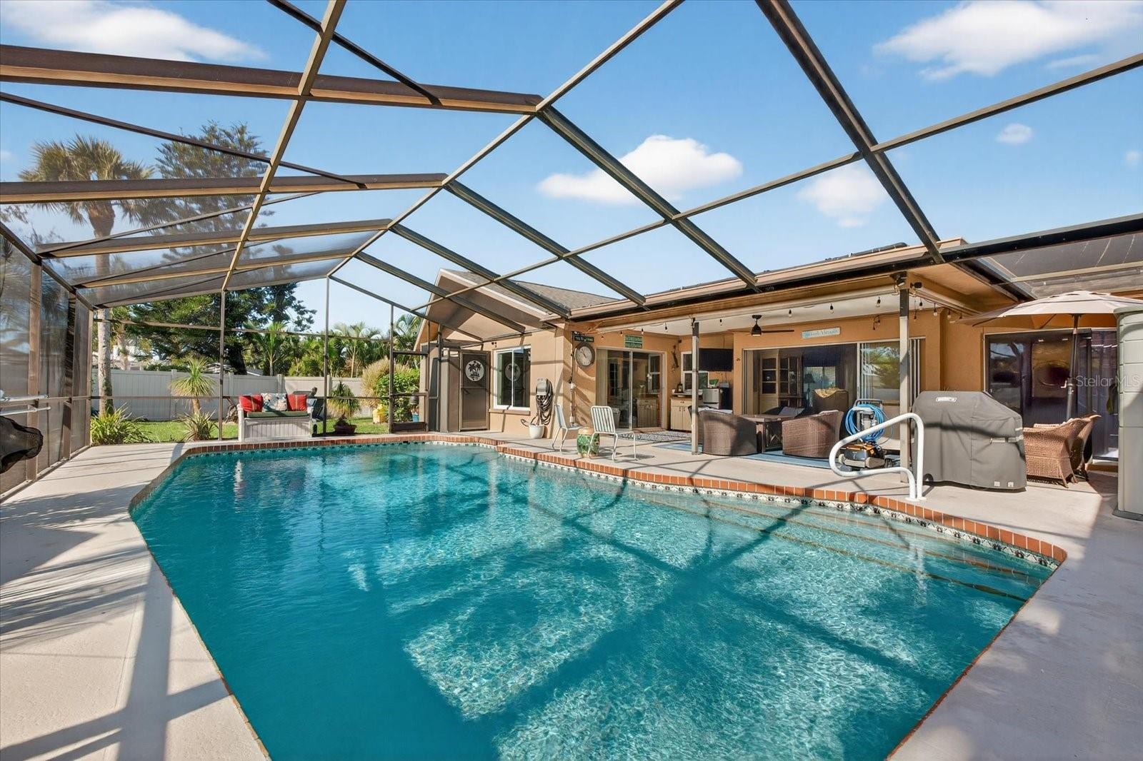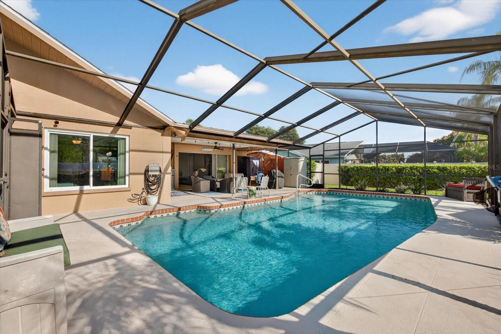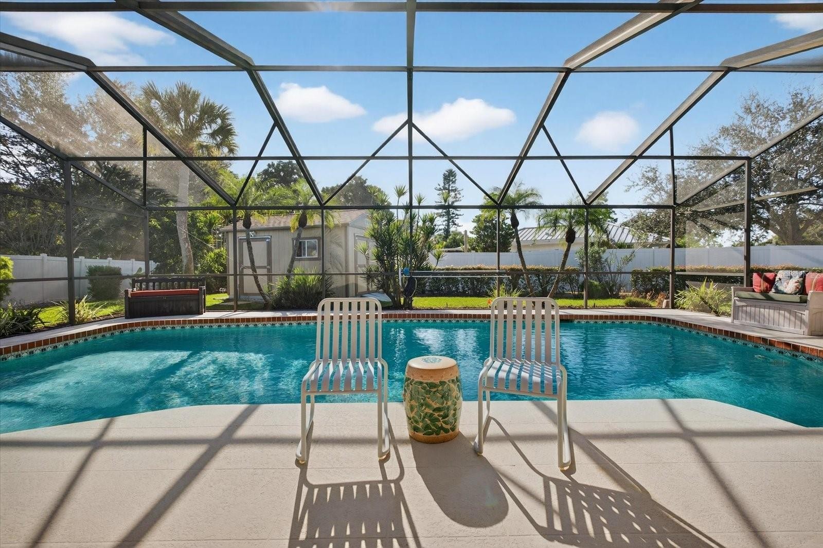 Welcome to your west Bradenton oasis in Village Green! This meticulously upgraded home offers the perfect blend of comfort and convenience. Enjoy peace of mind with impact windows throughout. The spacious lot provides ample outdoor living, featuring a saltwater heated pool for year-round enjoyment. Inside, discover a host of recent upgrades including a newer bathroom, flooring, HVAC system, water heater, kitchen, and roof. Hobbyists will love the detached man cave shed with electricity – perfect for projects or extra storage. Bring your boat or RV, as there’s dedicated parking available behind the fence! This home is truly move-in ready and designed for a relaxed Florida lifestyle! Enjoy your very own avocado and banana trees watered by the sprinkler system on a deep well. This model was expanded when built for extra living space in the family room, dining room, and 2nd/3rd bedrooms. Views of the pool and the private tropical backyard are visible from almost every room of the house creating a Florida lifestyle that is unsurpassed in newer neighborhoods!