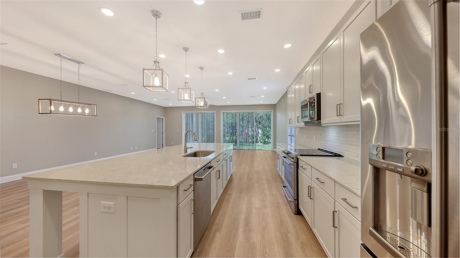 If you are an artist or art collector, or if you enjoy entertaining at home, let this be the home of your dreams. Beautifully updated in 2026 with a new tile roof, new LVP flooring, a new open floor plan, and a SPECTACULAR new kitchen, this home offers features that are rarely found at this price. Yes, the kitchen is exceptional. GE Cafe' Series appliances (gas hookup available if preferred), new cabinets with soft close doors, drawers, and pull out lower shelves, a very large (11 1/2' by 4 1/2') center island, and a 5' by 9' walk-in panty with built in shelves will allow you prepare fantastic meals while being at the center of your party. There is seating at the island, and the formal dining area is just a few feet away. Choose an expandable table that seats six to twelve, and make it a lively gathering. The great room floor plan was designed to maximize wall space with no obstuctions, to accomodate your art collection as well as an oversized television and complete entertainment center. You will be able to watch TV from anywhere in the room, with your ideal speakers located as you wish for perfect sound. Don't want to party? Just enjoy peace and quiet in this comfortable and flexible space. The split bedroom floor plan places the master suite with adjoining bathroom and large walk-in closet (with custom storage units) at the rear of the home, and two additional bedrooms (one with two closets) that are well isolated from the main living space. The interior space also includes a utility room with LG front load washer and dryer, a closet, and storage cabinets. Outside, the private back yard has a south exposure which is great for winter sun and summer shade, and is ready for you to plan a patio, gardens, or custom screened enclosure. The HOA is responsible for lawn cutting and irrigation. Edgewater Village is a gated maintenance-free community with numerous amenities including a walking trails, clubhouse, heated pool and spa, gazebo, a pier and kayak storage overlooking 156 acre Lake Uihlein. The community is located just minutes from Lakewood Ranch Main Street, shopping and dining at University Town Center and Waterside, top-rated tennis facilities and numerous golf courses, Sarasota-Bradenton International Airport, medical facilities, and Sarasota's famous beaches. This home and neighborhood present an opportunity to enjoy the best of living in Lakewood Ranch at an attractive price. See it today before it's too late! ***Please note that the Lakewood Ranch CDD is included in the property taxes.