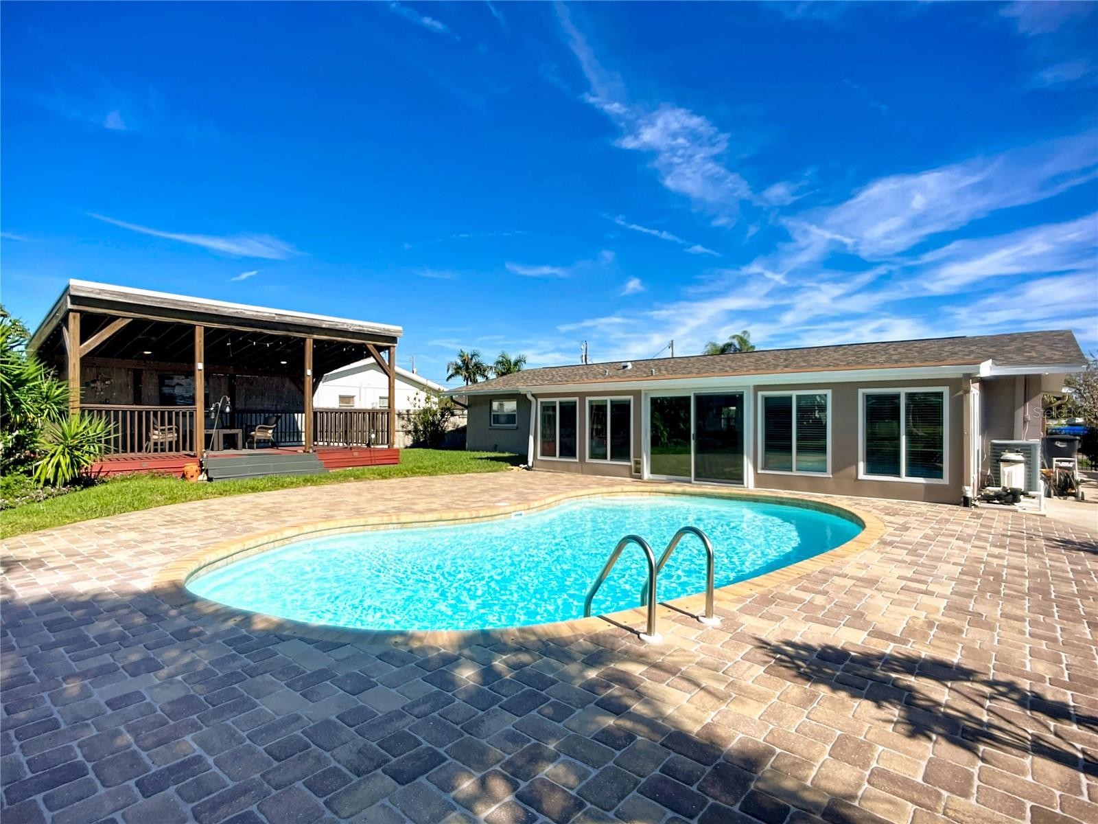 Enjoy your private Florida paradise with all of the conveniences nearby. The large backyard with pool and covered gazebo are enough to allow you to escape into the Florida sun. The deck pavers were recently reset sealed, the backyard was leveled, raised in elevation and resodded. A new 4inch pool drain was put in along with gutters around the house. Yard is irrigated via a well that has had the well pump recently replaced. All interior freshly painted. Both bathrooms updated/remodeled. Enjoy the large family room/Florida room. It has hurricane windows and steps right outside onto the pool deck. No carpet, all tile and vinyl throughout the home. Roof 2017, AC2017, WH 2024, Garage opener 2025, sprinkler well pump 2025. This home is ready for you to move right in and start enjoying your daily swims and Florida living! Close to shopping, restaurants, and beaches.