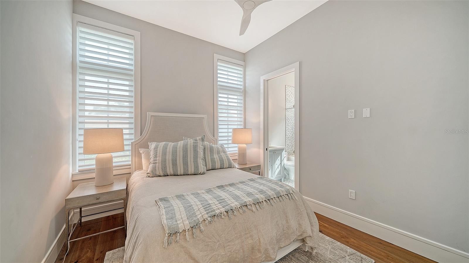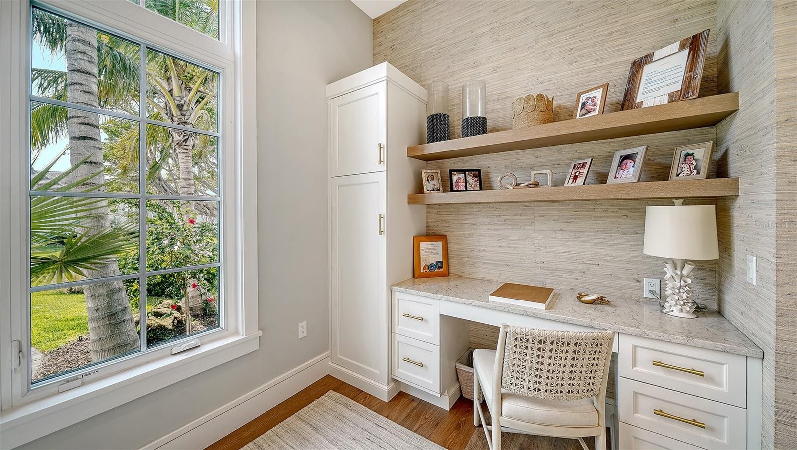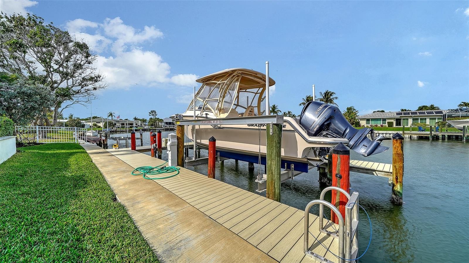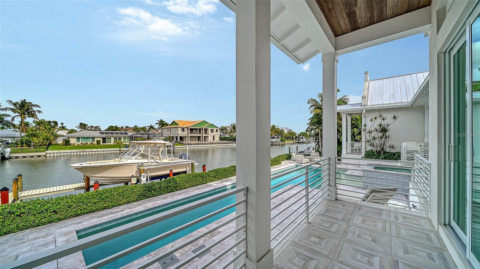 Welcome to a crisp & clean Florida ranch. Located in popular Emerald Harbor which is a bayside enclave of just 82 homes. Homes are located on broad lagoon-style canals that provide direct boating access to Sarasota Bay. 20 ft. private Beach access is a real bonus for sunworshippers. This 3 bedroom 3.5 bath custom home blends Dutch Cape and West Indies architectural style. It is a split design with the primary bedroom and office at one end of a large great room and two guest ensuites on the other end. The resulting clean lined design is resplendent with light. The open kitchen is without walls to design the space. Towering over the KitchenAid gas range is a custom-built plaster range hood. The primary bedroom features a vaulted pyramid cypress ceiling which enhances the beauty of the home. The primary bath features porcelain Calacatta tiles which adds to the floors of this light filled bathroom A terraced backyard takes outdoor living to a new level. There is an outdoor kitchen, fireplace, fire pit and a raised jacuzzi taking advantage of the water views. It's a real plus. The outdoor kitchen with grill has a dining area and a seating area with wood burning fireplace. The outdoor terrace runs the length of the terrace above mimicking the interior layout. The home is nicely landscaped with mature palm trees and lush tropical vegetation. New seawall (2024) with boat lift which is engineered to lift and store your vessel high above any rough waters--This Jewel is a must see!