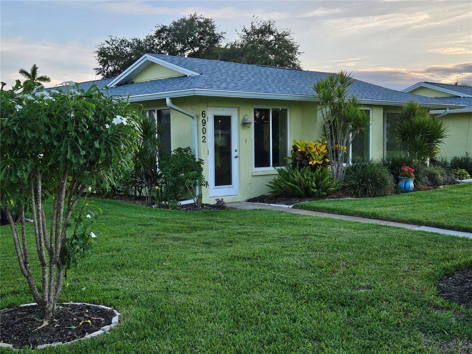 Well-maintained and beautifully updated 2-bedroom, 2-bath Florida villa with a 1-car garage, located in the highly desirable Village Green community near Anna Maria Island. This light-filled home offers a modern Florida feel and is in excellent condition, standing out from many comparable villas in the area. The spacious, open-concept kitchen features custom wood cabinetry with soft-close drawers, a tray ceiling with recessed lighting, solid granite countertops, and stainless steel appliances—perfect for both everyday living and entertaining. From the kitchen, you can see the living room, dining area, den, and Florida room, all filled with abundant natural light. High-impact hurricane windows throughout provide exceptional storm protection, energy efficiency, quiet comfort, and peace of mind. Luxury vinyl flooring flows through the main living areas, while porcelain tile accents the bathrooms, office, Florida room, and a large, functional utility room; both generously sized bedrooms are carpeted. Major updates include a new shingle roof (2023) and heat pump A/C (2022). The community pool is just steps away behind the villa and is part of an active, friendly neighborhood where residents enjoy getting together and embracing the Florida lifestyle. Conveniently located near shopping, dining, hospitals, parks, walking trails, and just minutes from the world-famous sandy beaches of Anna Maria Island, this move-in-ready Florida villa is an exceptional opportunity to call home.
