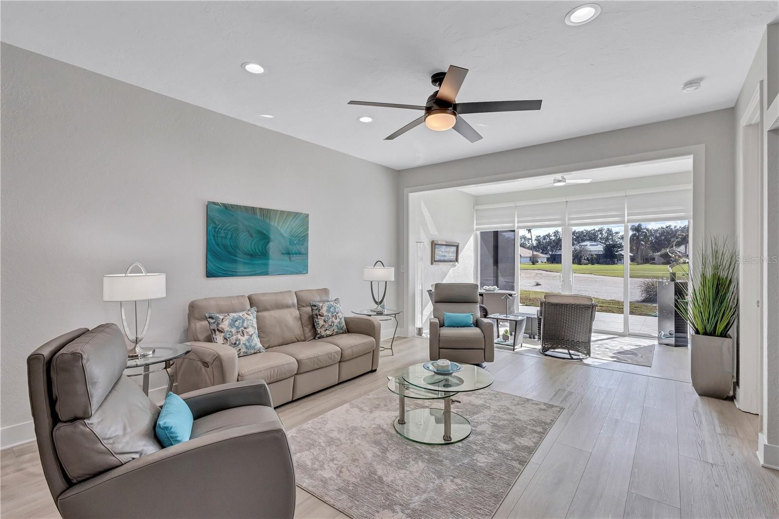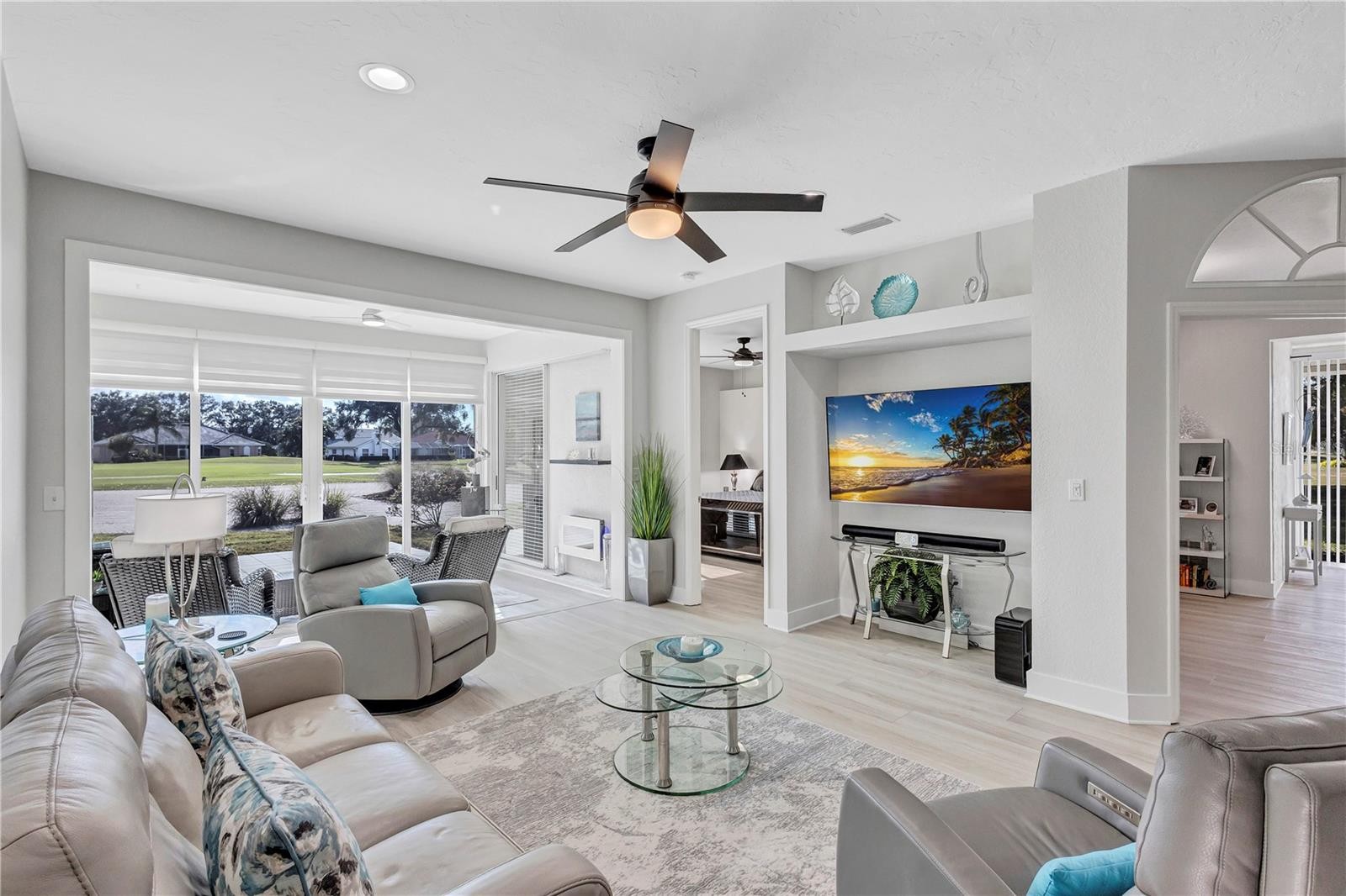 Stop! In the Name of Love, because you are going to love this maintenance-free Villa that has stunning golf course views and is perfectly positioned along a large tranquil lake in the Stoneywalk Association of TGCC. Walls have been taken down so you walk into an open floor plan flooded with natural light, Eat-in kitchen has been updated with newer cabinets, counters and Samsung appliances. Living room/Dining Room flows into an extended lanai area that has been glassed in with floor to ceiling sliders, screens, and power blinds.. Two bedrooms and a den. Den has additional niche with glass sliders, which overlook a private yard and views of the golf course. Primary bedroom is its own private sanctuary with extraordinary views, an en-suite updated bath with walk-in shower and walk-in closet. Split floor plan has the second bedroom in the front of the villa with a full remodeled bath with shower and tub. The home was remodeled in 2025 with new luxury vinyl plank flooring, all plumbing in the floor was removed and re-directed through the walls, new paint, new Hot water tank, new garage door opener, new pull down aluminum stairs to attic, new utility tub in garage, new faucets, and door handles throughout, new lighting in Primary closet and utility room. Two car attached garage, extra long driveway. Screened enclosure can be added to the back patio space (15 x 12) Located on the ninth hole of Tara Golf and Country Clubs Championship Private Golf course. Comes with a Class A membership, golf, tennis, full fitness center, bocce, Pickle Ball, clubhouse dining and endless activities, community pools. are all included in this full Florida active lifestyle. Stoneywalk Villas have a private community pool for the residents. New Pickle Ball facility, with 5 courts, is across the street from the Stoneywalk Villas. Tara Golf and Country Club is a private, bundled golf community in a fabulous location. Close to shopping, dining, highways, airports and the best beaches on the east coast of Florida, Welcome to Taradise!