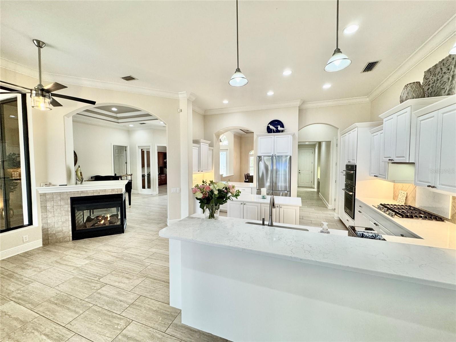 Arthur Rutenberg masterpiece – The St. Vincent II model – offers the best in Florida luxury living. Welcome to "The Dominion" in the gates of Lakewood Ranch Country Club.Perfectly situated on a premier homesite with breathtaking views of the golf course and glistening lakes, this "like new" 5 bedroom, 4 full bath, 2 office, is move in ready and even has a spacious upstairs bonus room, private guest suite, and covered balcony that overlooks the golf course and pool. This home provides the ideal blend of space, elegance, and function. The thoughtfully designed floor plan includes a newly updated chef’s kitchen with Quartz counters, high-end appliances, solid Wood Cabinetry & built-in pantry, and an open layout with beautiful outdoor views that flow through the Gathering Room. Architectural details abound: the stately exterior beckons you inside to take in the intricate crown molding, high tray ceilings and built-in features. The executive office located in the front of the home is spacious with built-in work space, cabinetry and is full of natural light. The secondary office/flex room (with full closet) is located at the rear of the home overlooking the golf course, and sliding glass doors open onto the pool deck. High decorative ceilings throughout create a sense of timeless sophistication. The primary suite is conveniently located on the main floor in its own private wing. With high ceilings, access to the pool and lanai area, this suite will accommodate large estate furnishing in style. Dual walk-in closets, and a luxurious and recently updated bath with a large walk-in shower, garden tub, and private water closet with bidet, round out the primary suite. Step outside to your private saltwater pool and spa oasis, surrounded by lovely paving brick, and unwind under the covered lanai or in the cabana with a fully equipped modern summer kitchen—perfectly designed for year-round entertaining. The circular drive, side-entry garage, and dual 220V EV charging stations add modern convenience as well as curb appeal. RECENT UPDATES: travertine-style porcelain tile, luxury vinyl plank flooring, new countertops throughout (except office), newer appliances including dishwasher, refrigerator, oven, cooktop, and dual-function microwave, front loading washer&dryer, All 3 AC units replaced with high-efficiency filter systems, and a 24KW natural gas Generac Whole House Generator keeps everything running during power outages, updated security system, recently refinished wood ceilings and freshly painted cabinetry (excluding office), along with an upgraded outdoor grill and hood. 2025 Roof inspection report available. Windows are rated for 130mph wind loads. Resort-style living with an optional membership to The Lakewood Ranch Country Club—offering 4 championship golf courses, 3 luxurious clubhouses, 18 Har-Tru tennis courts, pickleball, state-of-the-art fitness and aquatic centers, walking trails, and many social events. With no waitlist and optional membership, the choice is yours. Situated near high-rated schools, premier medical facilities, parks, shopping, dining, and just minutes to Gulf Coast beaches, this property represents a lifestyle of luxury. Schedule your private showing today! **THIS PROPERTY QUALIFIES FOR A 1% LENDER INCENTIVE IF USING PREFERRED LENDER. INQUIRE FOR MORE DETAILS.**