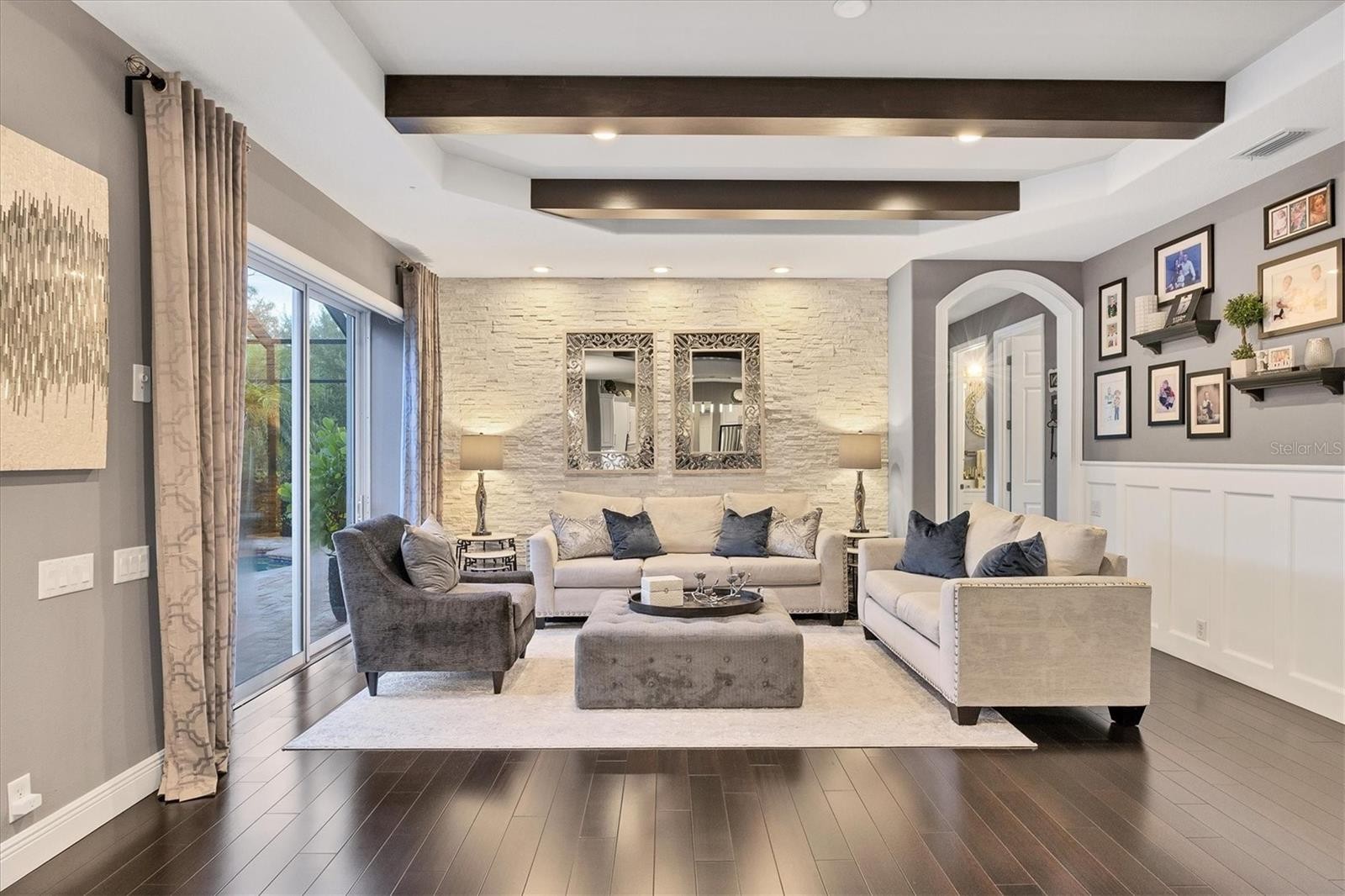 On a private cul-de-sac next to a quiet park within the exclusive, gated enclave of Lakewood Ranch Country Club, this stunning five-bedroom estate offers nearly 6,000 square feet of updated, luxury living designed for grand entertaining and everyday comfort. A beautifully manicured lawn, circular driveway, and striking fountain set the stage as you approach the stately double-door entry. Go inside to an impressive foyer, where 36-by-36-inch porcelain tile laid on the diagonal sets the tone. Soaring tray ceilings, dramatic stone accents, a warm gas fireplace, and rich wood floors flow seamlessly throughout the main living spaces. To the right, an elegant formal dining room is appointed for dinner parties, while to the left, a private office framed by double glass doors provides an ideal retreat. At the heart of the residence, the open kitchen and family room create an inviting gathering space. The chef’s kitchen is appointed with professional-grade appliances, a six-burner gas stovetop, granite counters, prep island, breakfast bar and large walk in pantry. A spacious eat-in nook comfortably accommodates family meals, while the family room showcases stone feature walls, wood-beamed tray ceilings, and expansive sliding glass doors that invite the outdoors in. The primary suite is a luxurious retreat, with tall ceilings, sliding glass doors that open to the lanai and two expansive custom walk-in closets. The en-suite bath is equally impressive, featuring a deep soaking tub, oversized walk-in shower and split vanities—one thoughtfully designed with a vanity area—blending beauty and function for daily living. The first floor also hosts a thoughtfully designed bedroom layout, including two bedrooms with a shared Jack and Jill bath, and a large bonus room that can serve as an additional bedroom or flex space. An adjacent bedroom features a generously sized walk-in closet and shares a full bath, ensuring comfort for family and guests alike. Upstairs, a bonus loft with its own summer kitchen and covered lanai extends the entertainment space, complemented by a dedicated media room for movie nights. An additional bedroom and a versatile room—ideal as a second office, bedroom or lounge—that opens to the upstairs lanai, complete the upper level. Go outside to your private paradise, where a resort-style pool and spa are surrounded by a spacious lanai with ample lounging and dining areas. A full outdoor kitchen elevates alfresco living. This exceptional residence offers abundant space for family and guests, an entertainer’s flow, and the finest details of luxury living such as side-facing garages with ample space for four cars and storage as well as a convenient drop zone just inside to keep belongings tidy. As a resident of Lakewood Ranch Country Club, you’ll enjoy access to a prestigious, planned community known for its world-class amenities and vibrant social life. The private country club offers three championship golf courses, tennis and pickleball courts, a state-of-the-art fitness center, resort-style pools and fine dining venues. Miles of walking trails, lush preserves and beautifully landscaped grounds provide a serene backdrop, while Lakewood Ranch Main Street and Waterside Place offer boutique shopping, dining and cultural events just minutes away.
