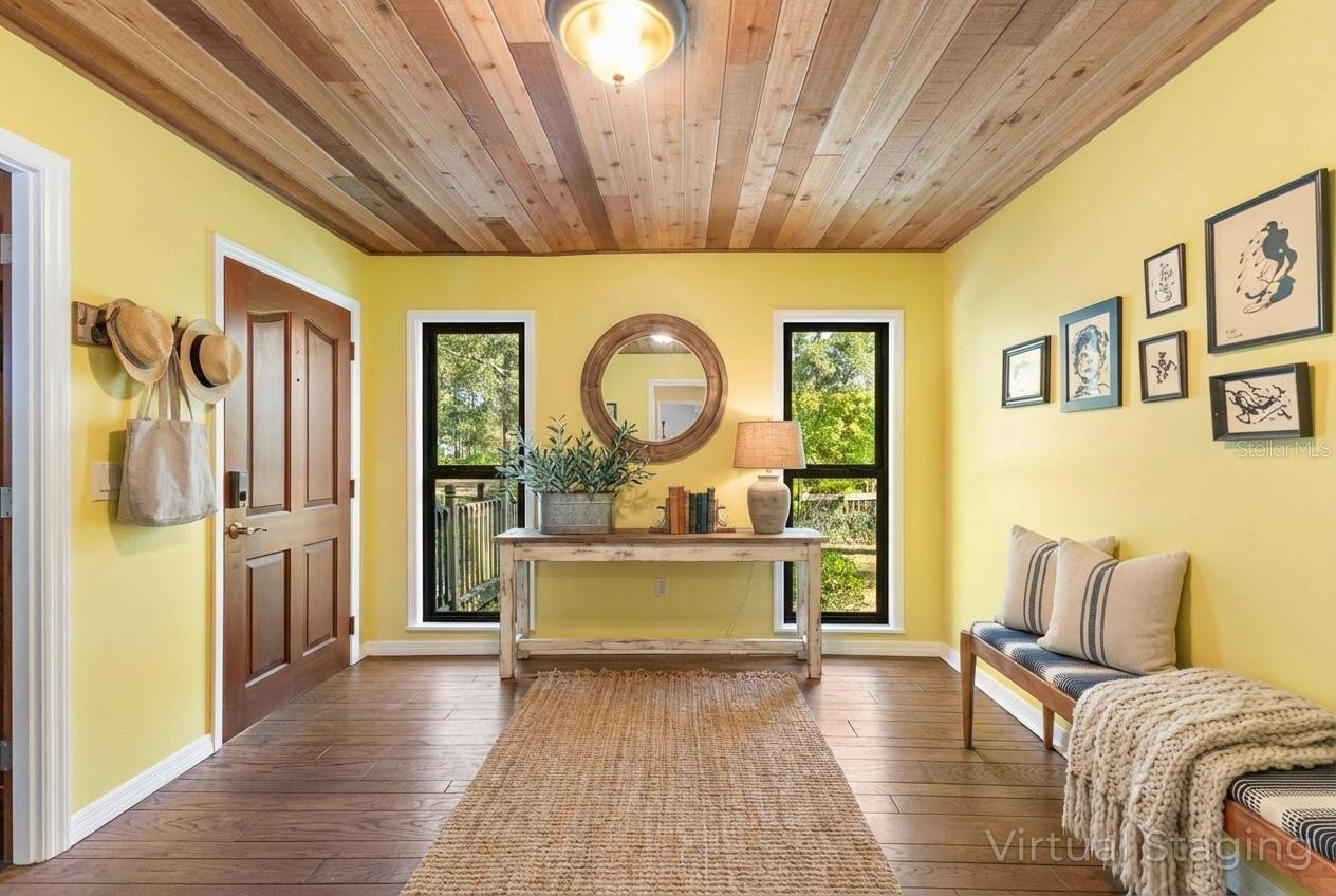 LOCATION/LOCATION/LOCATION! This exceptional estate is set on more than five fully fenced acres of beautifully manicured, lush grounds. Tucked away you will enter through a winding, tree-canopied driveway. Welcome to “The Ranch at Pine Acres ” a five-bedroom residence, where complete privacy and peaceful natural surroundings create a country feel. Delight in the endless possibilities of this private home in Pine Valley Ranches. This hidden gem is perfectly positioned on the most desirable 5 acre lot in this exclusive community, offering the perfect balance of tranquil country living and easy access to I75, Sarasota’s downtown, University Town Center, Waterside, and the renowned Gulf beaches. The main home offers nearly 4,000 square feet of professionally designed living space, with expansive views from every window of this private estate. This unique property is move-in ready. Recent upgrades include a new metal roof on both the home and barn, pavered walkways and patio, wood and Trex decking, a large saltwater pool, three air-conditioning systems. Impact windows and French doors throughout offer abundant natural light with cedar plank tongue-and-groove vaulted ceilings. At the heart of the home, the gourmet kitchen flows seamlessly into the formal dining room and is open to the oversized great room that has a beautiful wood-burning fireplace with specialty coquina stone. Designed for both function and style, the kitchen showcases rich 5/4" cherry cabinetry with under-cabinet lighting, multiple copper farm house sinks, imported granite countertops, Mulga White Turkish marble backsplash extending to the ceiling, built-in appliances including a cabinet-faced KitchenAid refrigerator, Miele built-in oven, THOR induction cooktop, Bosch dishwasher, GE infrared microwave and an exceptionally spacious butler’s pantry with even more storage. A large multipurpose room with laundry area provides flexible space for a playroom, office, or additional family room or storage. The generous primary suite overlooks the front picturesque grounds with its private balcony/deck. This second-level retreat features a luxurious Indian Rainforest marble bathroom fully equipped with soaking tub and large shower, dual walk-in closets and beautiful oak floors. A second two room suite completes the upper level. Adjacent flex space is ideal for an office, playroom, or additional bedroom overlooking the trees of “The Ranch at Pine Acres ”. Three additional bedrooms are located on the first floor, offering comfortable accommodations for a large family and/or guests. Attached 3 car oversized garage with a hurricane room and RV hookup. Adding to the property’s versatility is a massive, detached barn featuring a horse stalls, workshop, tack room, generous storage space, two more RV hookups, and a surrounding horse paddock—ideal for equestrian use, recreational vehicles, or additional storage. A Sarasota premier location...where private acreage meets the charm of country life... yet right in Sarasota!