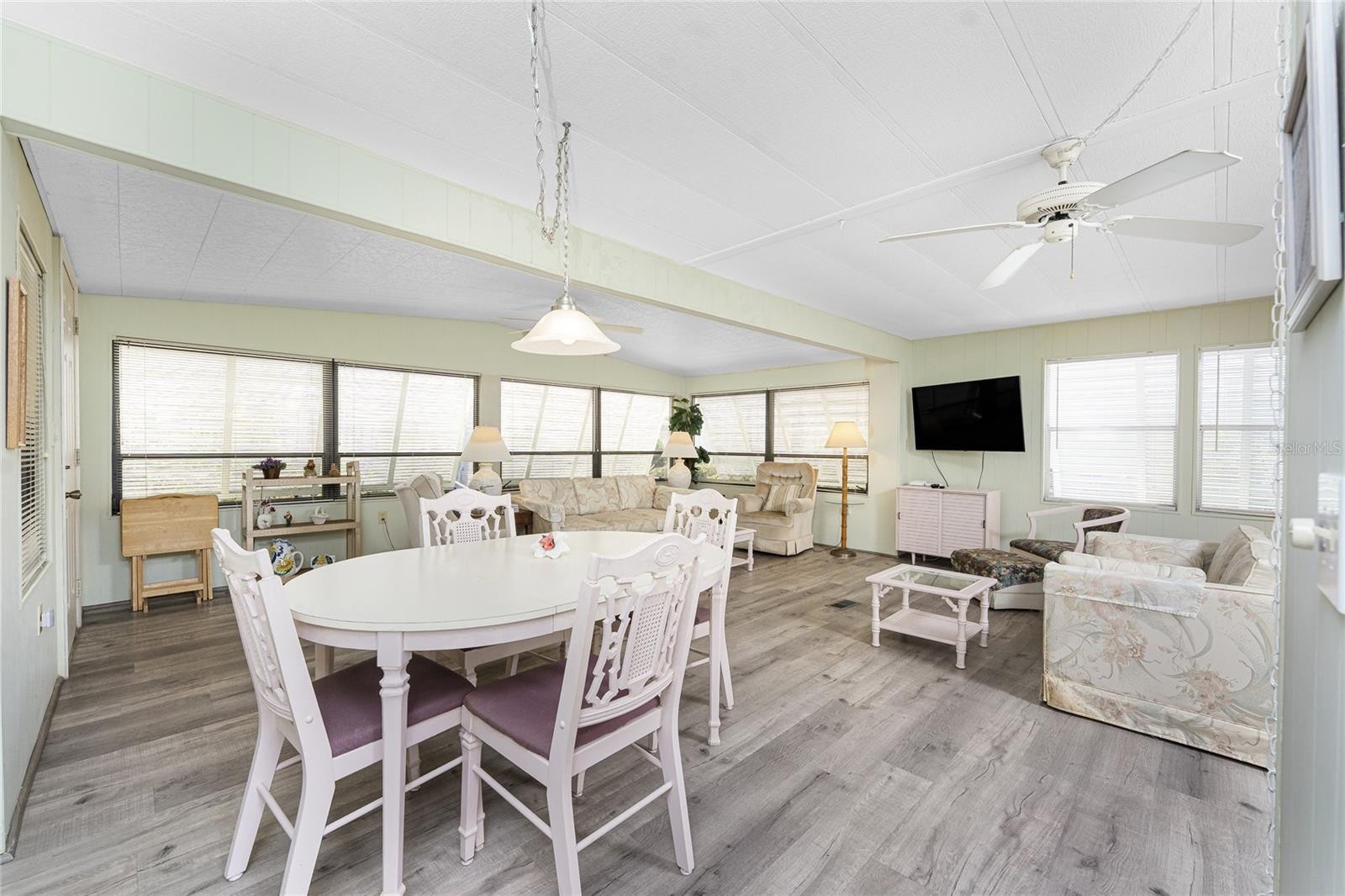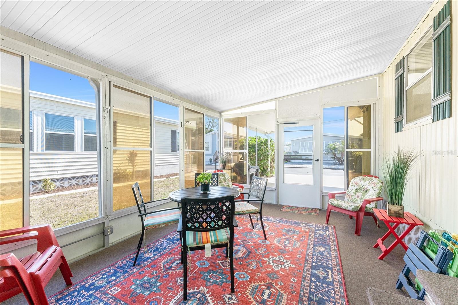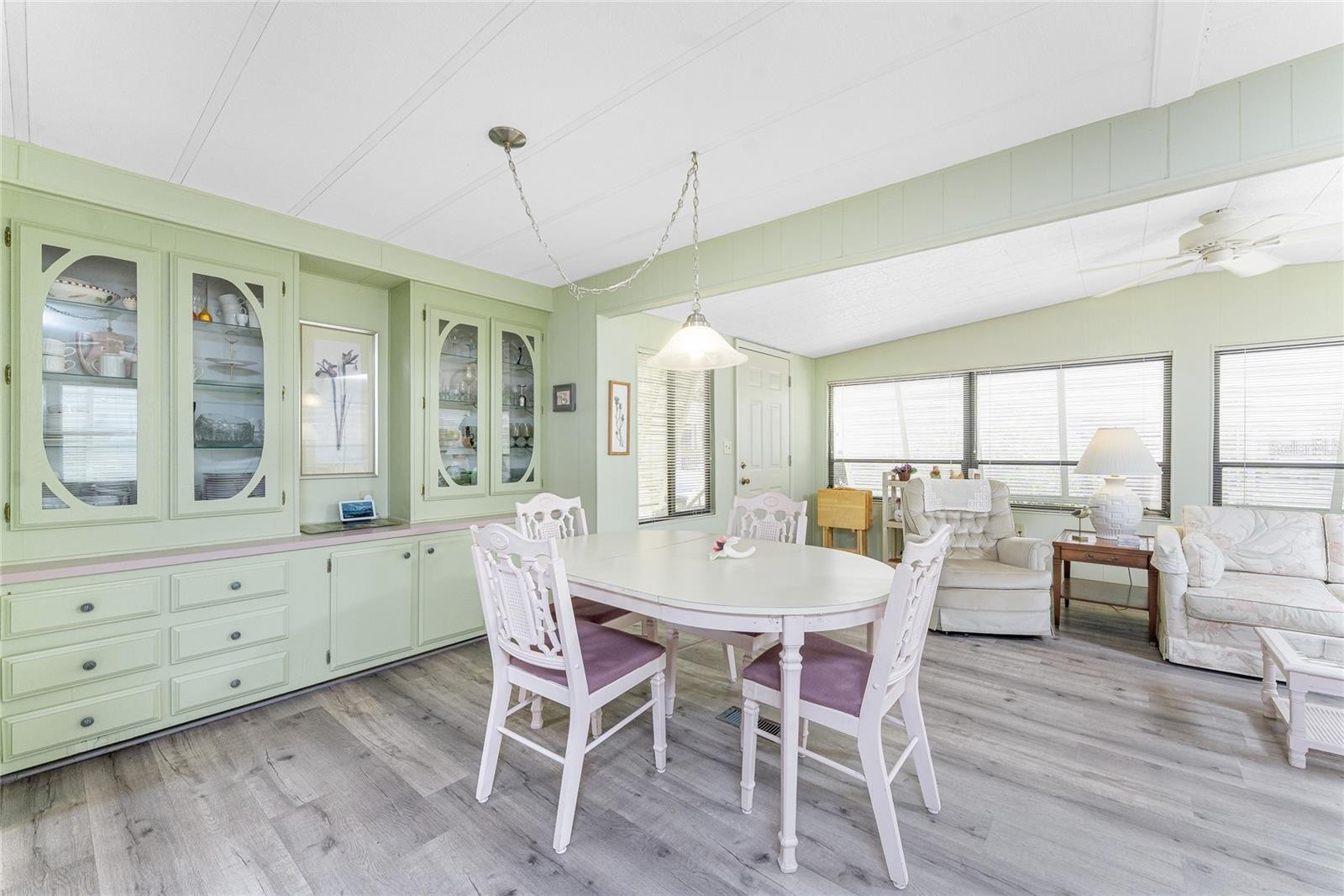 Why shovel snow this winter when you can be basking in the sunshine in Englewood, Florida? Move right in to this clean and neat FULLY FURNISHED TURNKEY two bedroom two bath manufactured home in Alameda Isles! All new laminate flooring throughout makes maintenance a breeze, plus the underlayment was all replaced with 3/4" plywood! The open plan living/dining area features updating lighting, ceiling fan, & built in china cabinet and plenty of room for entertaining. Galley kitchen has an LG refrigerator (1 yr old), Whirlpool smooth top stove (2 yrs old), Frigidaire dishwasher (3 yrs old), and built in microwave. There's also a breakfast bar and closet pantry! Primary bedroom has both a wall and a walk in closet and ensuite bath, which has a step in shower w/door. The Guest Bedroom will be so inviting the guests may want to stay longer, and has a wall closet and ceiling fan also. The Guest Bath has a combo tub/shower and newer toilet. The favorite area will be the FLORIDA ROOM - with the vinyl windows, this area is usable year round. The laundry hookups are in the attached storage room, and there's another separate storage area in the rear. Weather Lock insulated aluminum roof over was installed in 2014, AC is 10 years old and has been regularly maintained, exterior has been repainted, and home has been replumbed. There are even 2 kayaks that will remain! This is a very vibrant active community with pickleball, heated swimming pool, clubhouse, sauna, exercise room, tennis, bocce ball, shuffleboard and activities to suit anyone! Alameda Isles has a 59 slip marina and RV/boat storage area for an additional fee, plus the community has activities and amenities galore! The community itself has a great location, just minutes to area beaches, shopping, restautants and anything you may need! This is a well priced home - don't wait to see it!