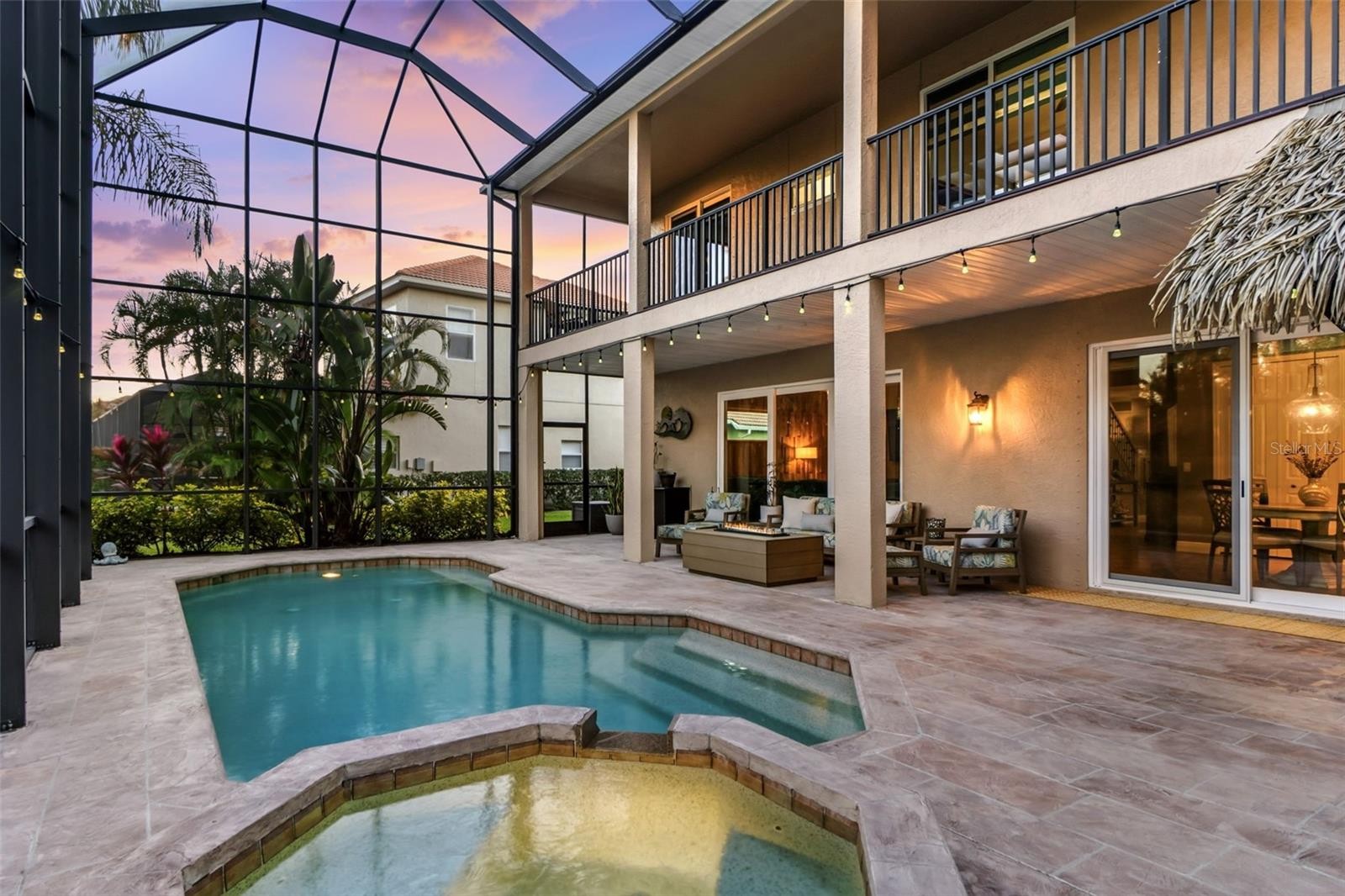 Spectacular estate home offering the perfect blend of privacy, luxury, and serene living in the highly desirable gated community of Red Hawk Reserve. This elegant 3,847-square-foot, five-bedroom residence features a thoughtfully designed and flexible floor plan enhanced by 8-foot doors, crown molding, and refined architectural details throughout. The gourmet kitchen is beautifully appointed with induction cooktop, designer cabinetry, Quartz countertops, a center island, double pantries, and a bright eat-in area overlooking the pool. Formal dining and a spacious family room adjoin the kitchen, creating an ideal setting for entertaining and everyday living. The luxurious primary suite offers a private sitting area, abundant natural light, and generous his-and-hers closets. The spa-inspired primary bath includes dual vanities, a Roman-style walk-in shower, and a dramatic soaking tub. A large media/bonus room provides the perfect space for a home theater or game room. Three additional bedrooms are located upstairs, along with the convenience of a second-floor laundry room. Outdoor living is elevated with a resort-style oasis featuring a soaring two-story screened enclosure, heated pool and spa, and a custom Tiki-style outdoor kitchen, ideal for year-round Florida enjoyment. An oversized three-car garage offers ample room for vehicles and additional storage. Recent upgrades include impact windows and doors, new roof, new hot water heater, Level 2 EV charger, new pool screen, reverse osmosis kitchen system, new pool salt cell, and a whole-house water softener. The gated community features a state-of-the-art kiosk entry system with high-resolution cameras, audio and video monitoring, and licensed virtual guards. This exceptional home is a must-see.