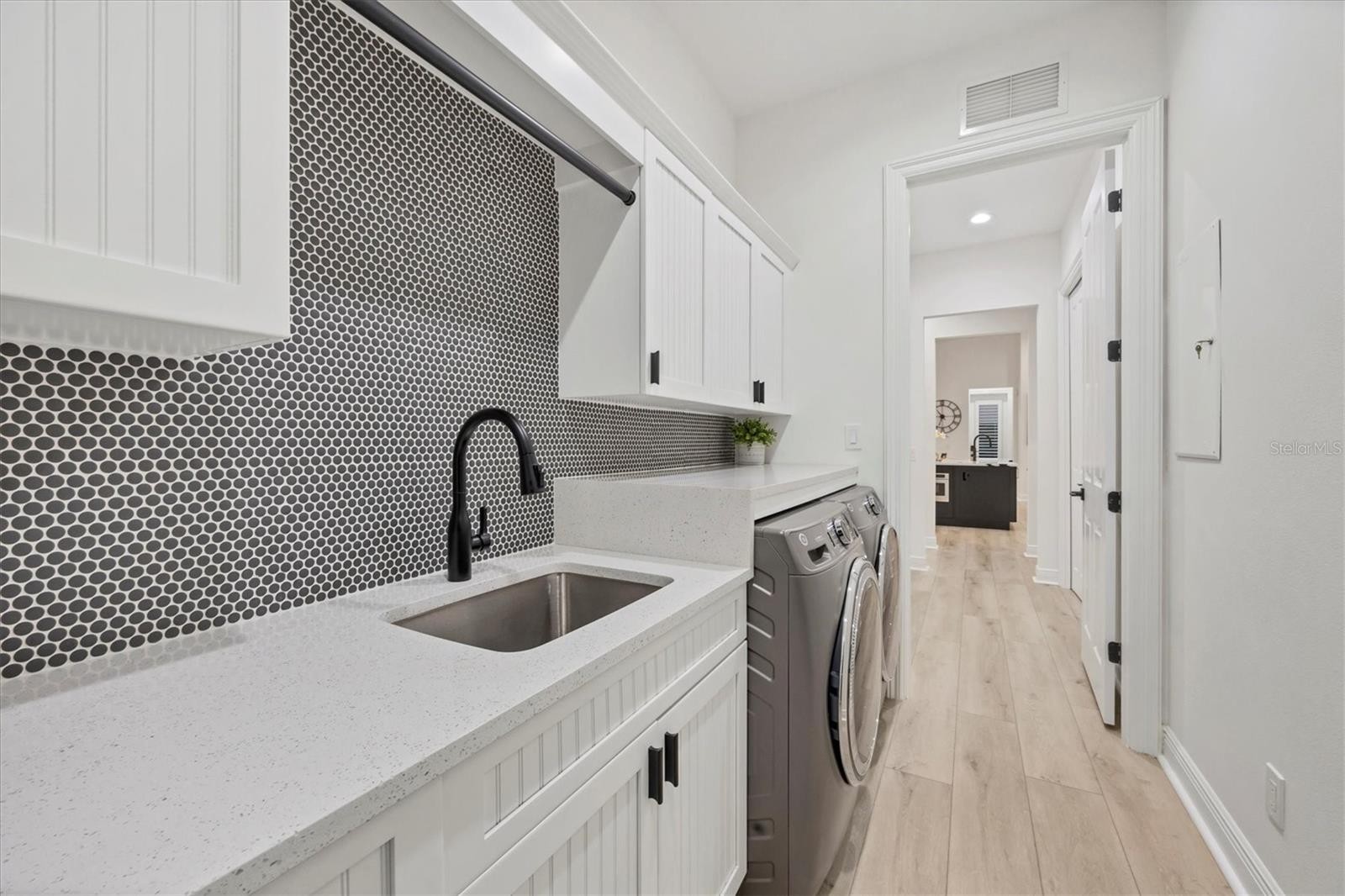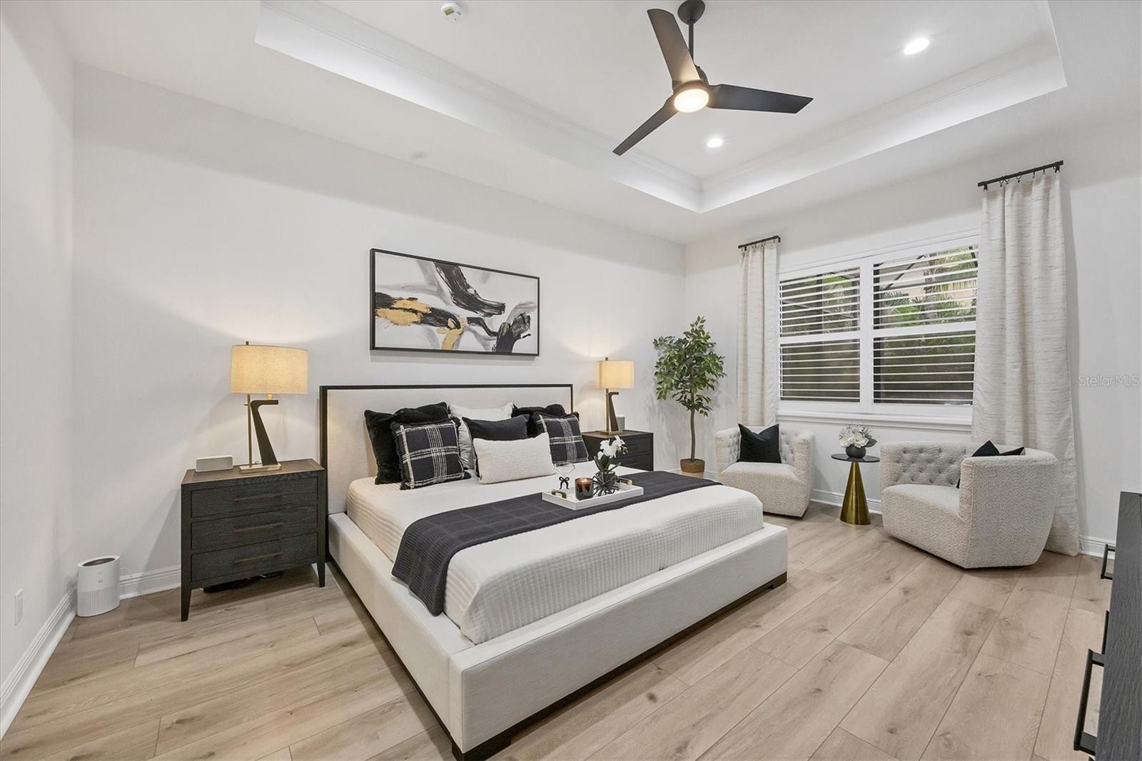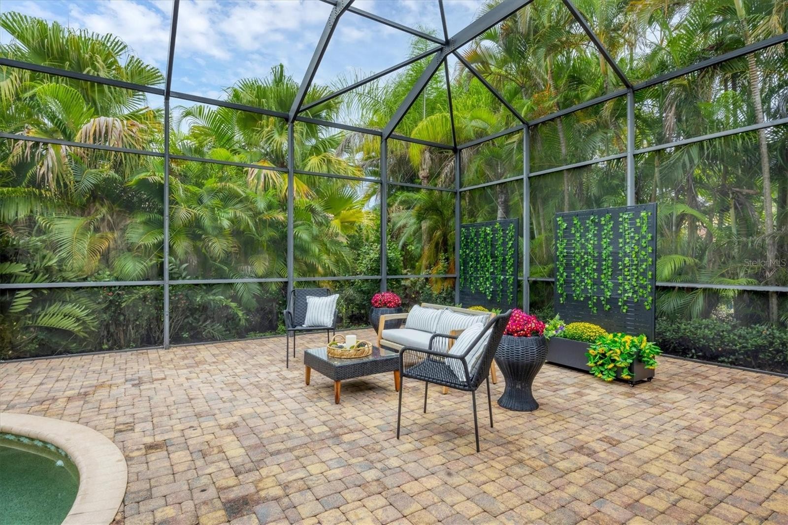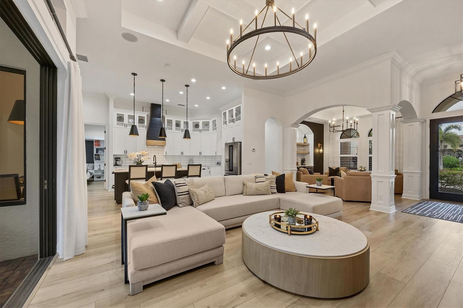Welcome to this stunning, completely remodeled in 2024 residence in the gated maintenance-free area of Lakewood Ranch Country Club. As you step through the impressive double-glass doors of this breathtaking and completely transformed residence, you are greeted by an airy, light-filled ambiance. This luxury three-bedroom home includes three en suites, a den, and a powder room for comfort and convenience. The meticulously renovated home showcases soaring ceilings, an open floor plan and premium upgrades throughout. The grand living room features a custom fireplace wall with a 76-foot linear electric fireplace, 85-inch Samsung smart TV and Sonos soundbar. Faux cement texture, fluted wood accents, shelves and a charming mantle create a contemporary design. A 12-foot coffered ceiling with crown molding and a designer chandelier enhance the space, while the pocket slider extends the living area to the lanai for seamless indoor-outdoor living. The custom wine bar features dual wine refrigerators, custom cabinetry, a stunning accent wall, floating shelves and quartz countertops. The gourmet kitchen includes GE Cafe appliances, white cabinets with glass uppers, black handles, a quartz island and a subway tile backsplash. A hand-crafted Hoodsly hood, porcelain farm sink, and Kohler faucet elevate the kitchen's sophistication. Off the kitchen is a versatile den with double French doors, built-in shelving and a hidden Murphy bed for flexible use. The primary suite boasts a tray ceiling, dual closets and direct pool access. The spa-like bath includes marble porcelain floor tiles, a walk-in rain shower, black-and-gold Pfister hardware, quartz countertops and a standalone soaking tub under a designer chandelier. Each of the two guest bedrooms has its own en-suite bath, with oversized walk-in showers, black-framed glass enclosures, and finishes like gold Moen hardware and quartz countertops. The laundry room features a quartz waterfall countertop and GE Smart washer and dryer, with a penny tile backsplash. Outside, a private tropical sanctuary awaits, with beautiful landscaping creating a secluded retreat. The expansive lanai, surrounded by lush landscaping, includes a sparkling pebble finished pool and spa. Additional details include LED lighting, new plantation shutters, custom closets, luxury plank flooring, freshly painted interiors and all-new hardware. In Lakewood Ranch Golf and Country Club, this home offers resort-style living with optional access to world-class amenities including two practice ranges, four spectacular, award-winning golf courses, two pools, tennis, pickleball, restaurants and more. Don't miss the chance to own this masterpiece in one of Florida's most desirable neighborhoods!