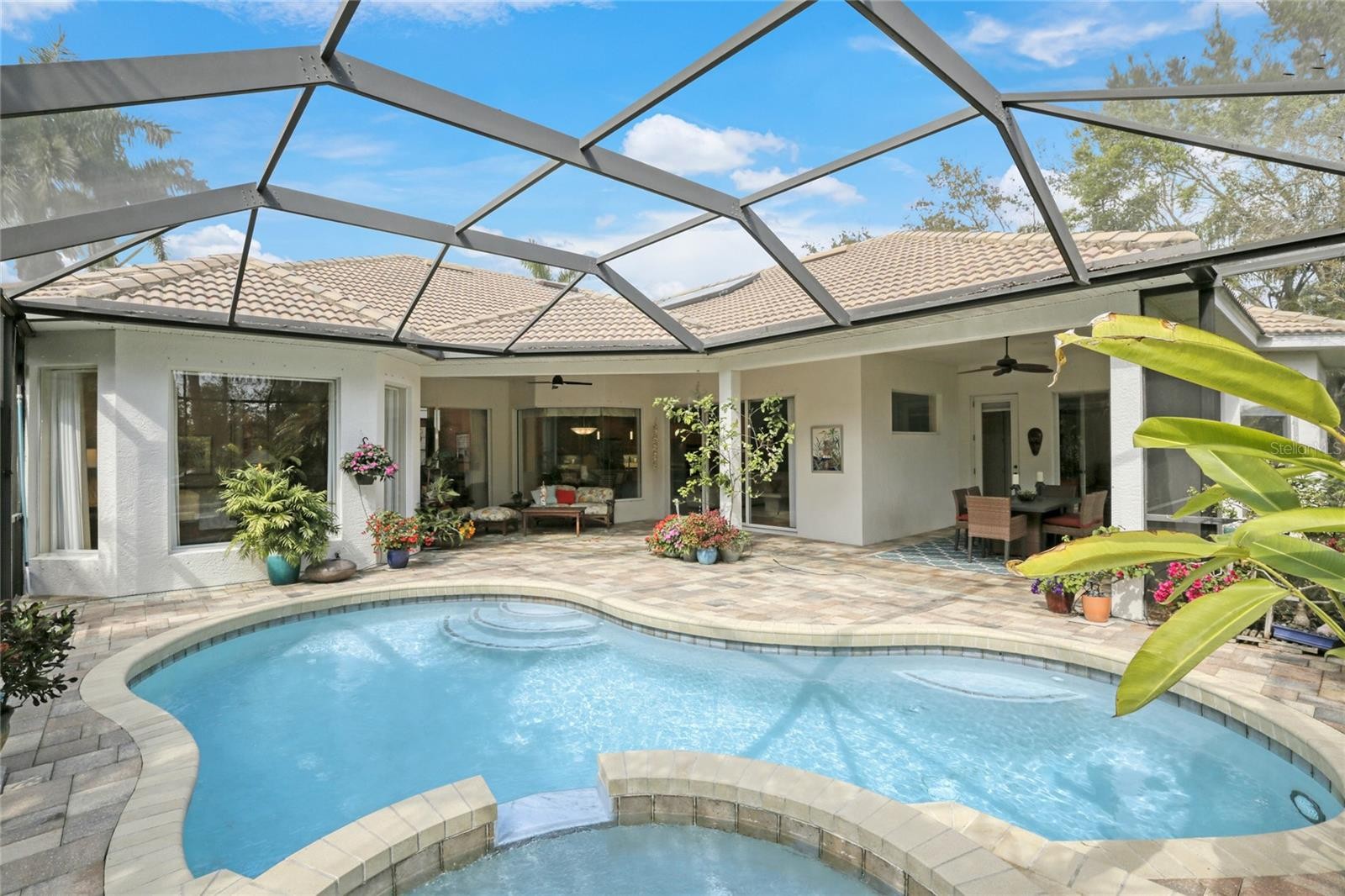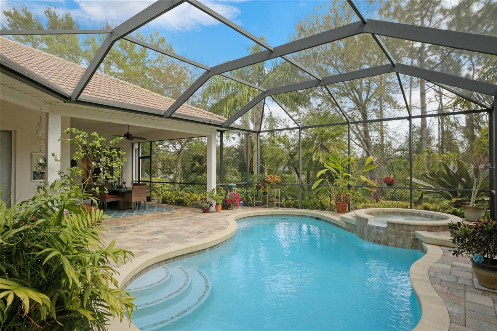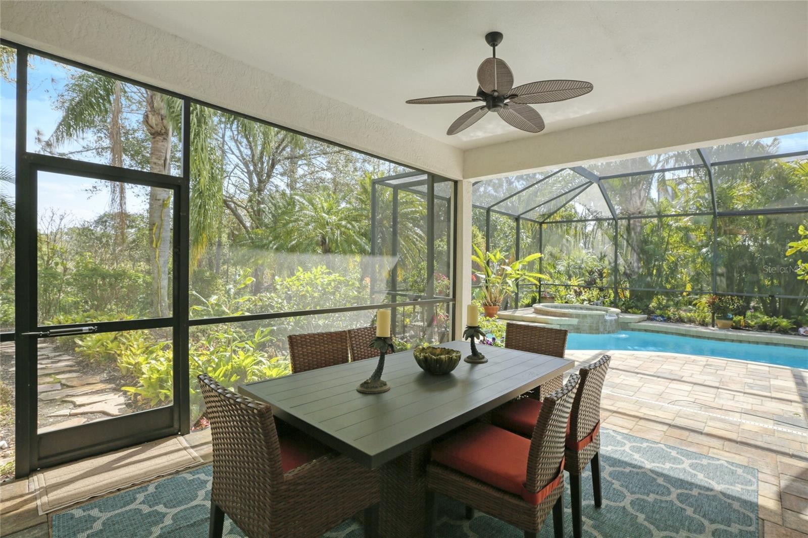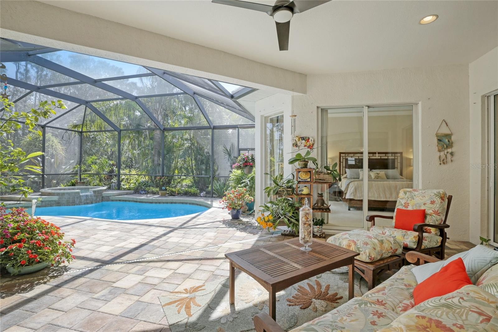 A perfectly poised, tranquil oasis right in your own backyard offers privacy and delight. This gorgeous 4 bedroom, 3 bath, plus den, 3-car garage and over 3,000 of living area is waiting for you. Meticulously cared-for, this home boasts abundant natural light with huge picture windows and 12’ high double tray ceilings. Ideal for entertaining with a beautiful dining room and formal living room that opens up to a private outdoor living retreat. You’ll fall in love with the bamboo flooring, sliders to the lanai, plantation shutters, glass Italian fixtures, custom lighting, and architectural niches throughout. This home also features a full energy-efficient solar system that’s good for the environment and cuts utility bills to a fraction of the cost. The gourmet kitchen features a breakfast nook, glass backsplash, soft-close cabinets, large quartzite island, pull-out drawers, stainless steel appliances and a gas range. The expansive kitchen opens up to the family room and dinette area with picturesque pool views through aquarium glass windows. Enjoy your private outdoor space in the screened lanai surrounded by an array of tropical plants and nature. With plenty of covered space and sun shades, you’ll love relaxing outside in your very own heated pool and spa. The spacious owner's suite features tall ceilings, huge windows, sun blocking drapery, large walk-in closets, custom closets organizers, and stunning paradise views. The en-suite offers two vanities, a makeup vanity, a soaking tub, and a spacious tiled shower. A Jack-N-Jill bath separates 2 more spacious bedrooms with with 8’ doorways and large closets. And if that’s not all, there is an additional 4th private guest suite and bathroom in the back of the home overlooking the stunning landscaping. Red Hawk Reserve is a popular gated community with Low HOA dues, located in an A+ rated school district, Located across the street from Twin Lakes Park which features tennis, pickleball, recreation courts, and minutes to beaches and all the splendor Sarasota has to offer. Experience a virtual interactive 3-D Matterport tour and video. A full pre-listing inspection has been completed on the home for your peace of mind and available upon request.